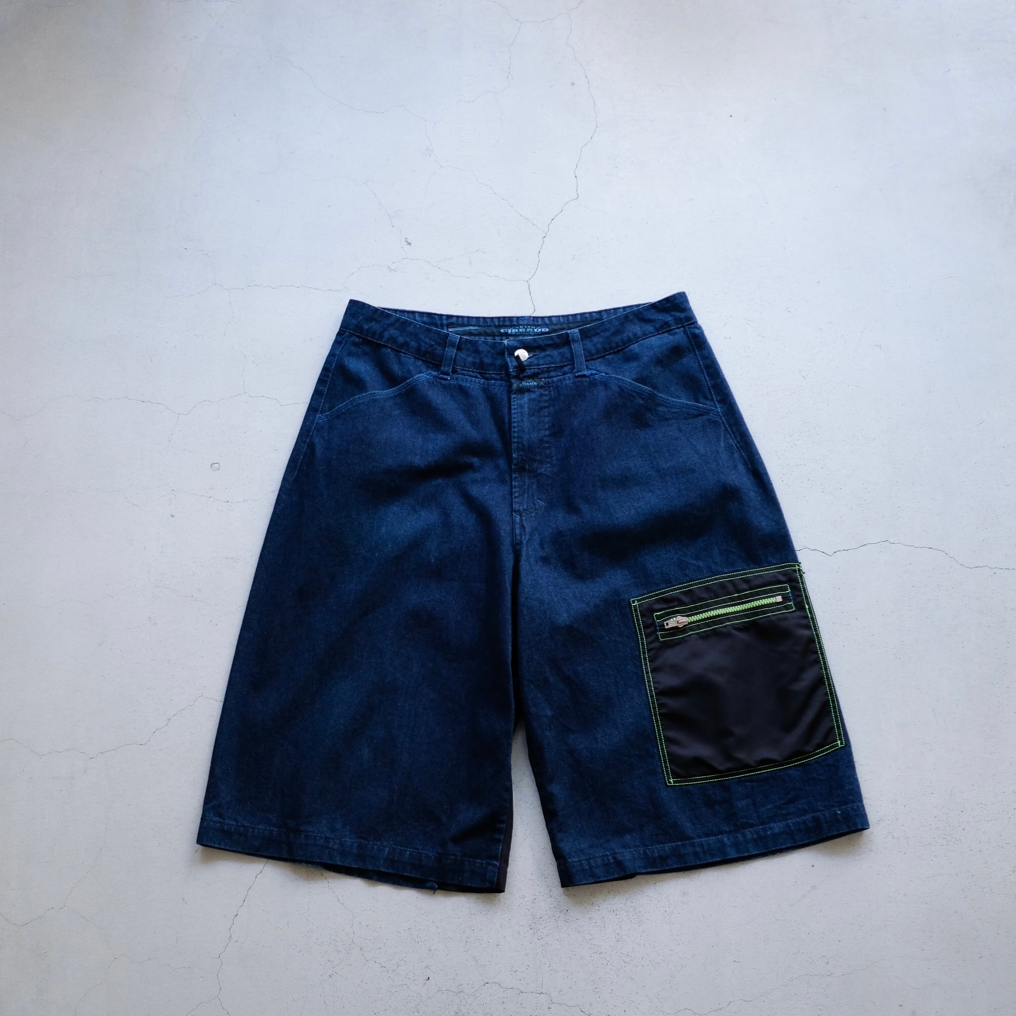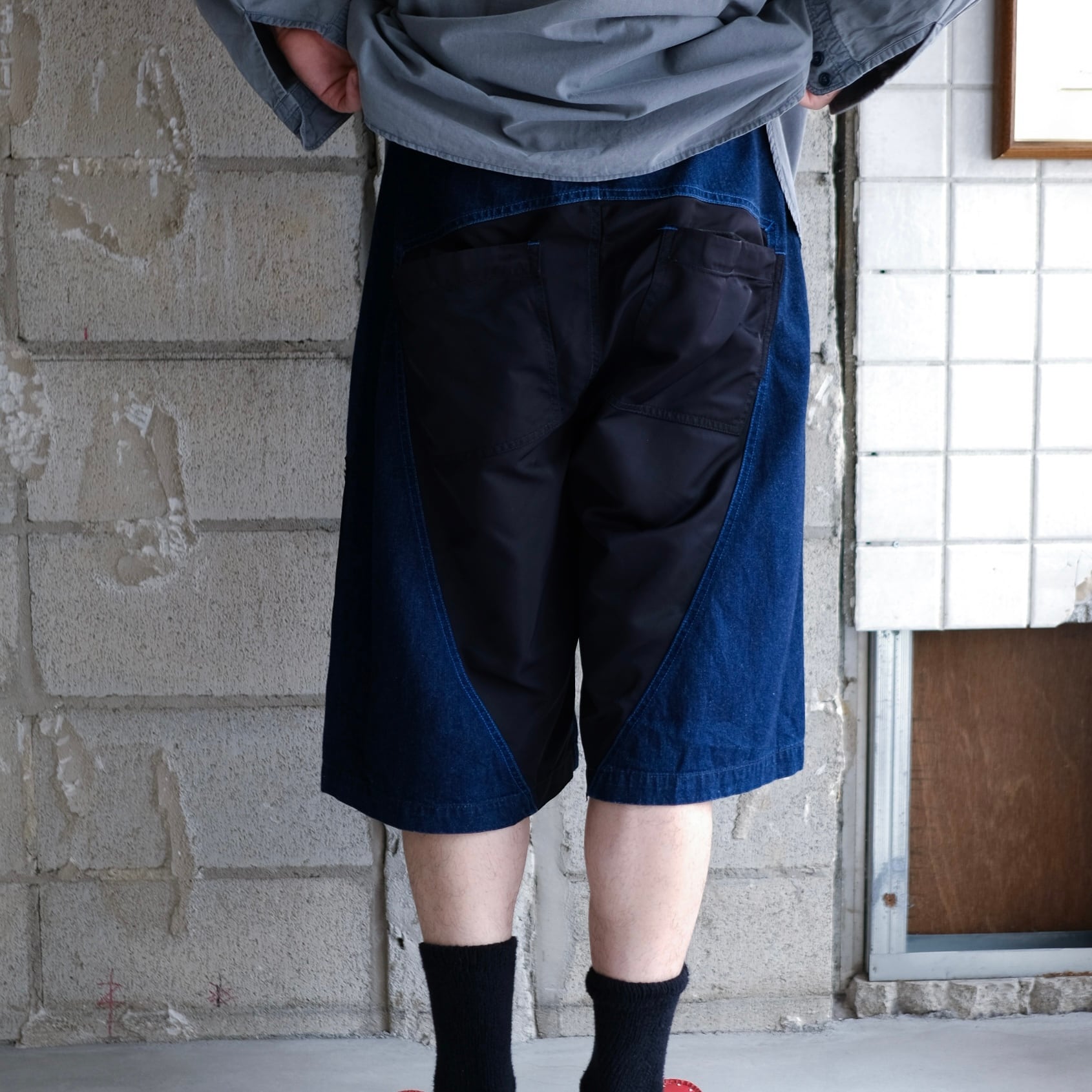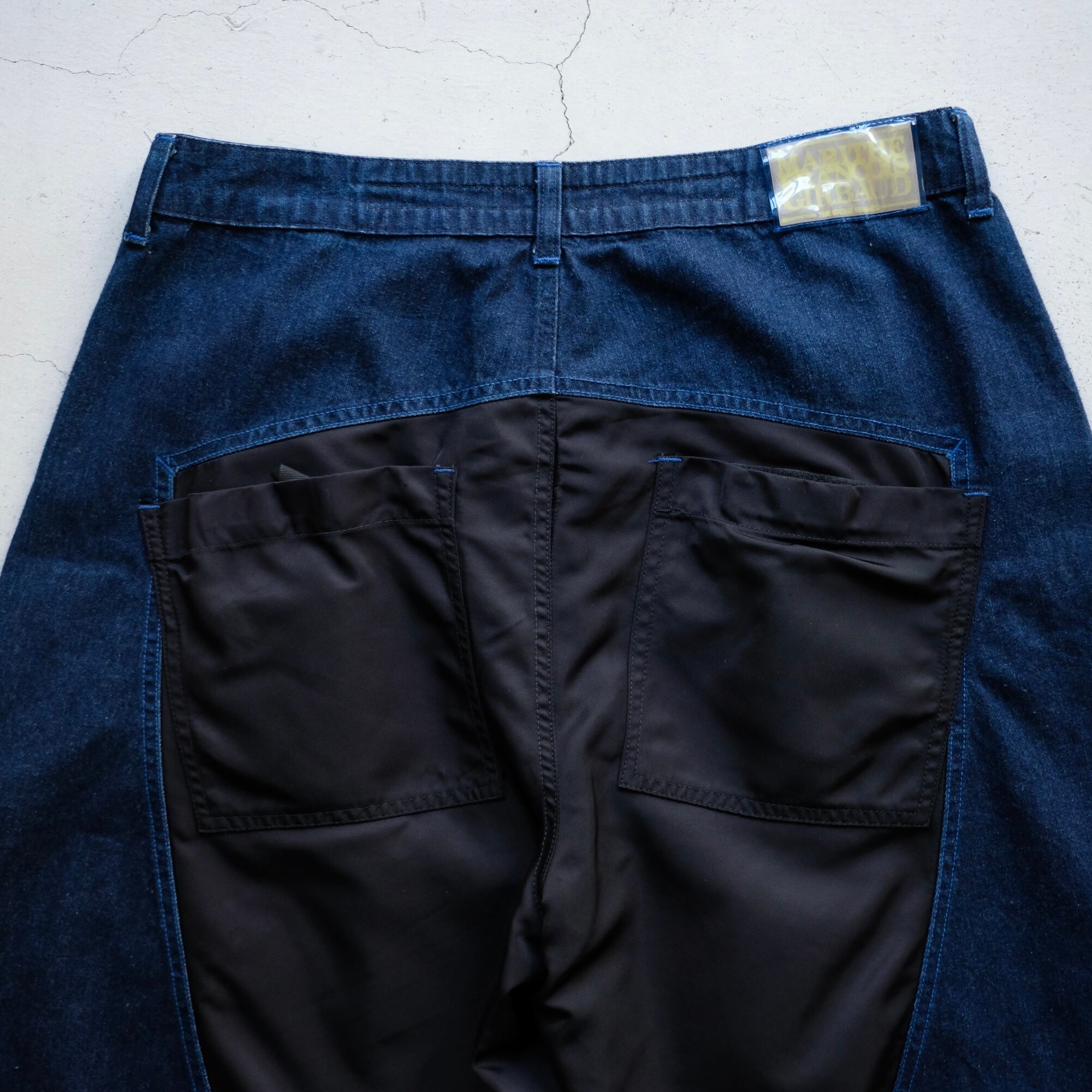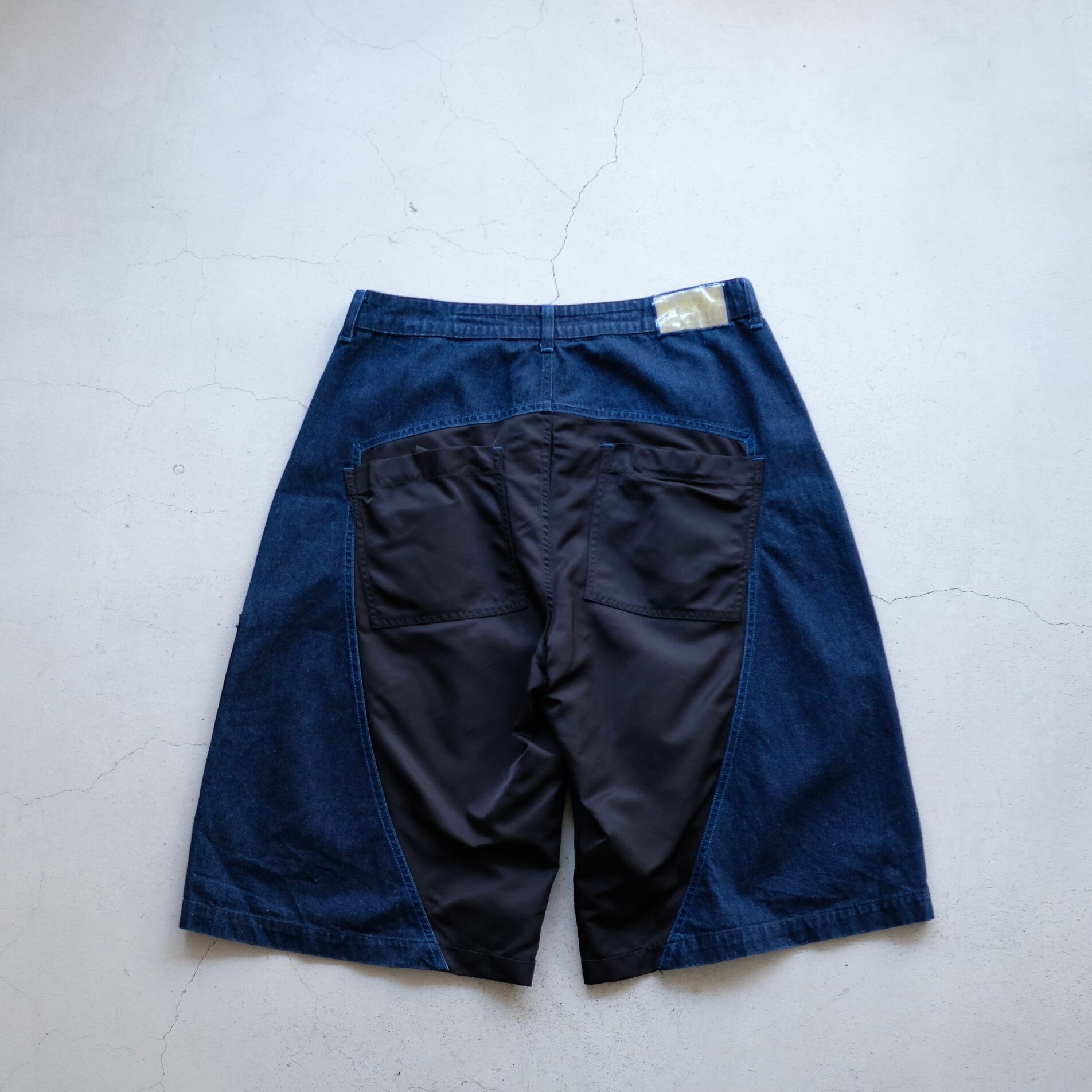 色落ちのしていない深いインディゴのデニム生地とブラックナイロンのコンビネーション。