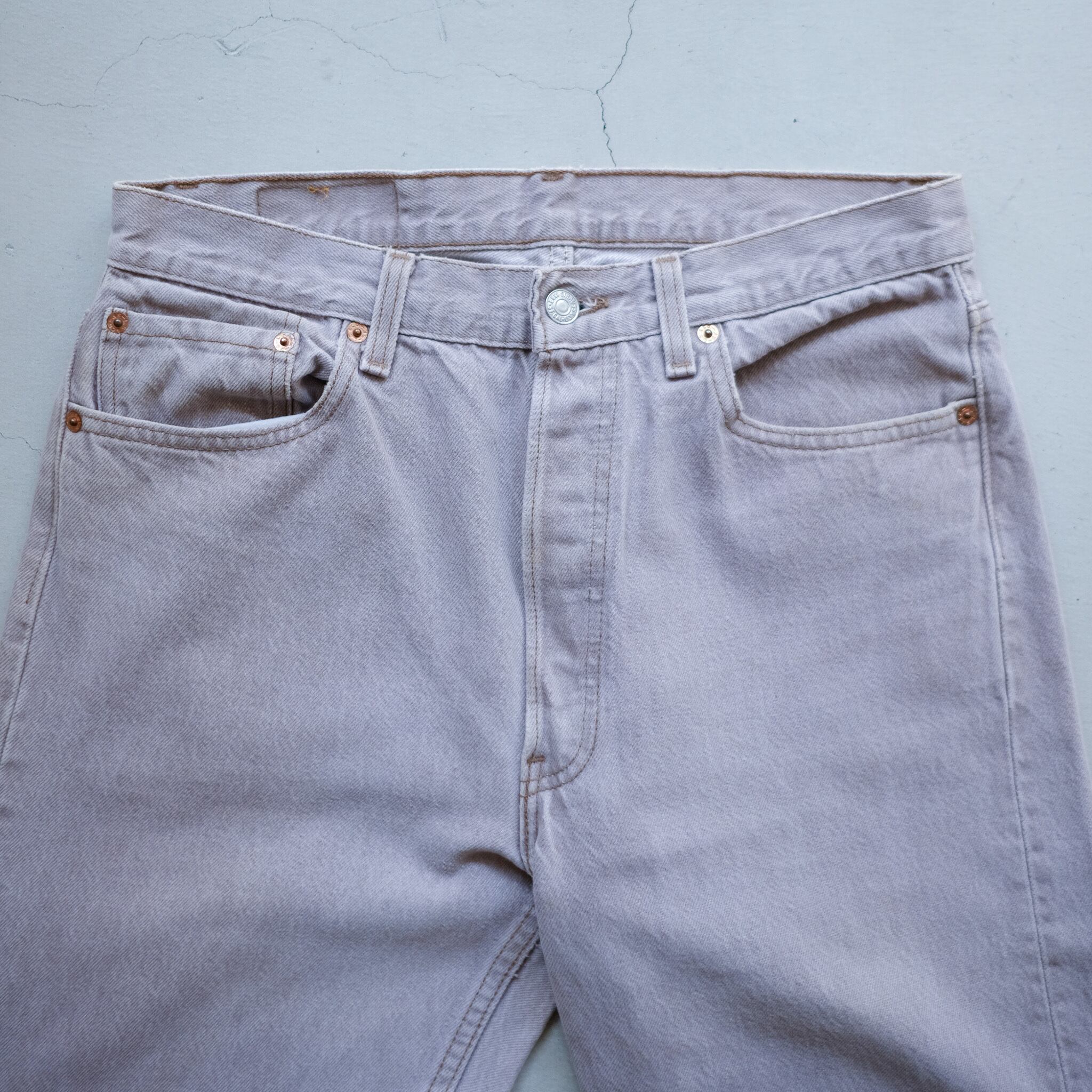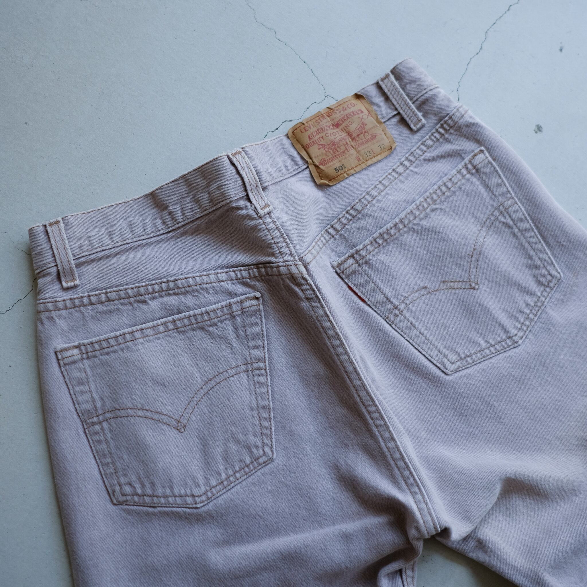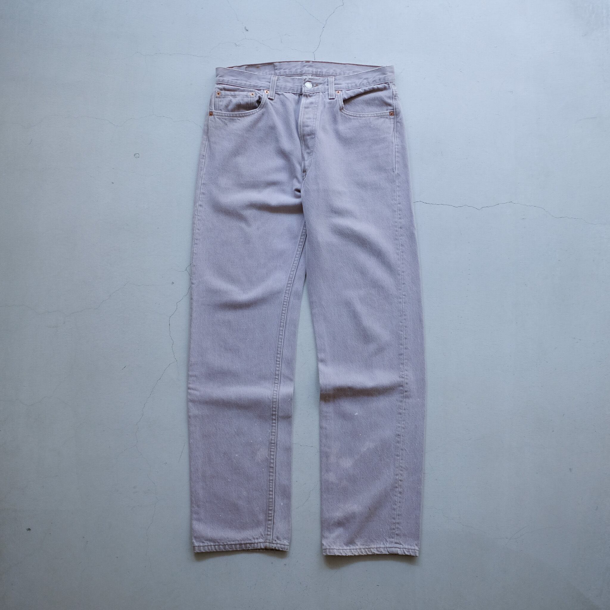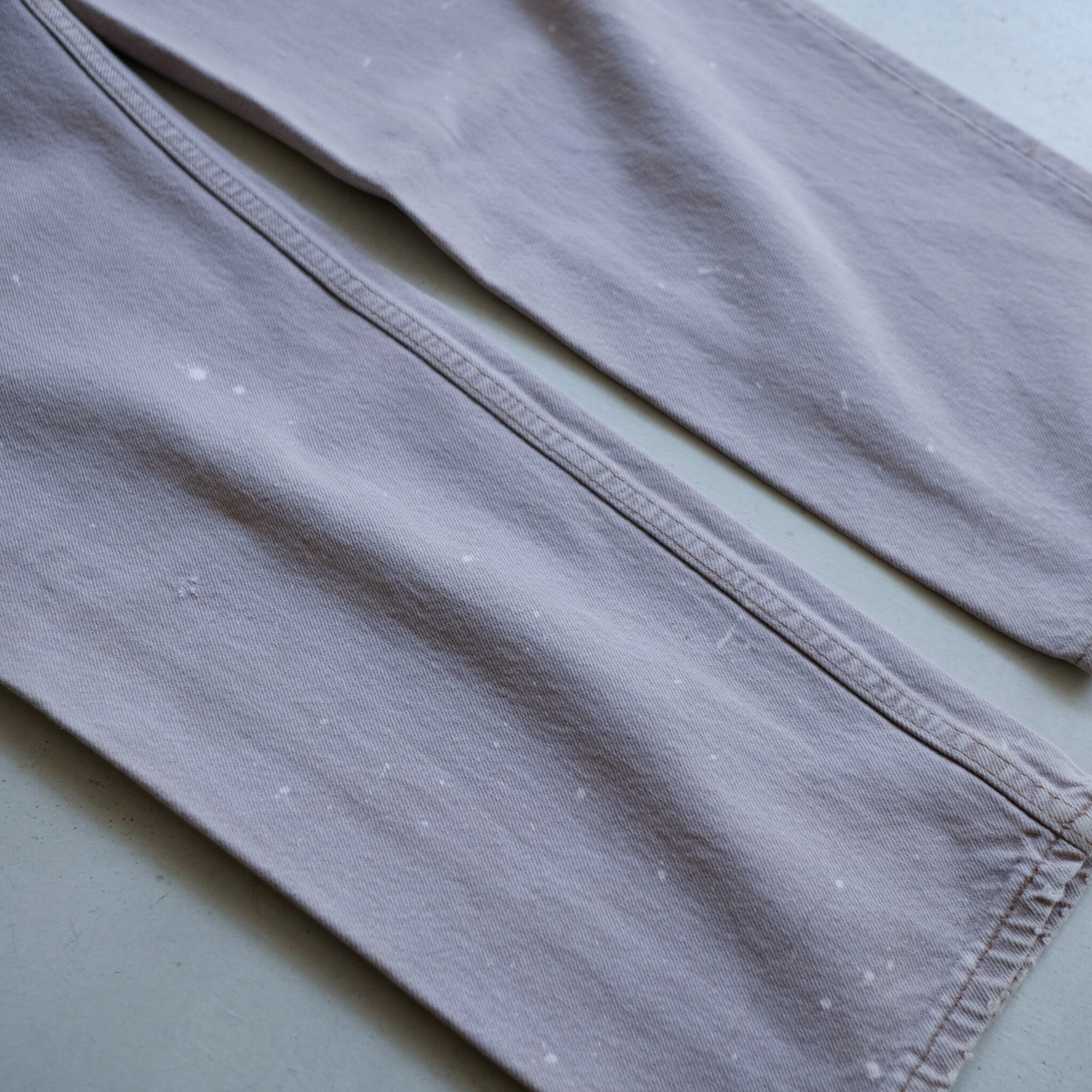 1990年代のLevi's501。王道品番の薄くピンクがかったグレーでレアカラー。個体数の少なくなったmade in USA。表記w33×l32でゴールデンサイズと、条件の良い個体です。裾に飛んだ細かなペイントも良い雰囲気。
