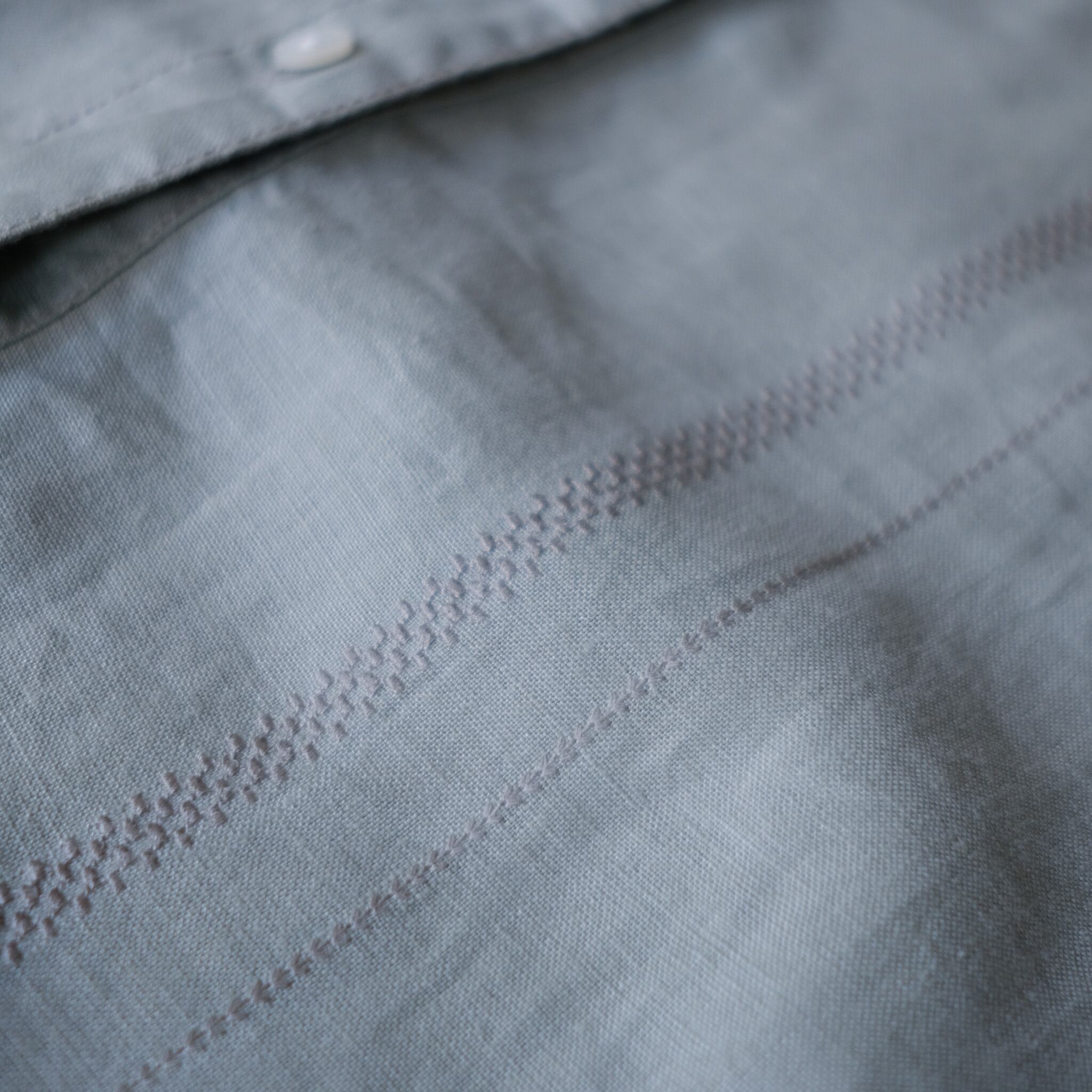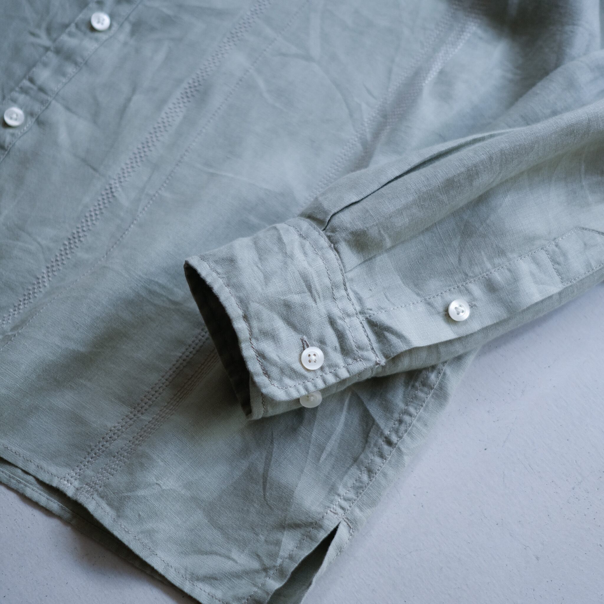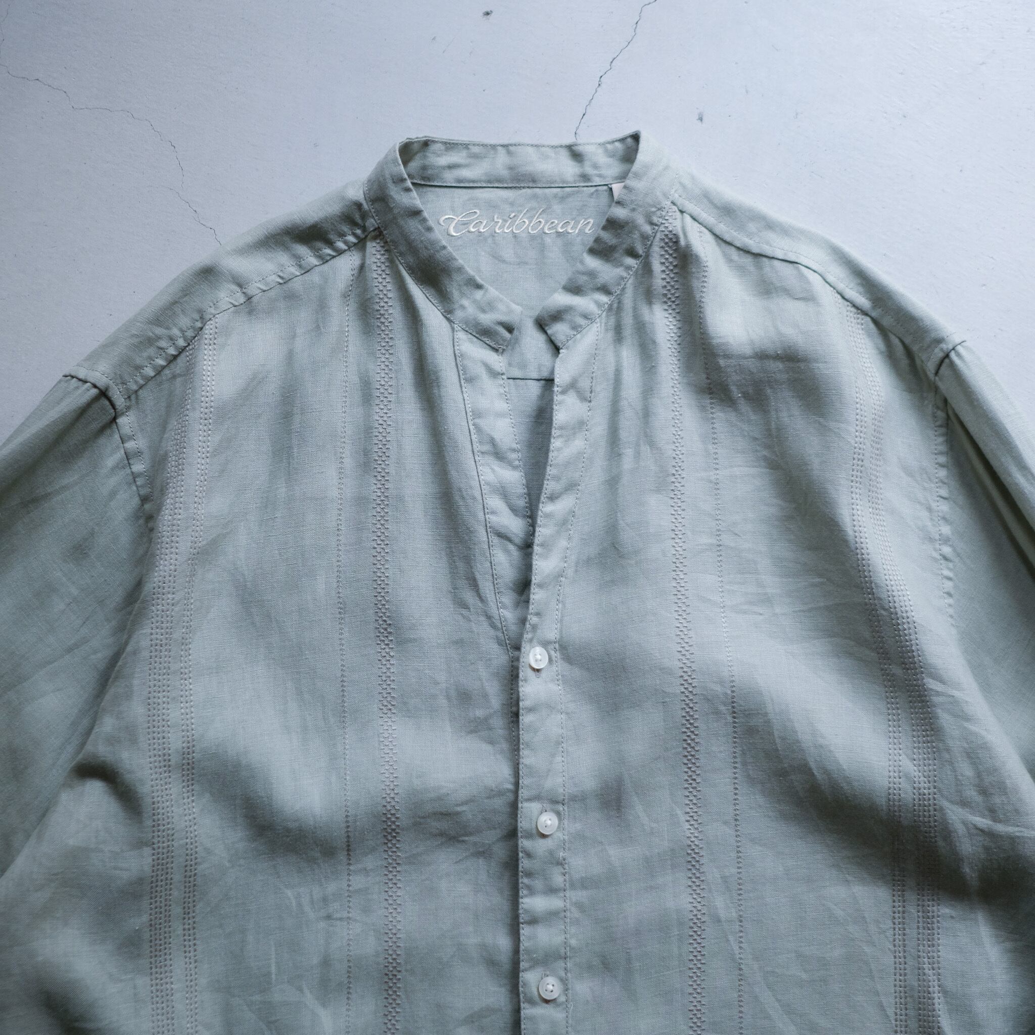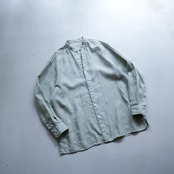 薄くくすんだグリーンカラーが清涼感のあるリネンシャツ。首元のボタンは排除され、スキッパータイプのデコルテのデザイン。さりげなく身頃に施された刺繍もアクセントに。身幅68cmでゆったりとした着用感。