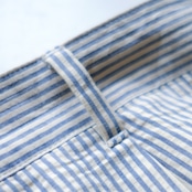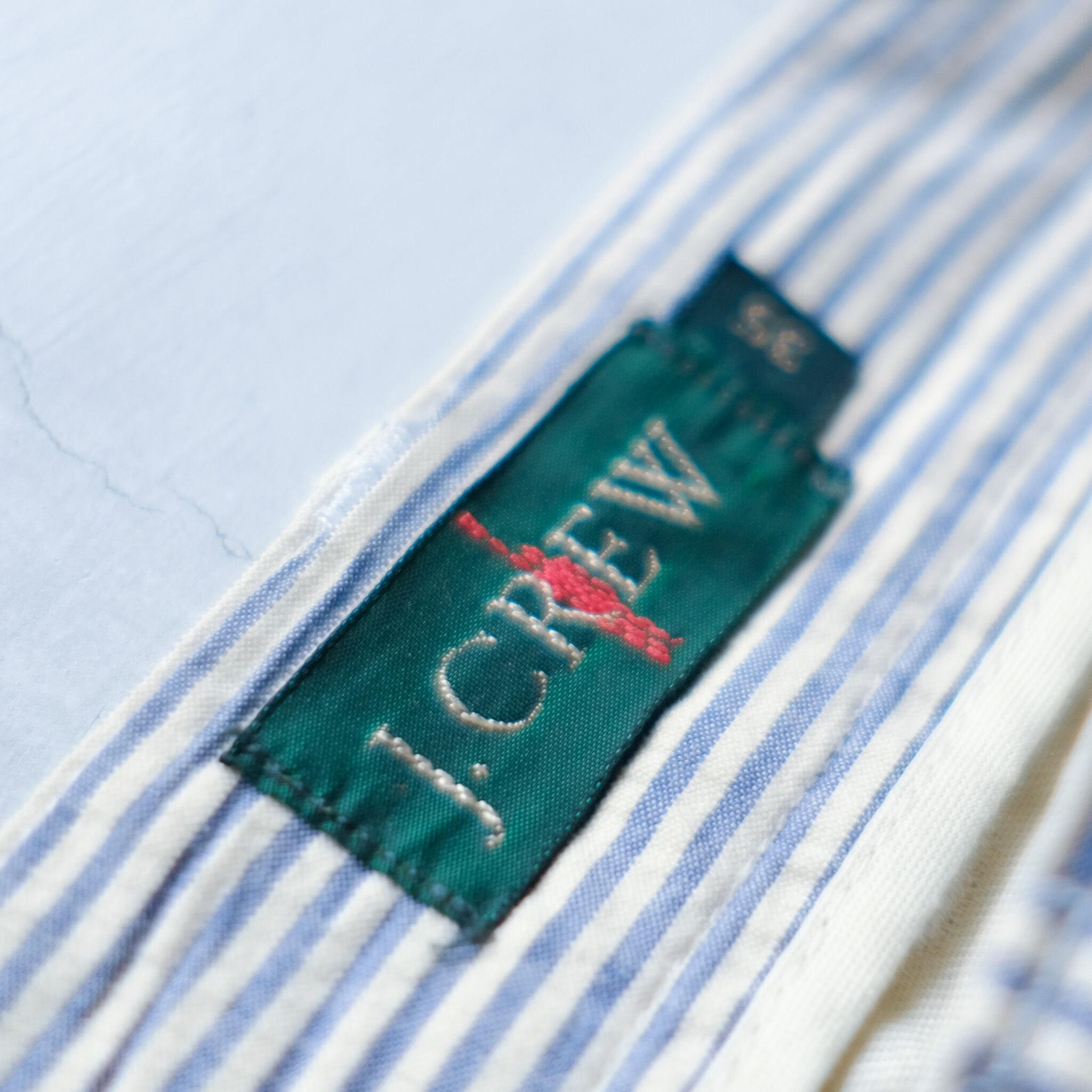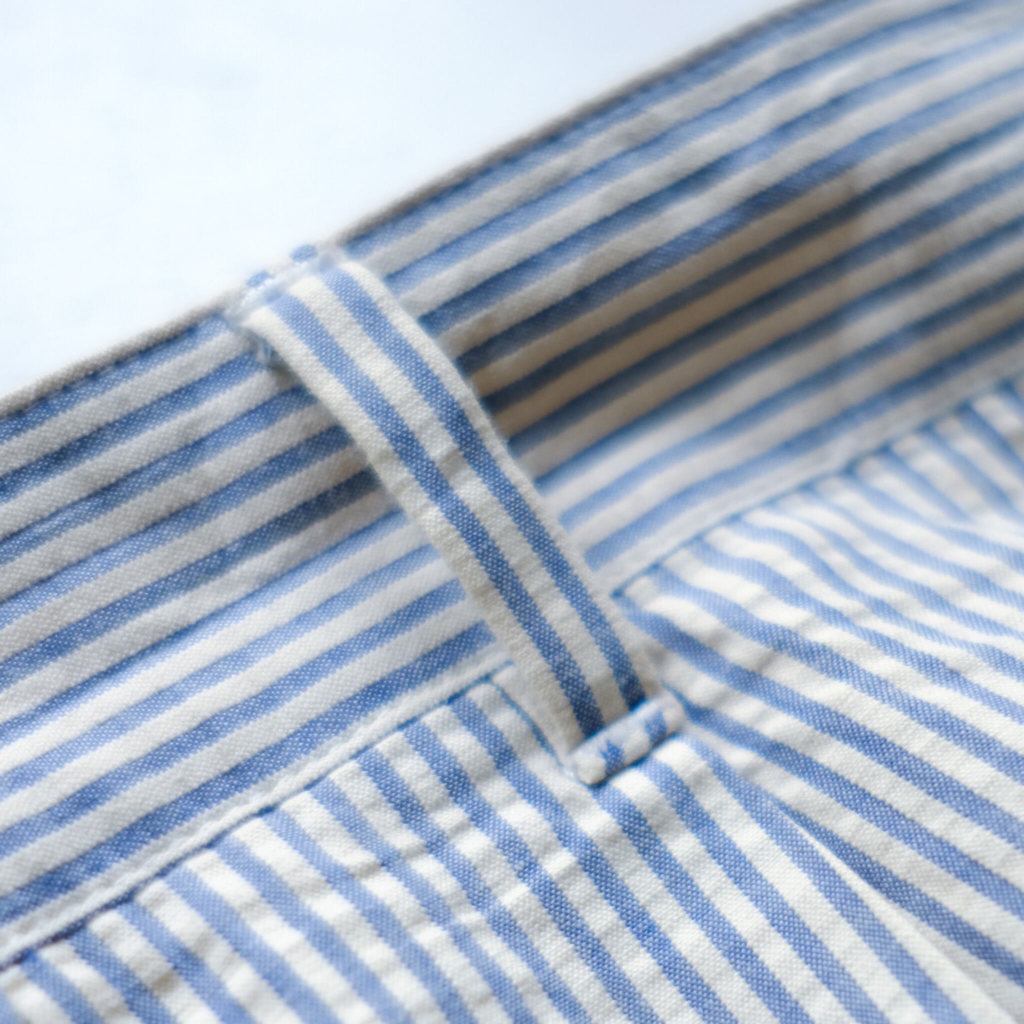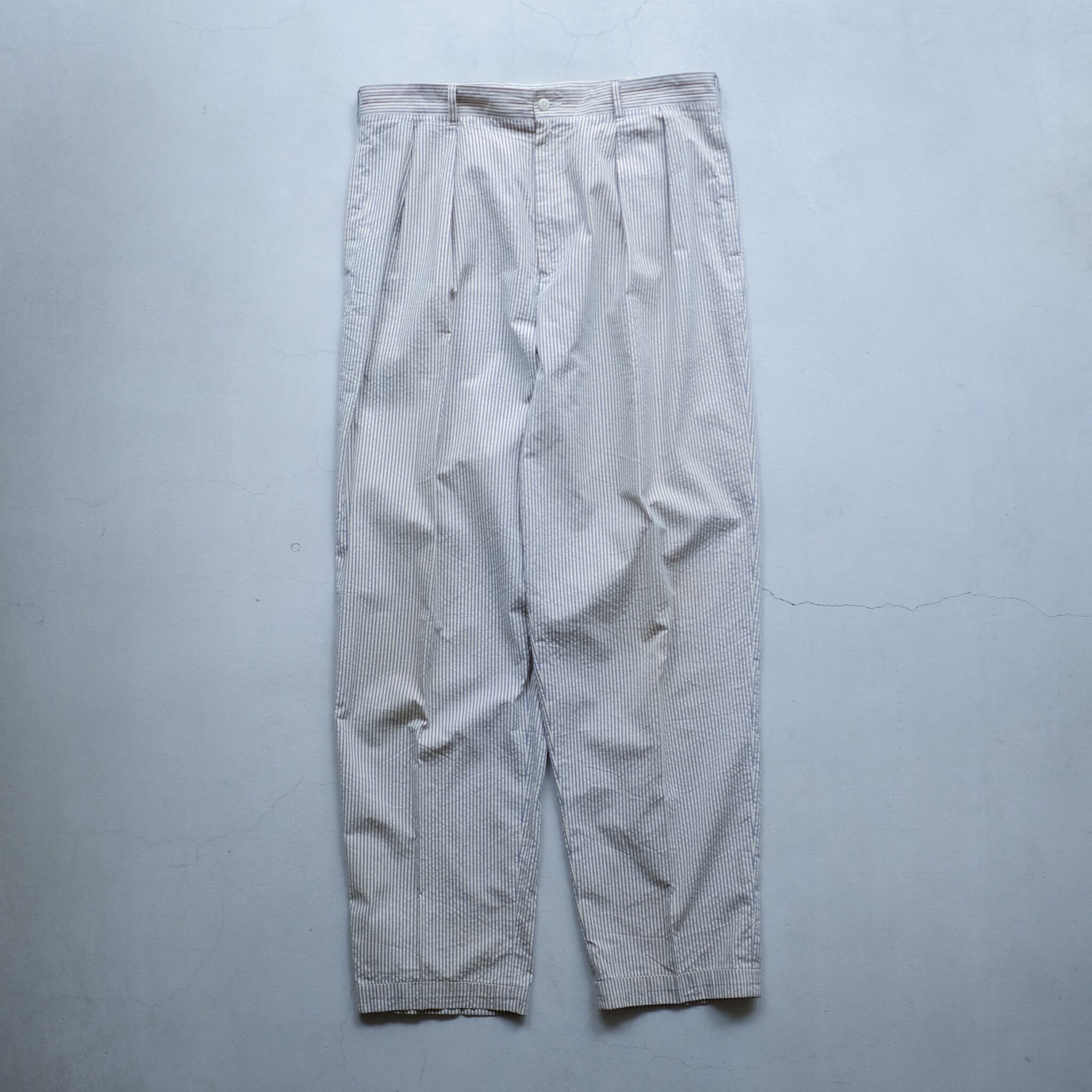 丁寧な物作りでファンも多い1990年代のj.crewからトレンド感のあるシアサッカー素材を使用したワイドテーパードシルエットのスラックス。清涼感のある素材にたっぷりとゆとりのあるワタリ幅、裾に向かってゆるくかかったテーパードがラフになりすぎない品のある表情に。市場でよく見かけるシアサッカーに比べ、アイボリーがかった渋さのある配色もこの年代のj.crewならではかと。