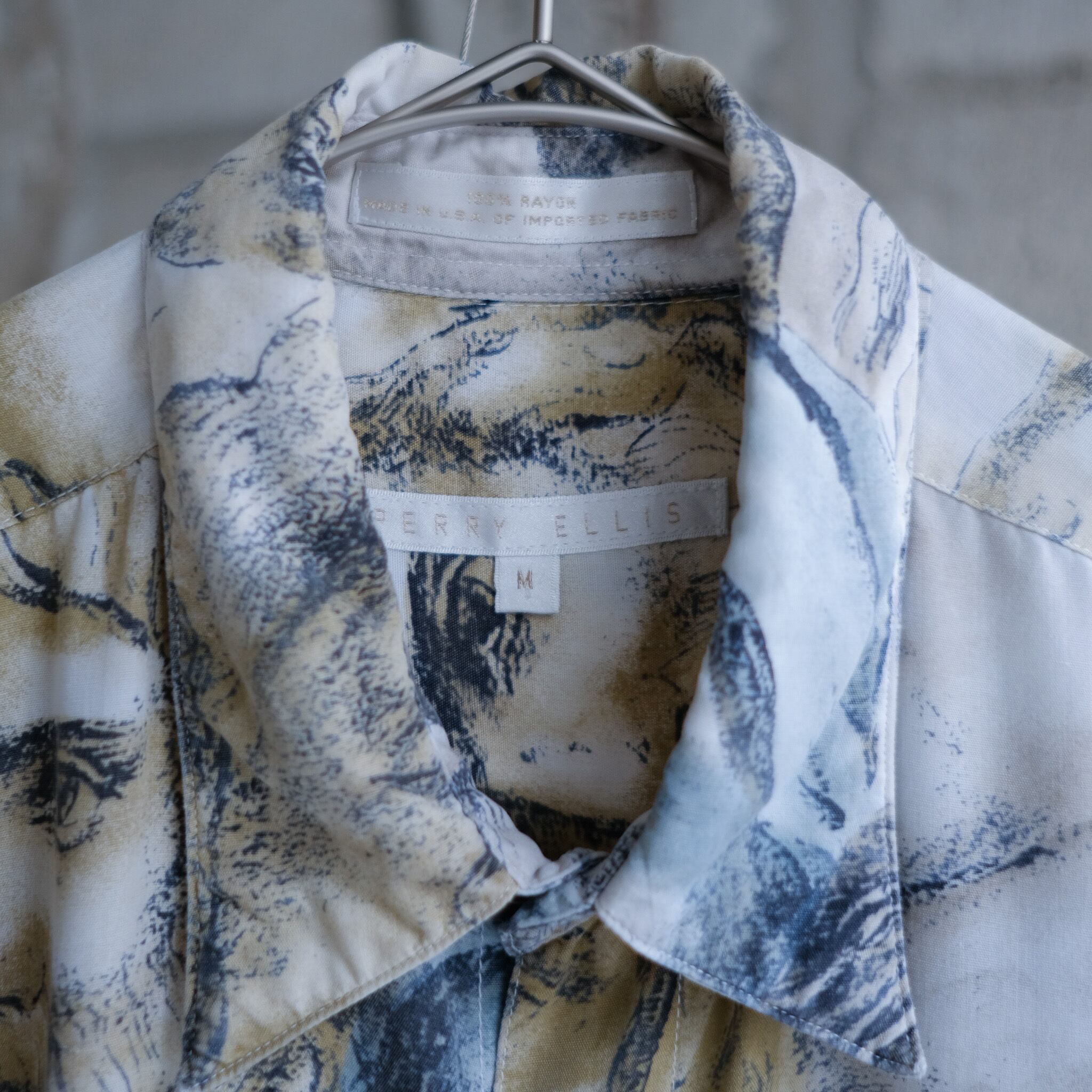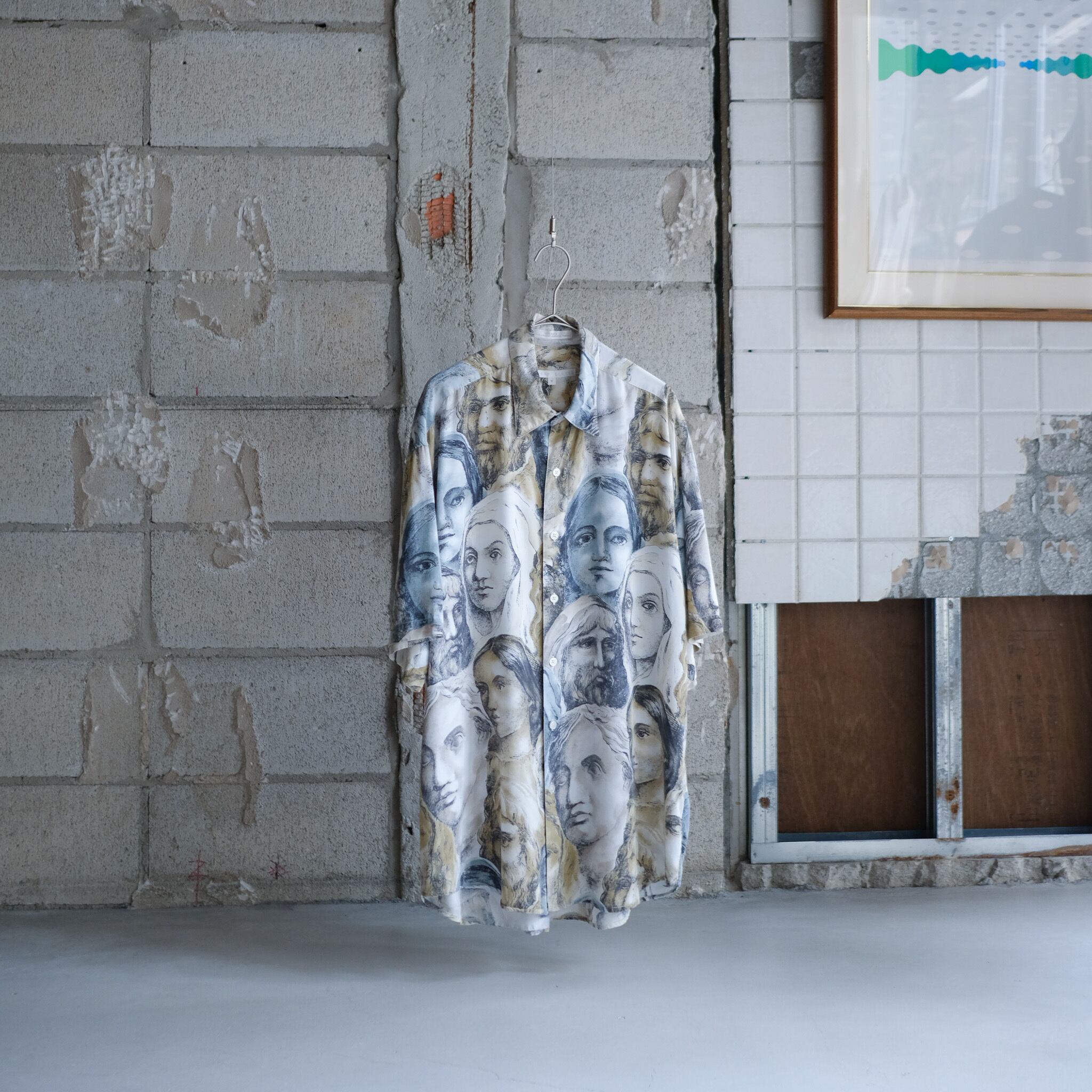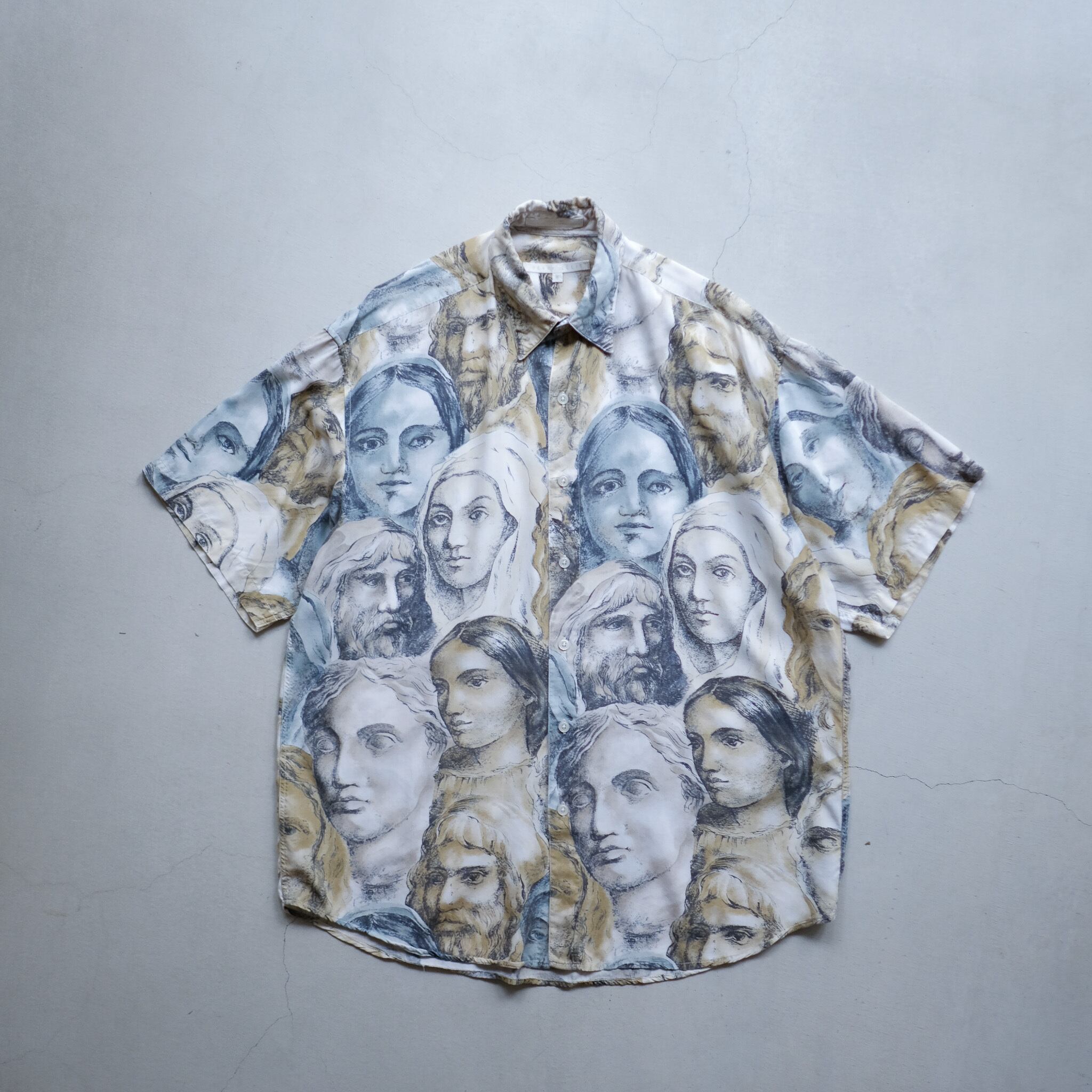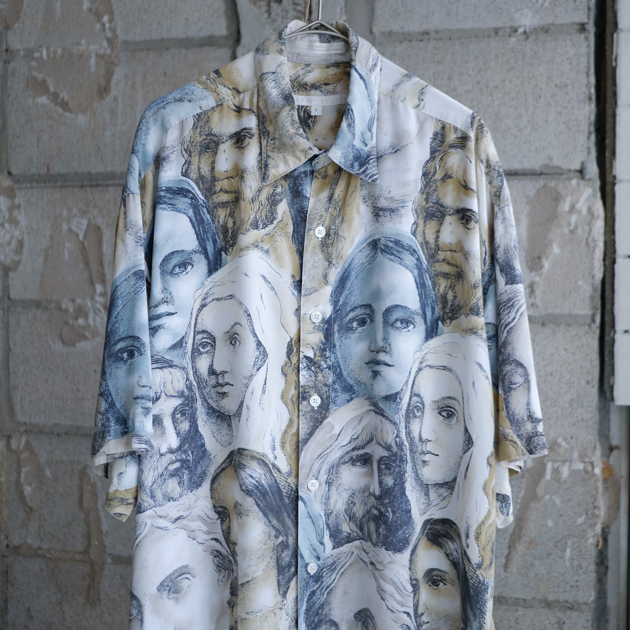 中世の絵画調な人々の顔が描かれたPELLY ELLISのレーヨンシャツ。ボディのデザインは削ぎ落とされレギュラーカラーにポケットレス。タグに"IMPORTED FABRIC"と記載があるように、特徴的なこの柄が際立つ仕上がりに。同ブランドのシャツの中でも非常に珍しいカテゴリーのシャツだと思われます。サイズ表記はMですが、たっぷりとした身幅でリラックスした着用感のシャツ。