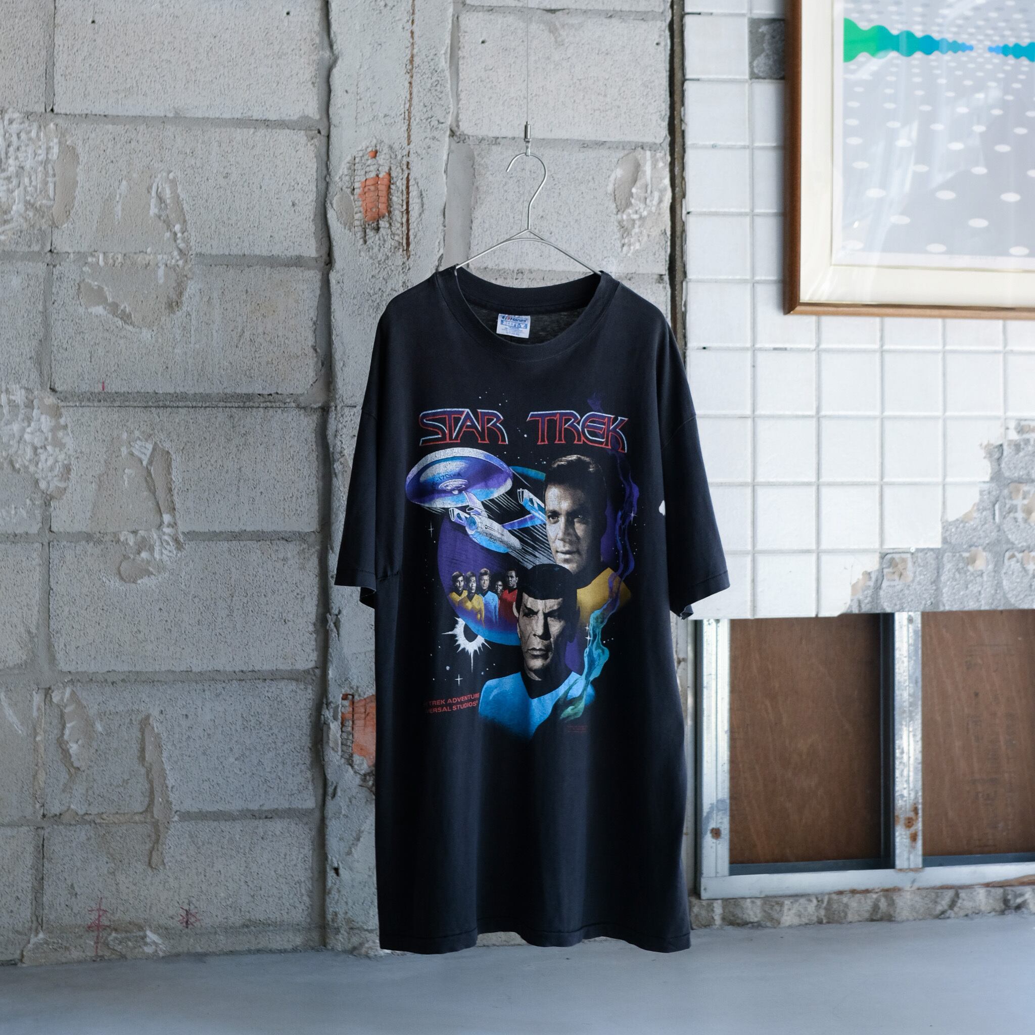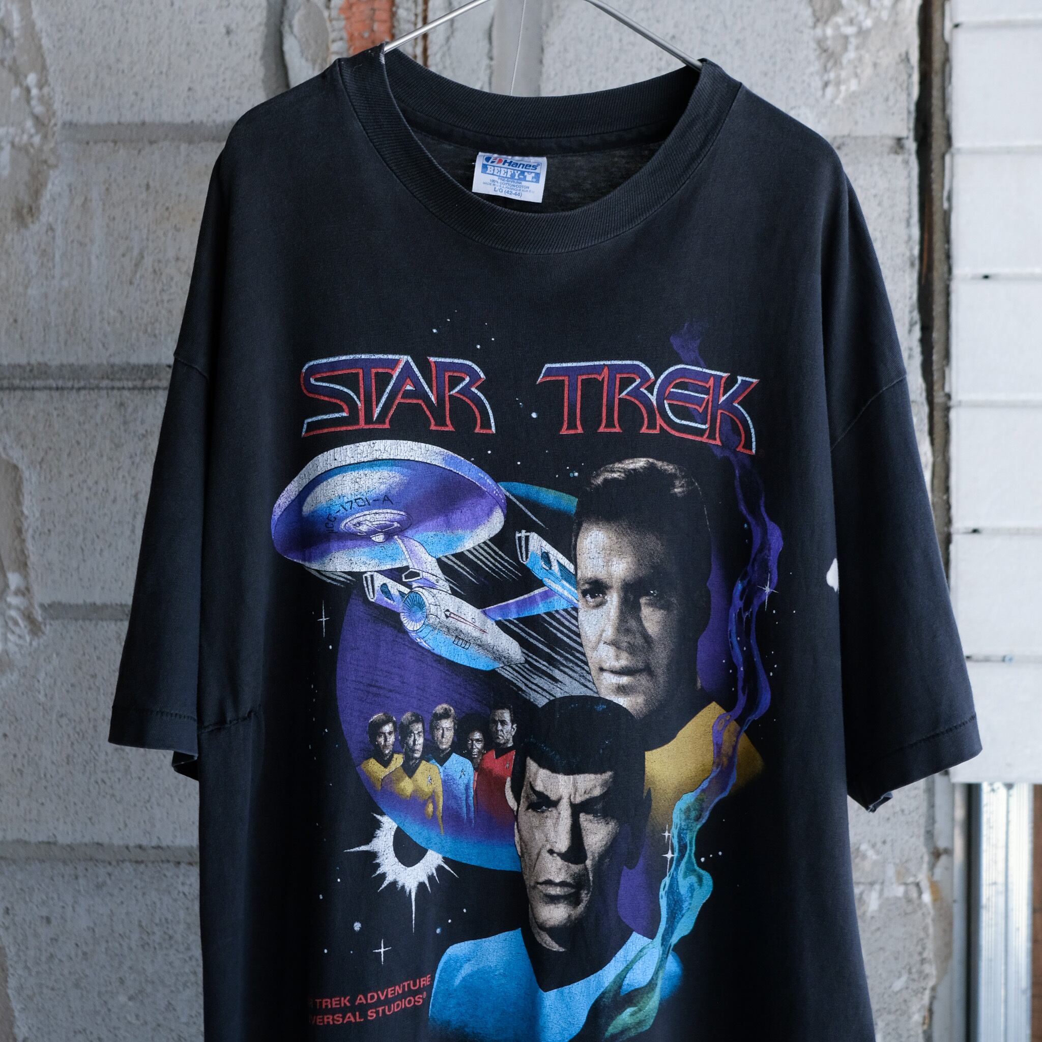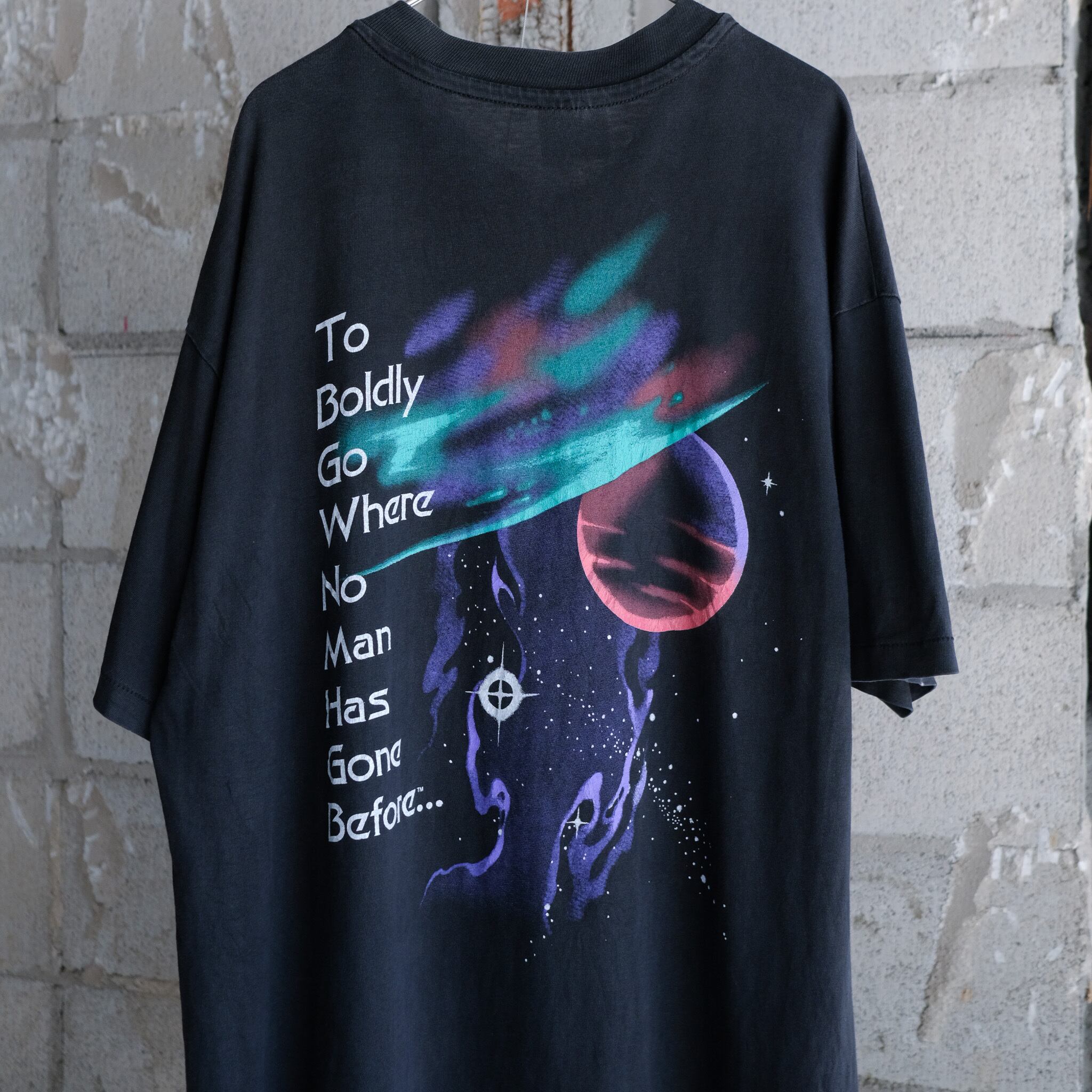 SF映画の名作"スタートレック"の主人公であるジェームズ.T.カークやミスタースポック、エンタープライズ号等物語に欠かす事の出来ない主要メンバーが勢揃いしている当時物のプリントTシャツ。パックプリントには"To Boldly Go Where No Man Has Gone Before"と劇中にも出てくるメッセージと共に銀河系がプリントされており、数あるスタートレックのTシャツの中でもクオリティの高い一枚。
