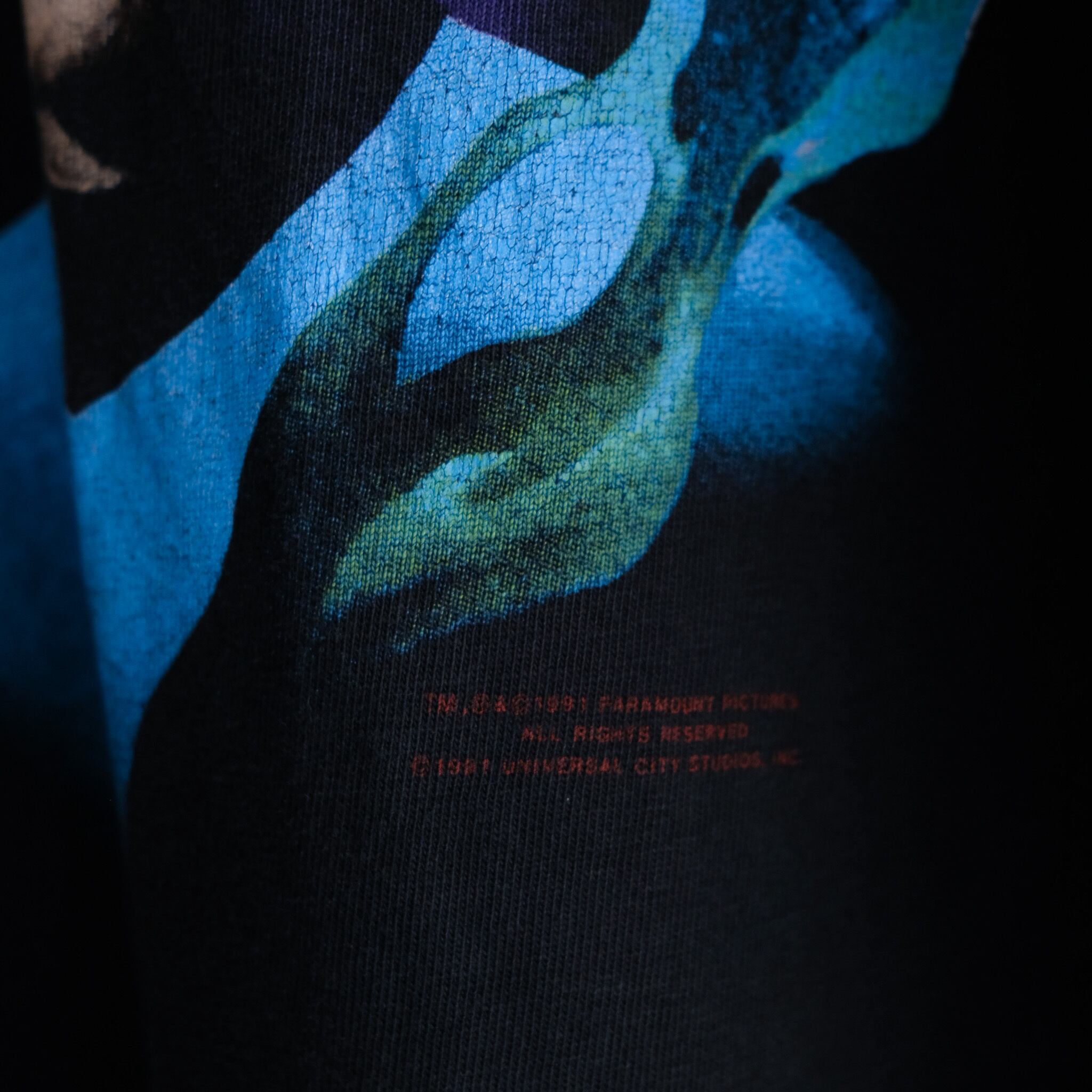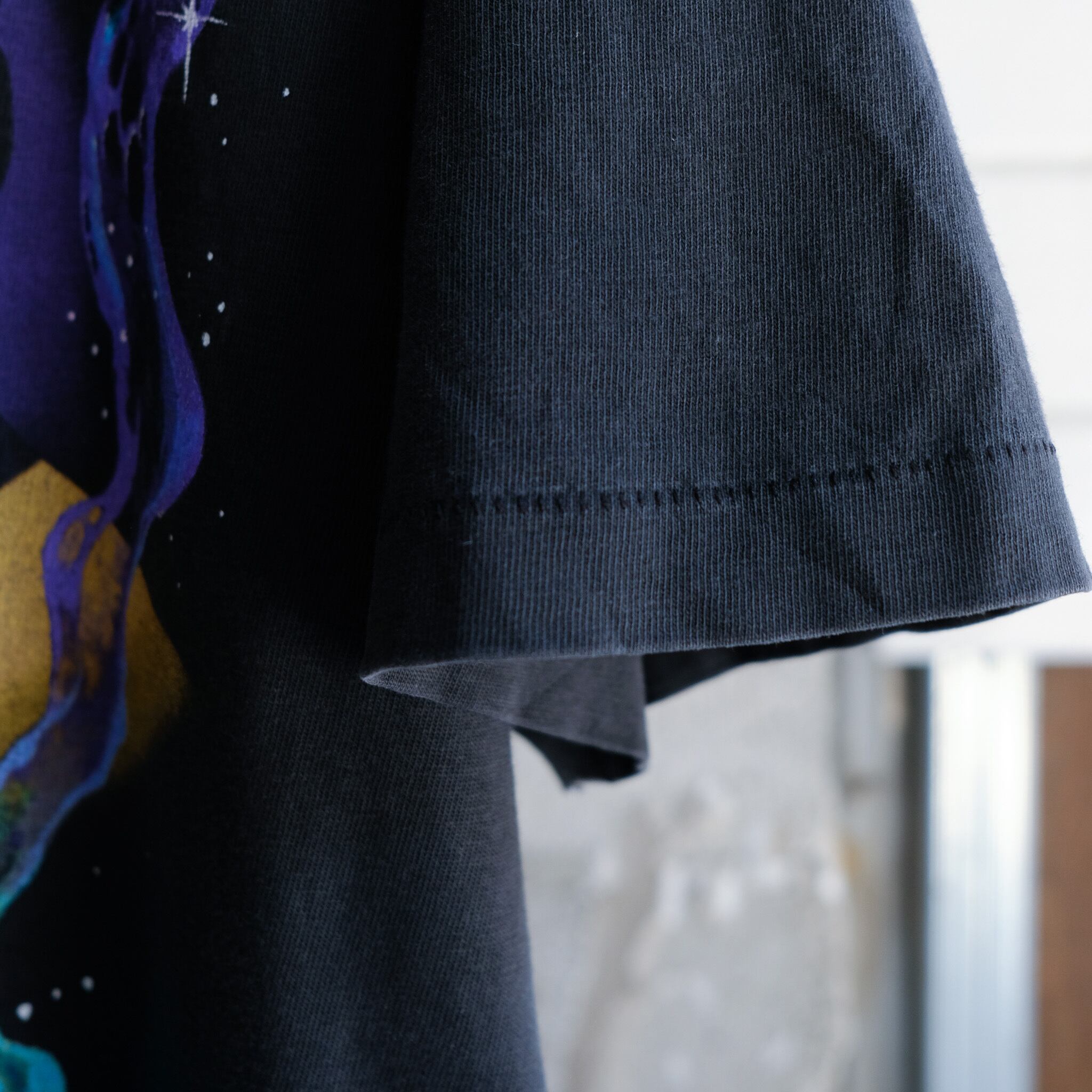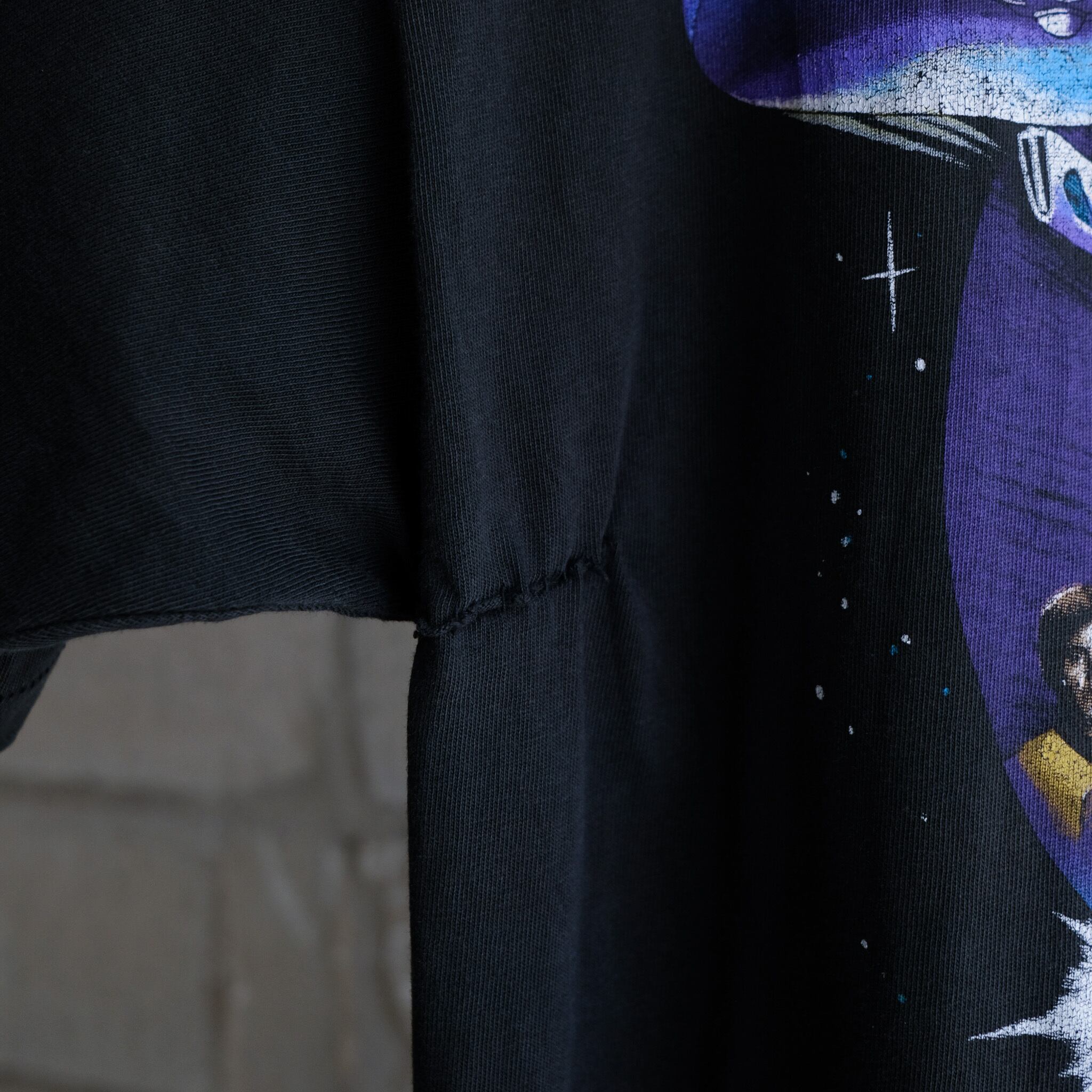 SF映画の名作"スタートレック"の主人公であるジェームズ.T.カークやミスタースポック、エンタープライズ号等物語に欠かす事の出来ない主要メンバーが勢揃いしている当時物のプリントTシャツ。パックプリントには"To Boldly Go Where No Man Has Gone Before"と劇中にも出てくるメッセージと共に銀河系がプリントされており、数あるスタートレックのTシャツの中でもクオリティの高い一枚。
