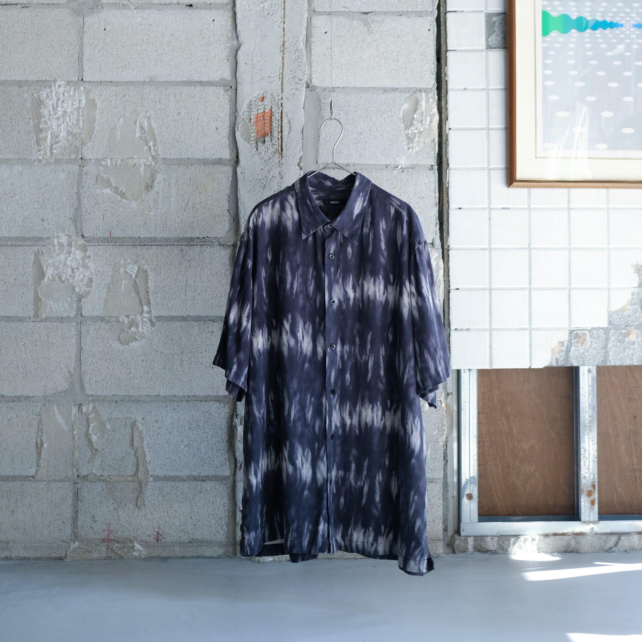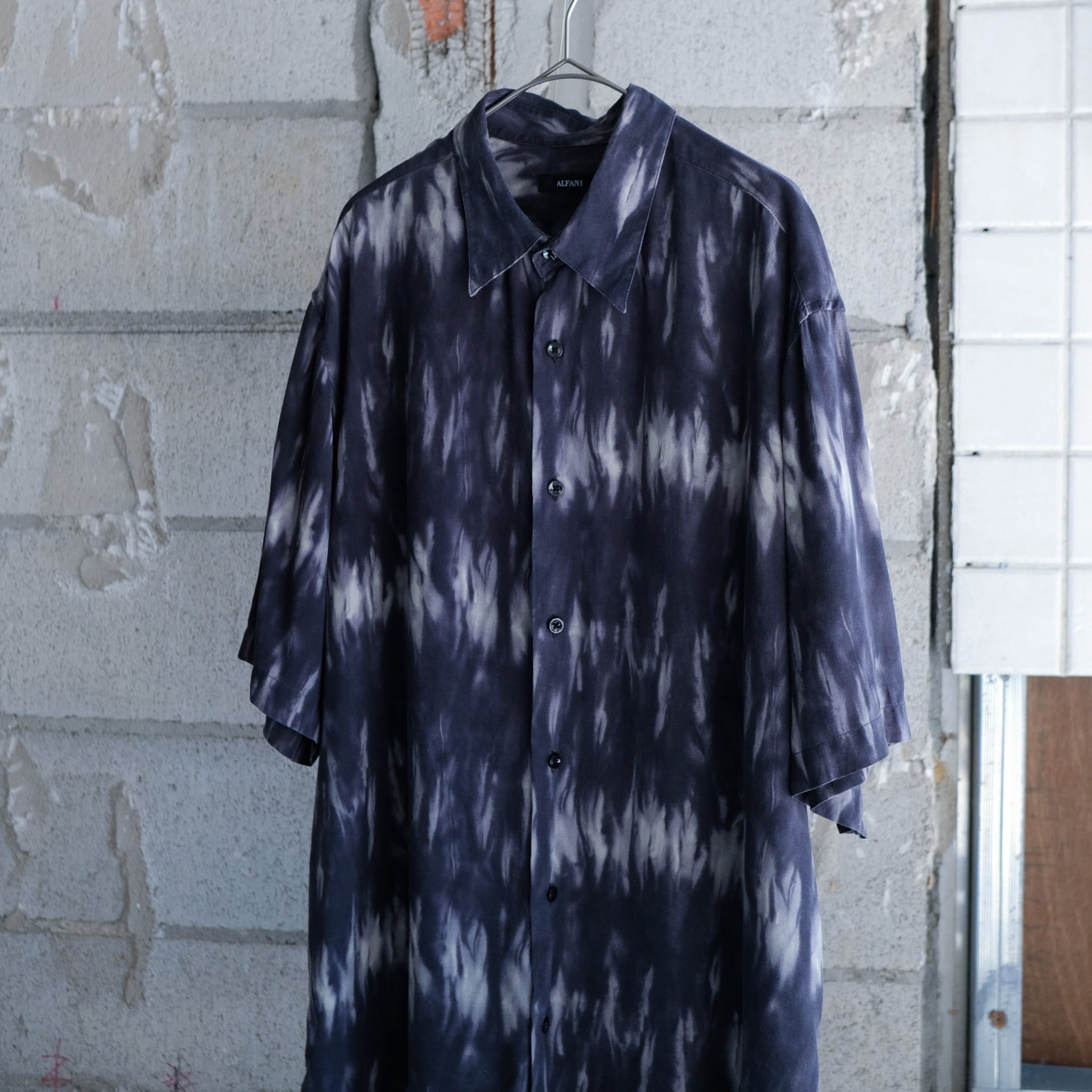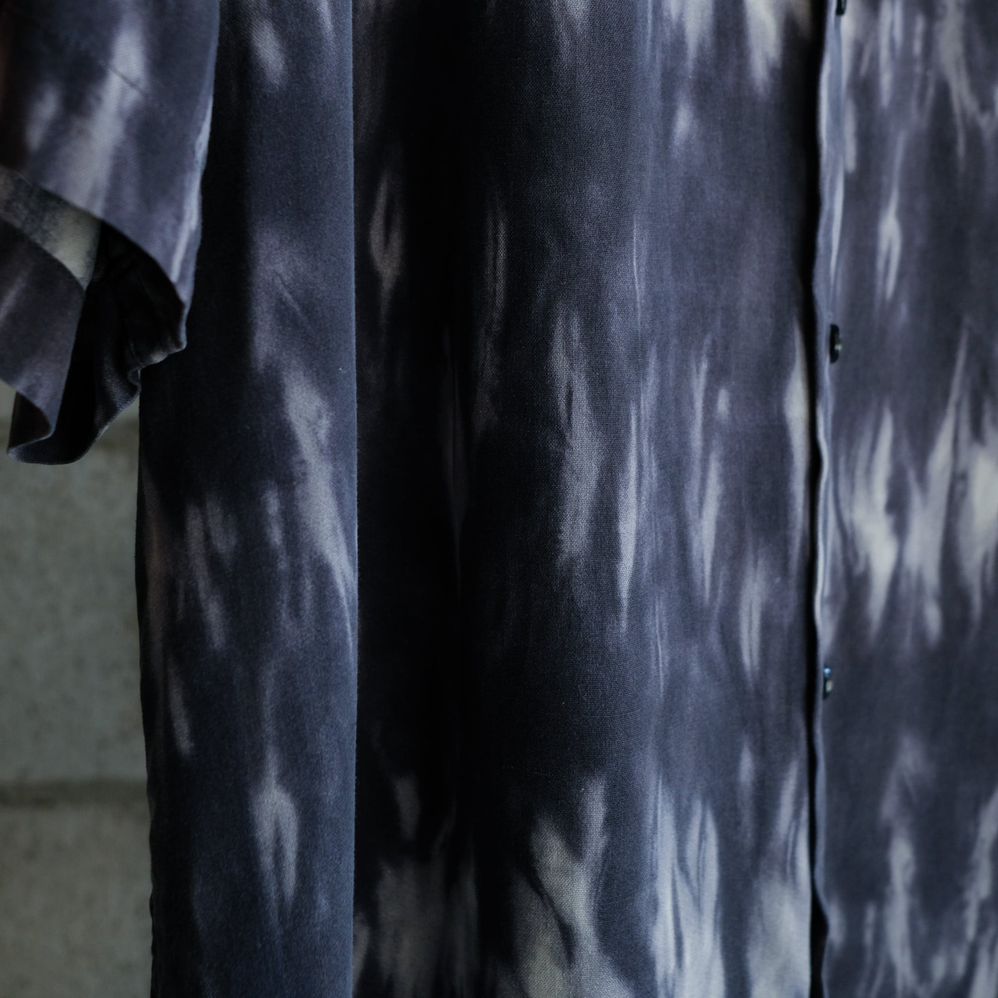 タイダイ染めの様な雰囲気のあるプリントが施されたシルクシャツ。ブラックベースの細かな柄がモード感のある一枚。薄く滑らかなシルクを使用しており、軽い着用感。身幅65cmのゆったりとしたサイズ感。