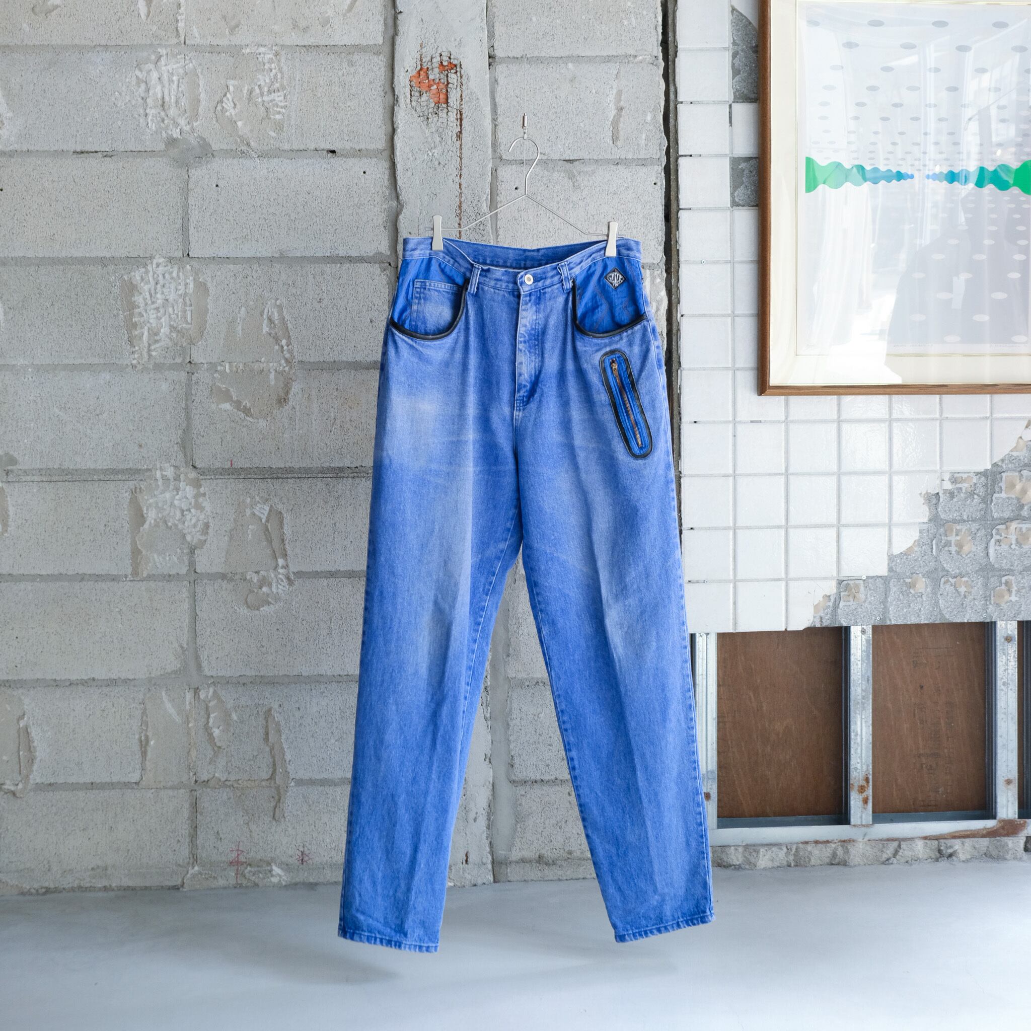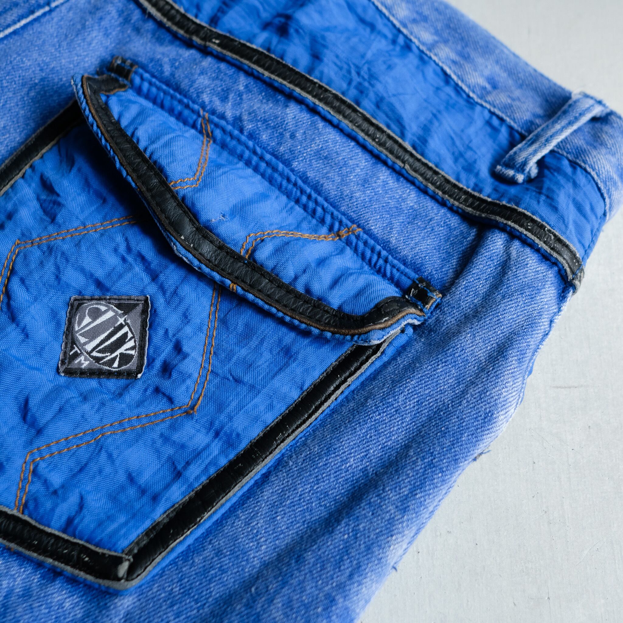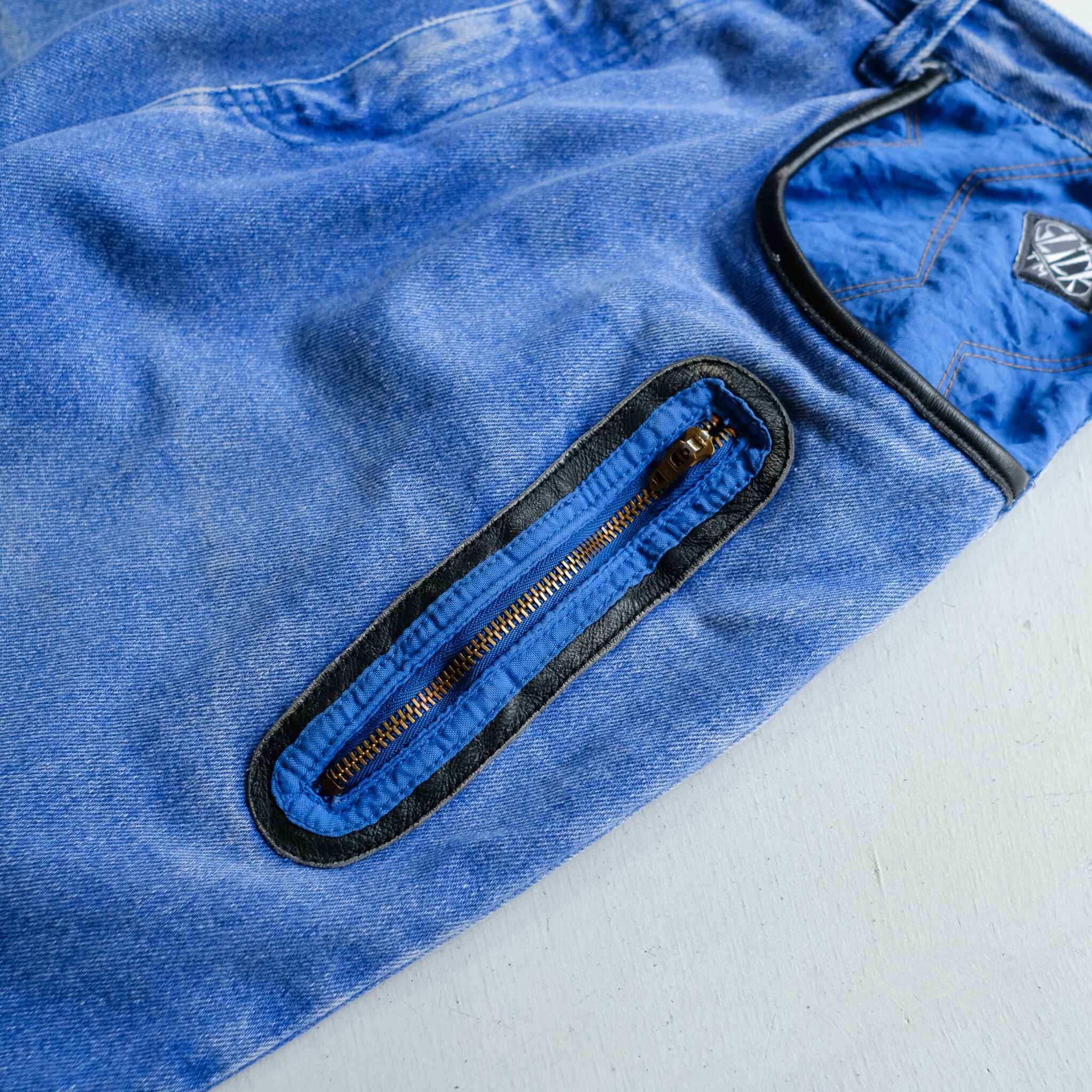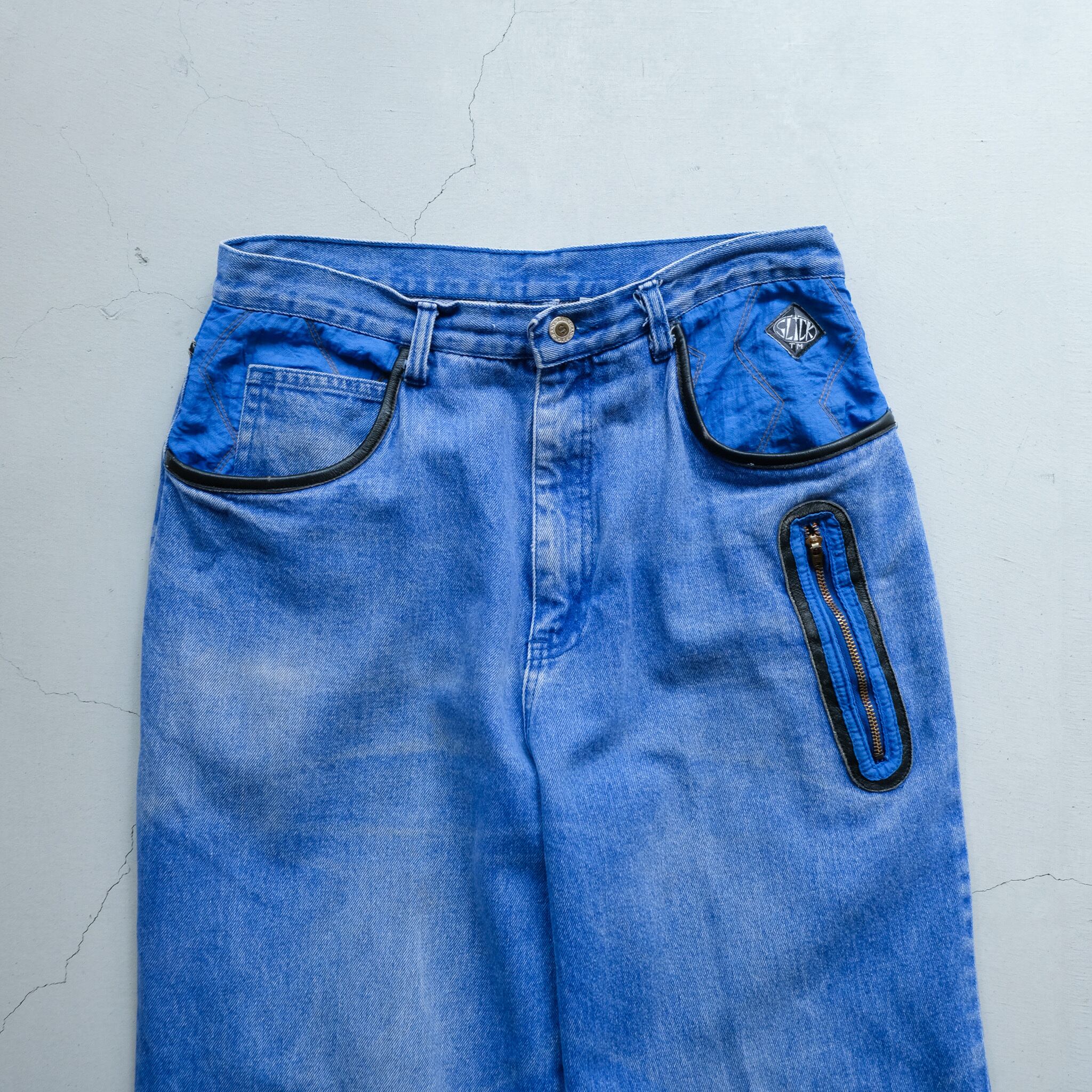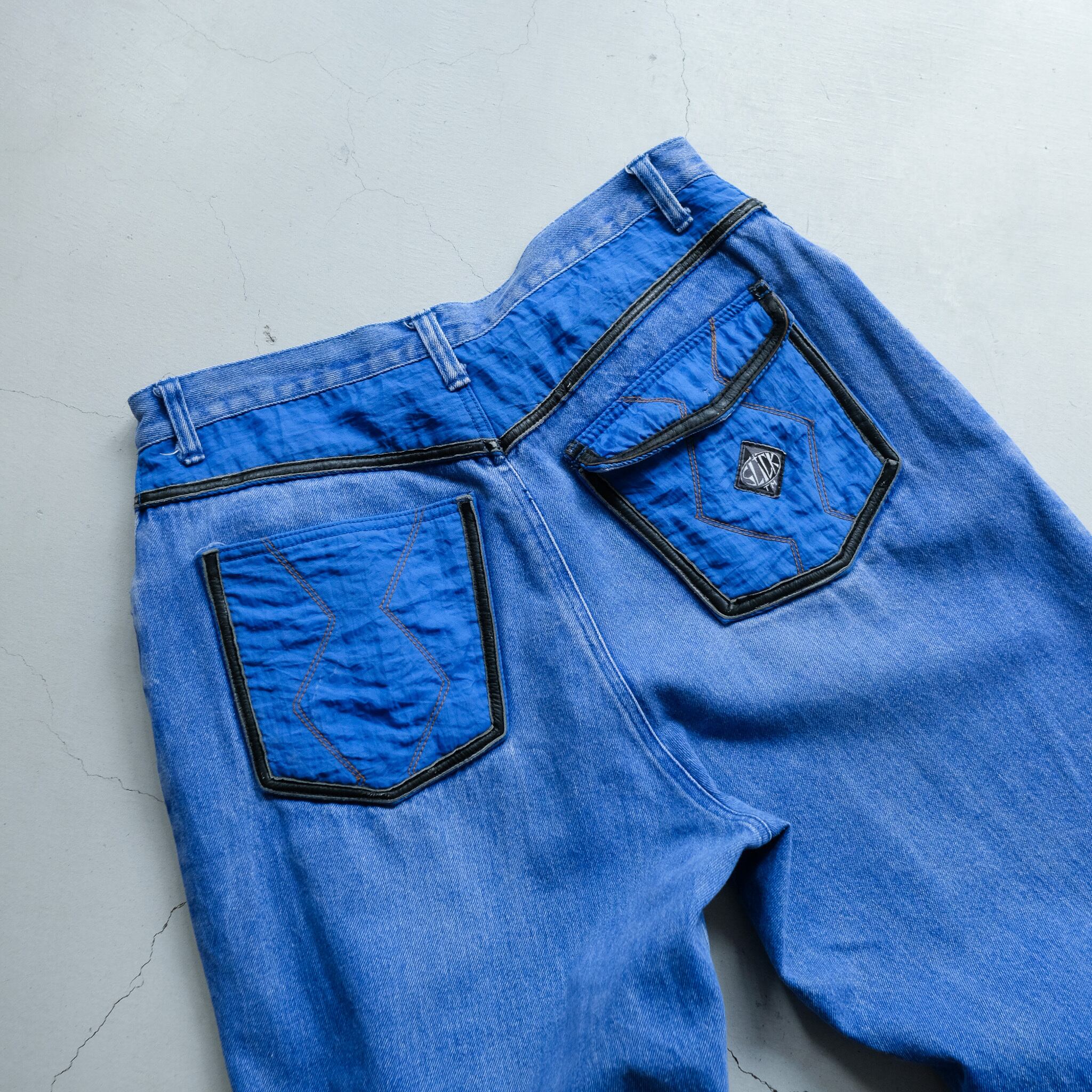 ナイロン、レザー素材で切り替えられたデザインデニムパンツ。ナイロン部分にはステッチが施され、ポケット部分やヨークにはレザーパイピングと作り込まれたディテール。サイドの楕円形のポケットはヴィンテージバイカーアイテムのディテールを彷彿とさせ、ミックス感のある仕上がりとなっています。シルエットはワイドテーパード。股上も深く、ルーズな着用感。