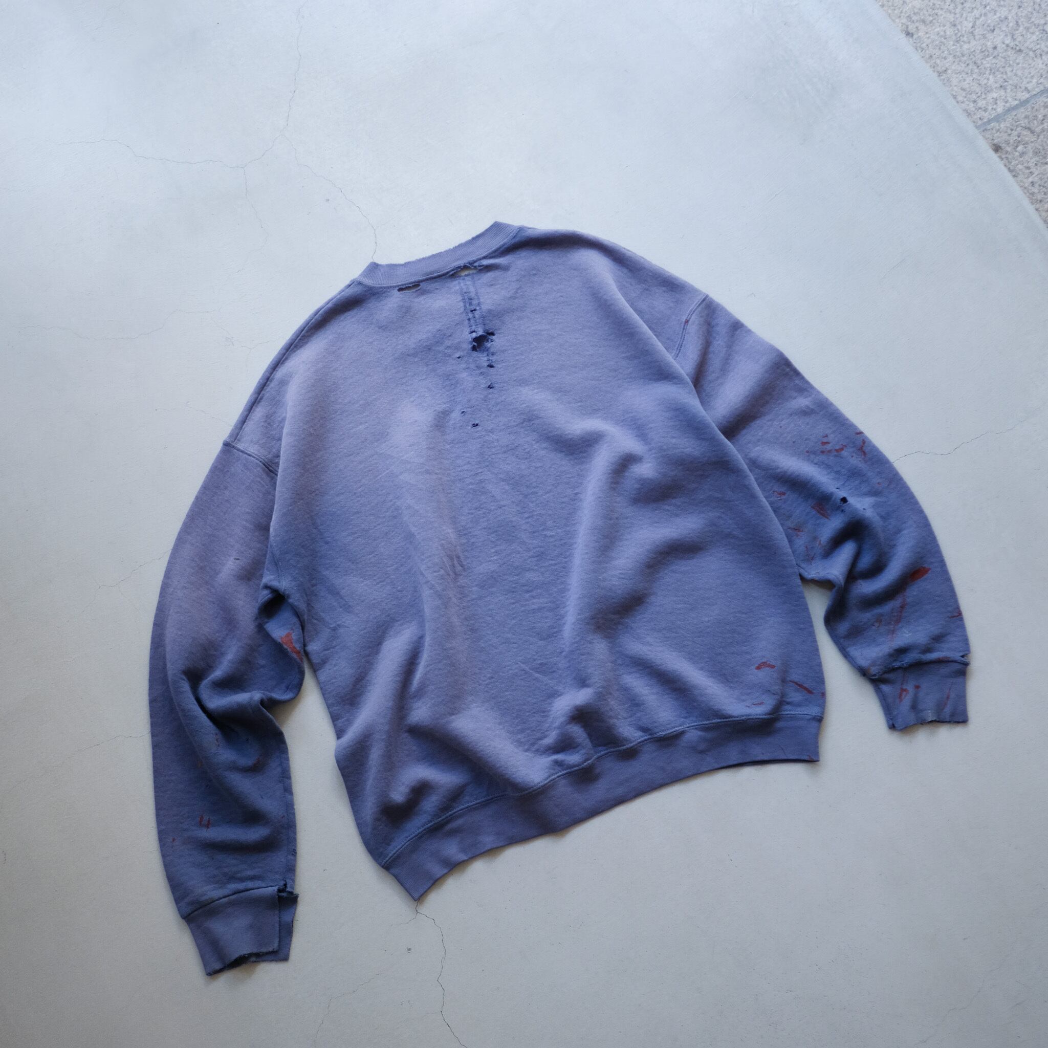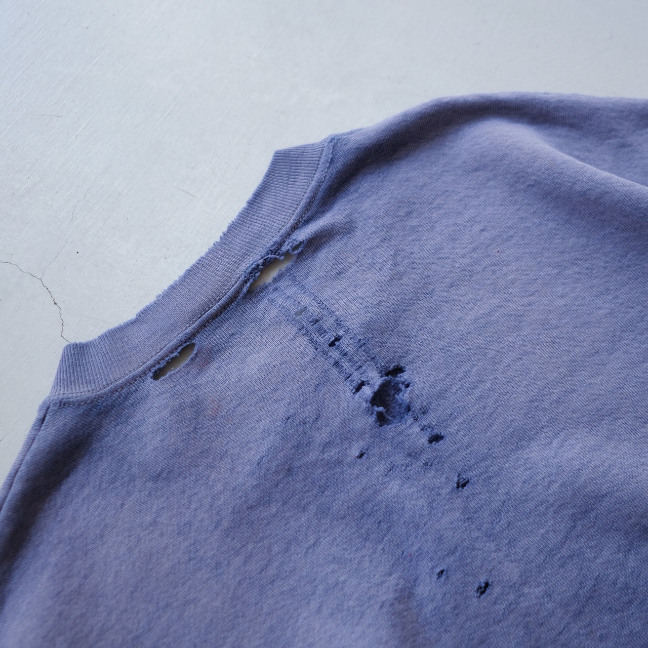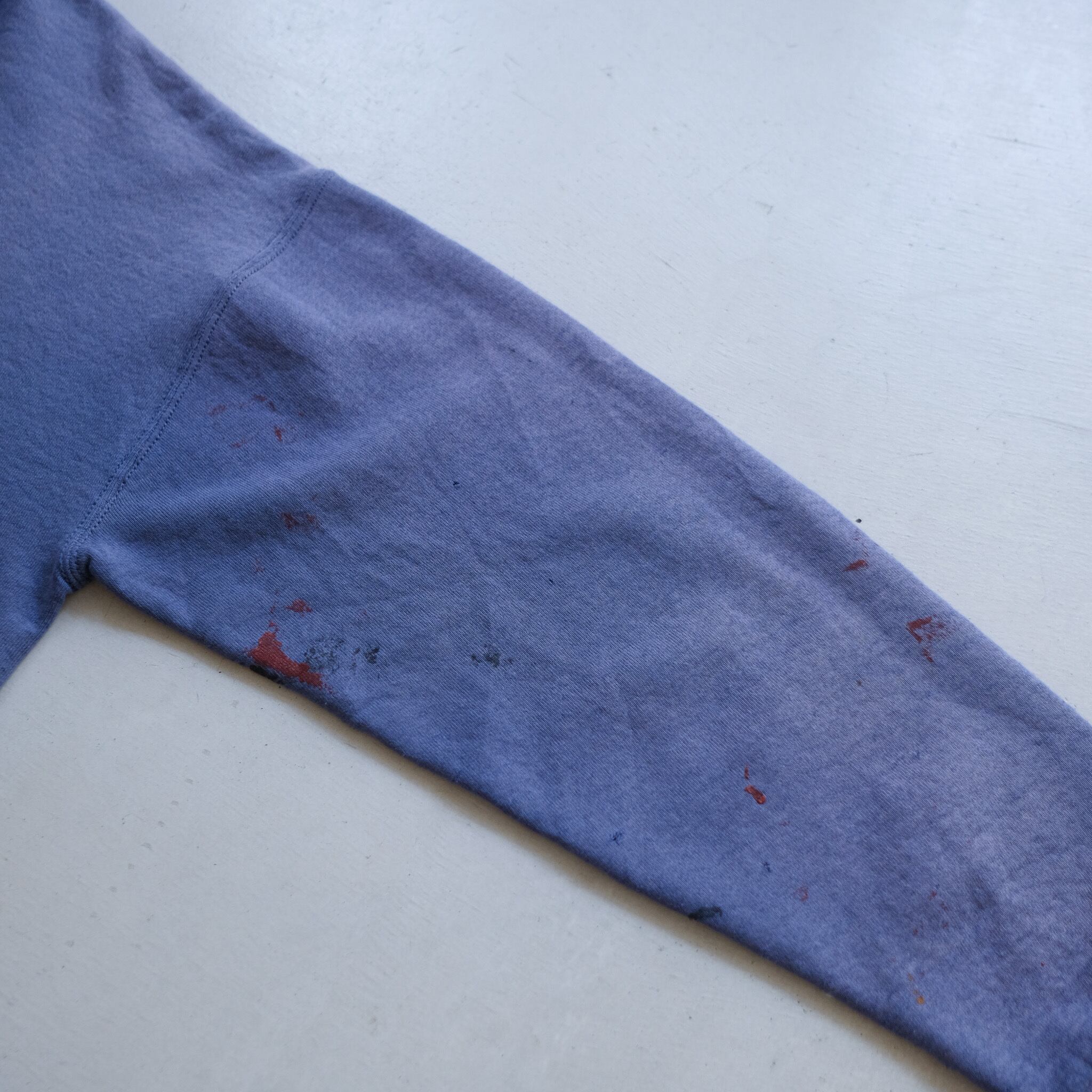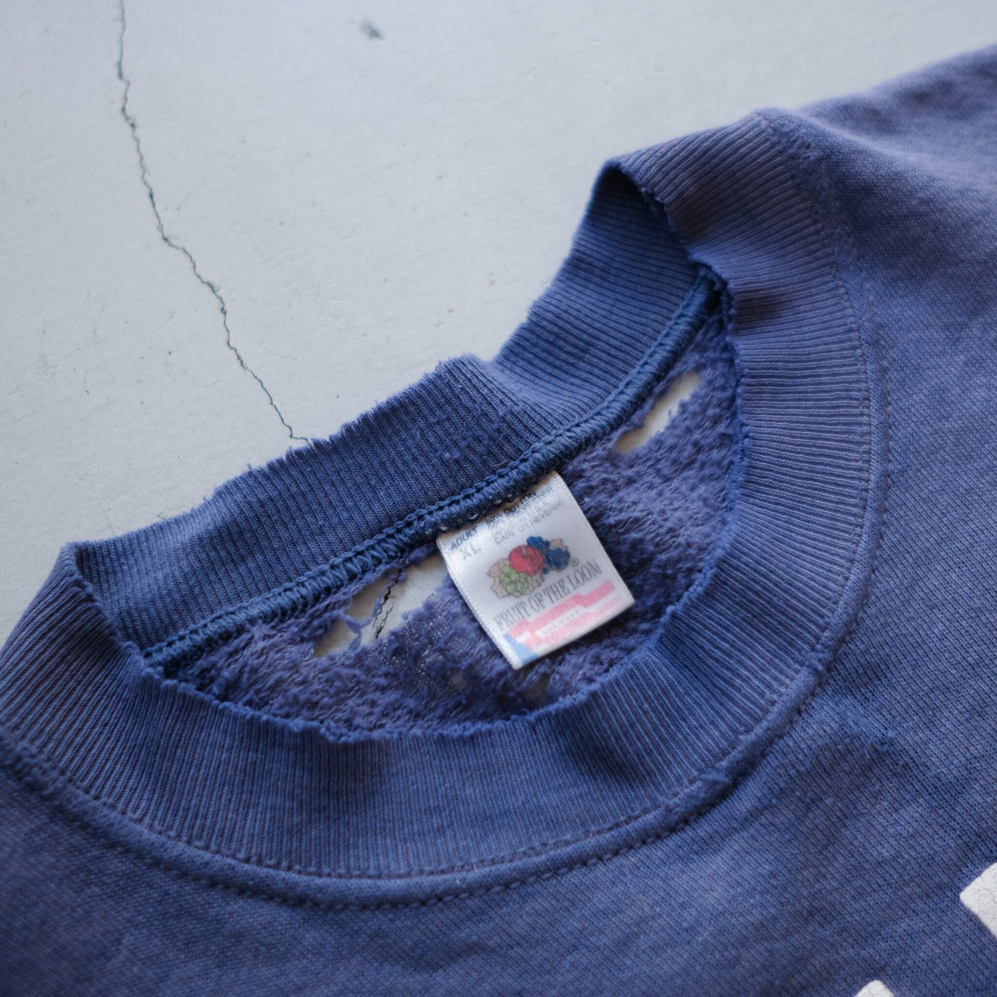 ネイビーが褪色した淡いカラーリングに加え、経年劣化によって現れたダメージやペイント。探しても出てこない最高のバランスでエイジングされたスウェットシャツ。プリントが狼モチーフなのも◎。ボディは1990年代のフルーツオブザルーム。コンパクトな着丈にたっぷりとある身幅で男女共に着れるバランスです。