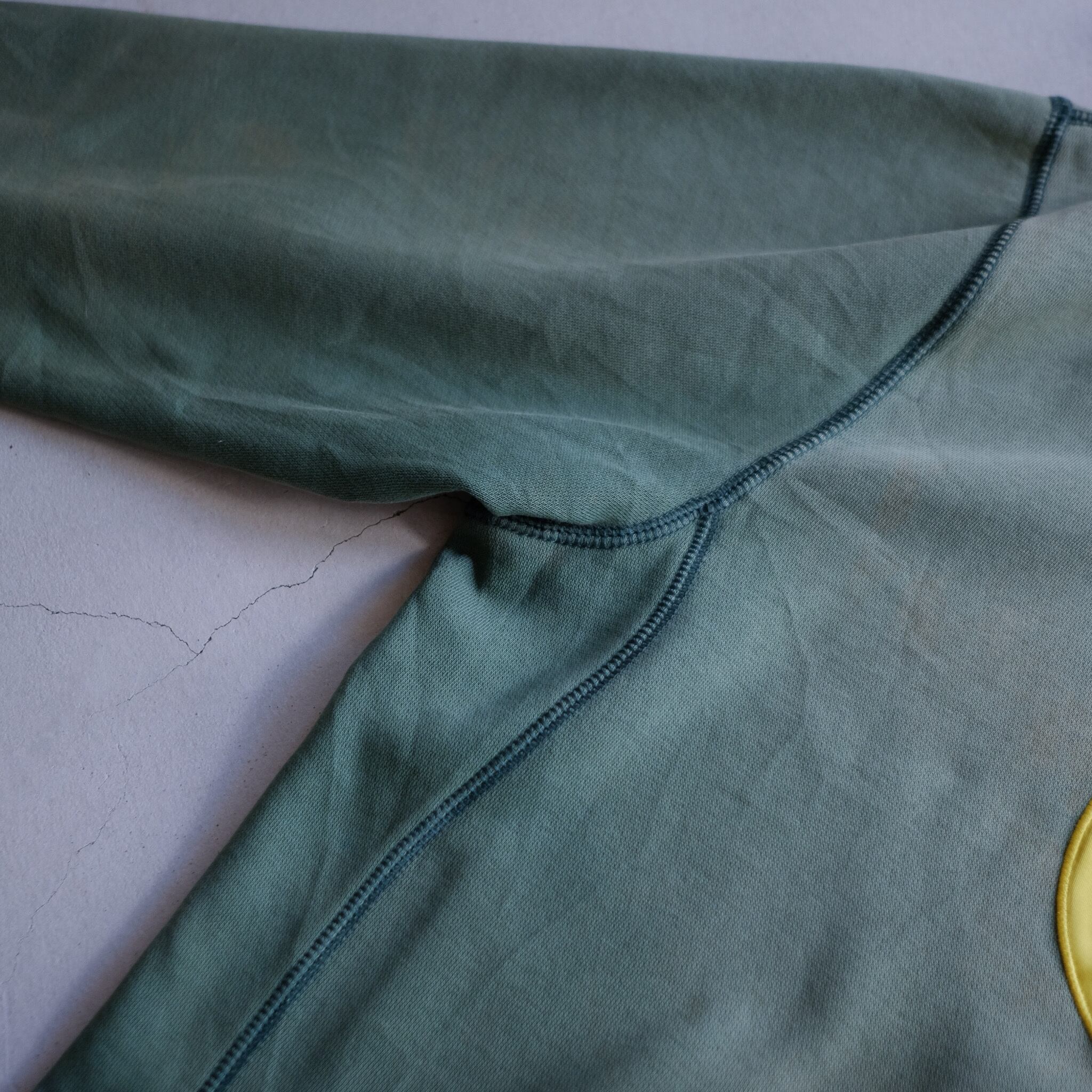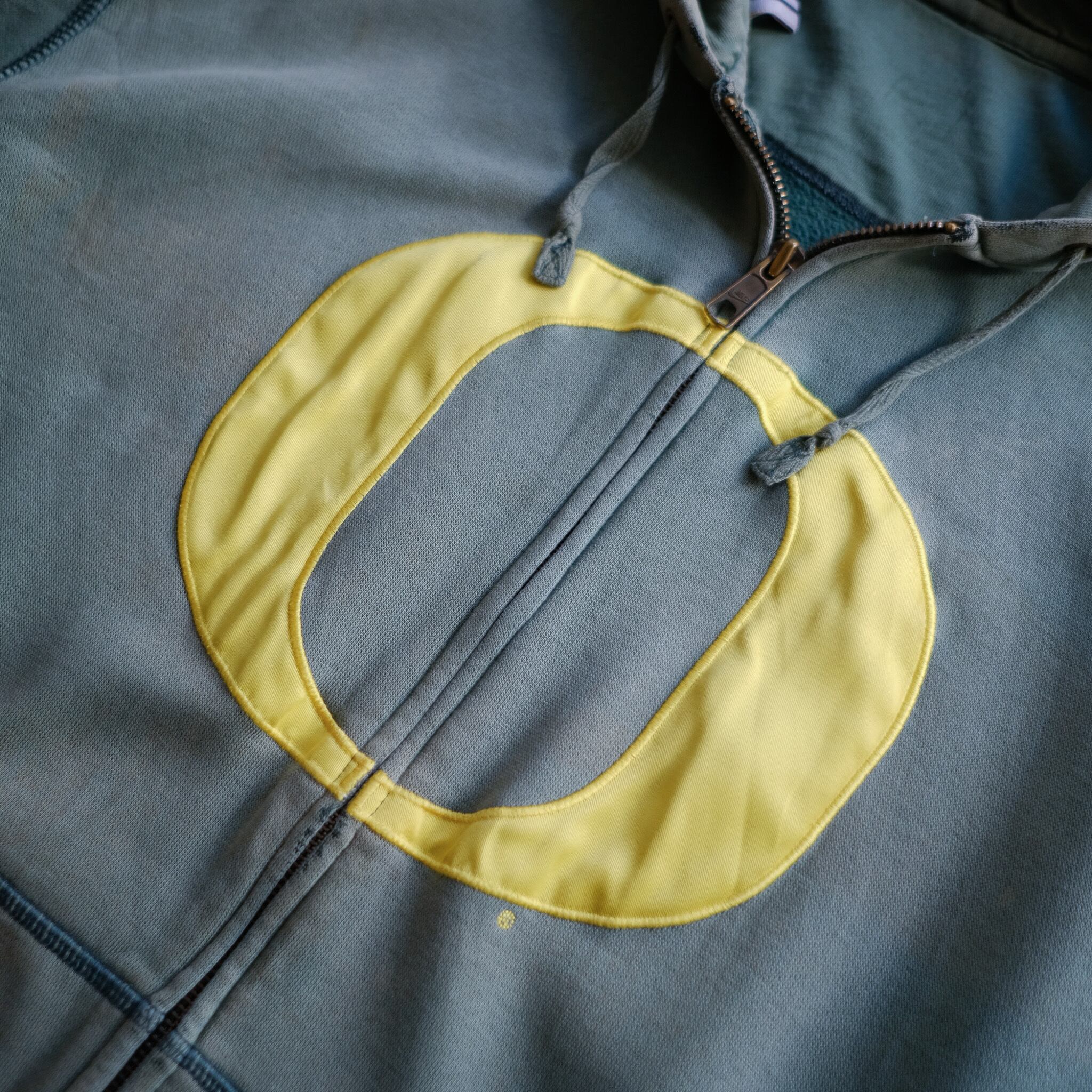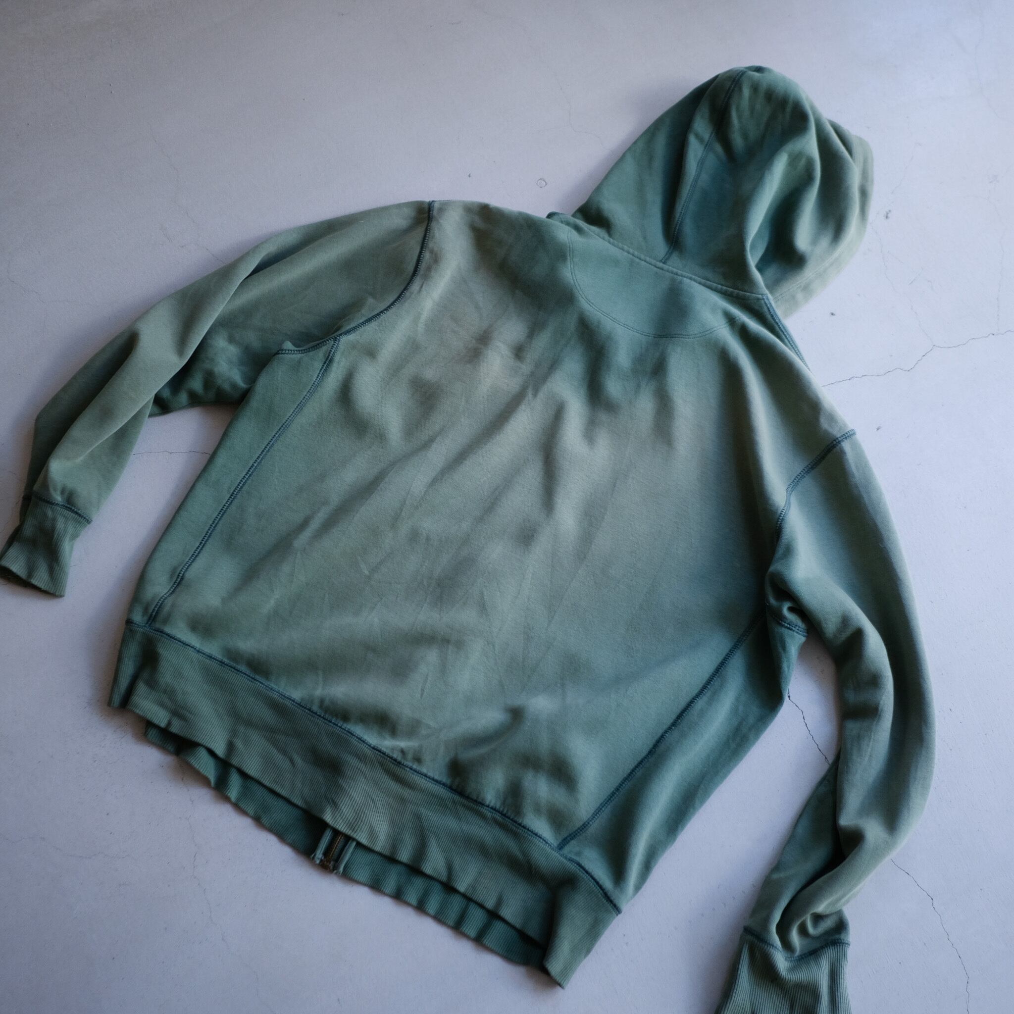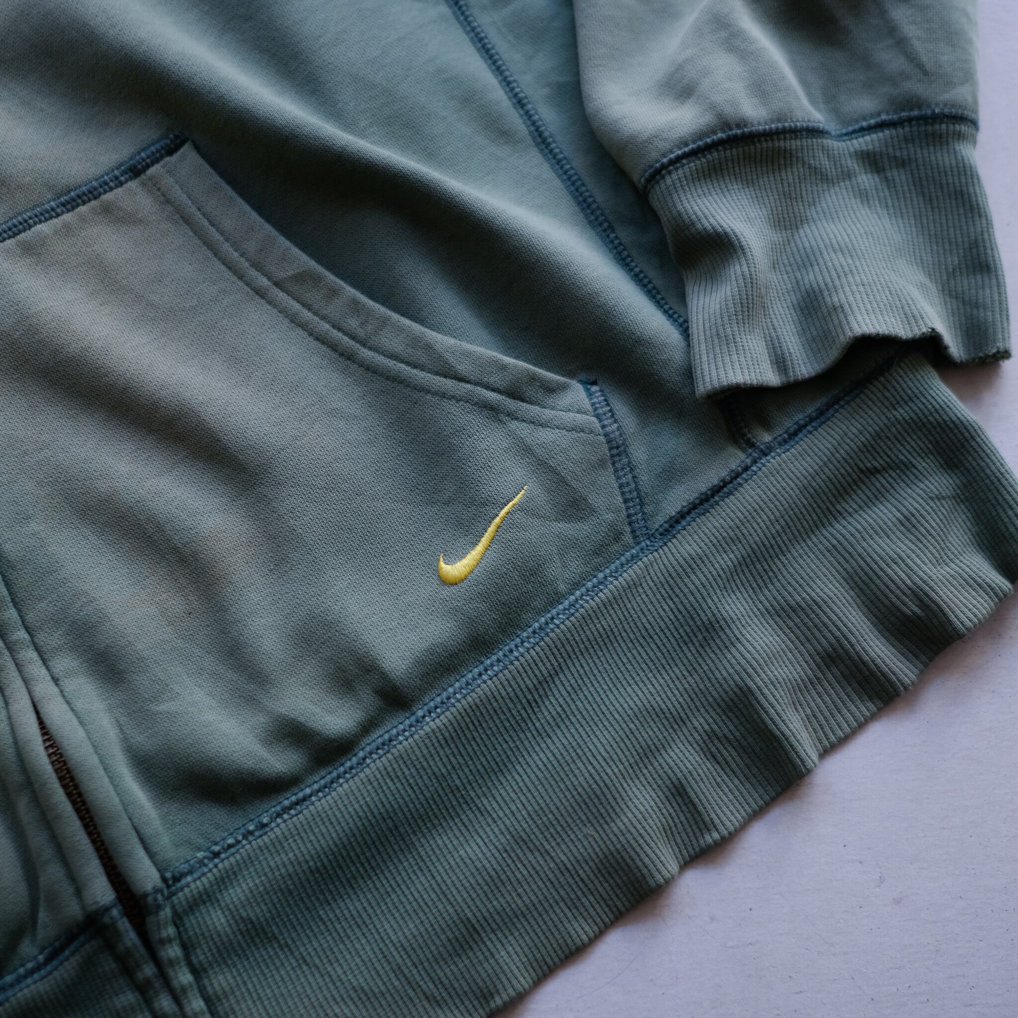2000年代初頭のNIKEのジップアップフーディ。ボディは綺麗なグラデーションのサンフェードグリーン、頭まですっぽり被れる深さのあるフードやショート丈のバランス、身頃の刺繍などジップパーカーの中でも非常に良いデザインの塩梅。ややコンパクトなシルエットもトレンド感のある仕上がり。