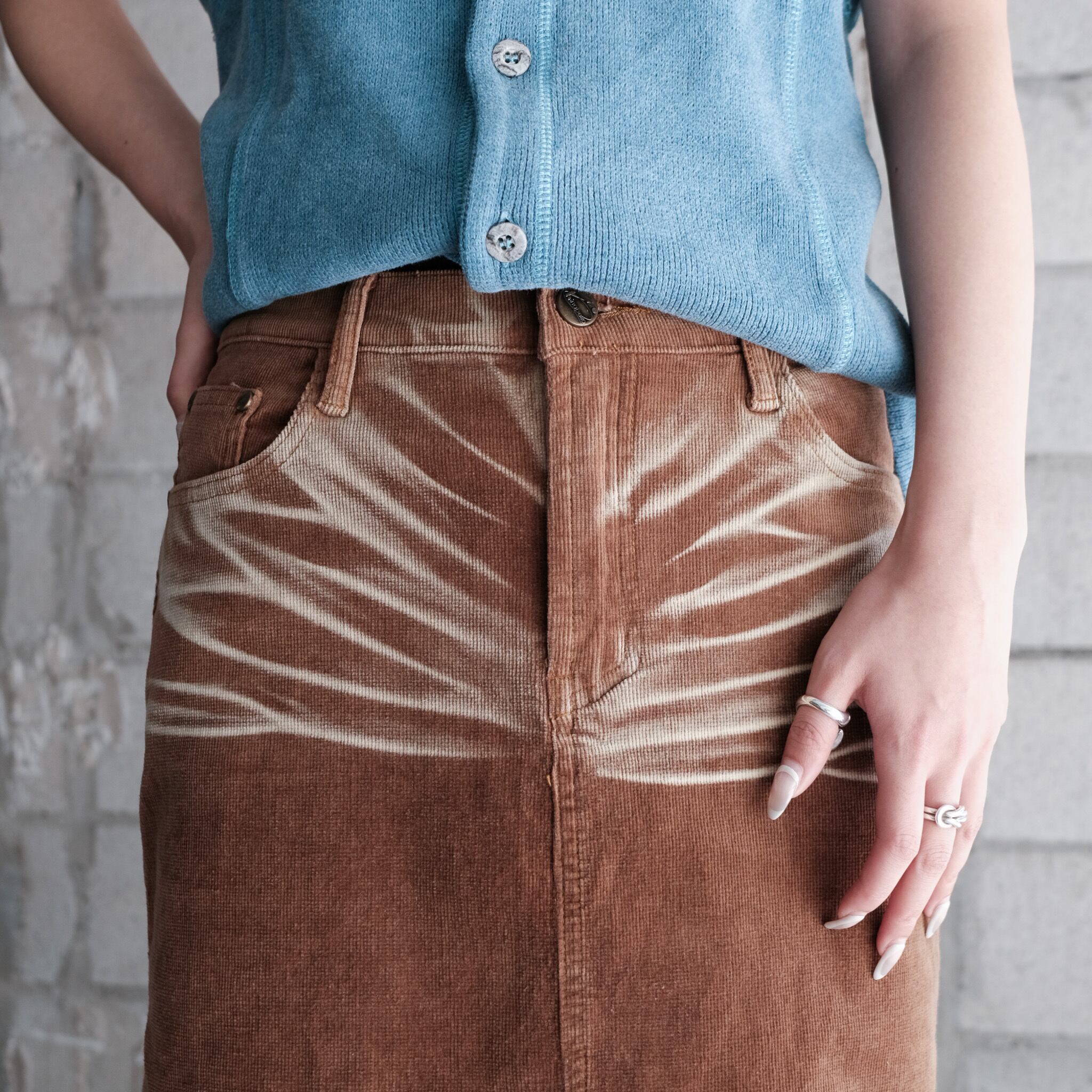 ストレッチの効いたコーデュロイ素材に、不自然な程メリハリのあるダメージ加工が施されたロングスカート。ディテールがシンプルな分、加工が際立ちモードな印象に。ボディのキャラメルカラーも秋冬アイテムと馴染みが良く、存在感が有りながらも使い勝手の良いボトムス。