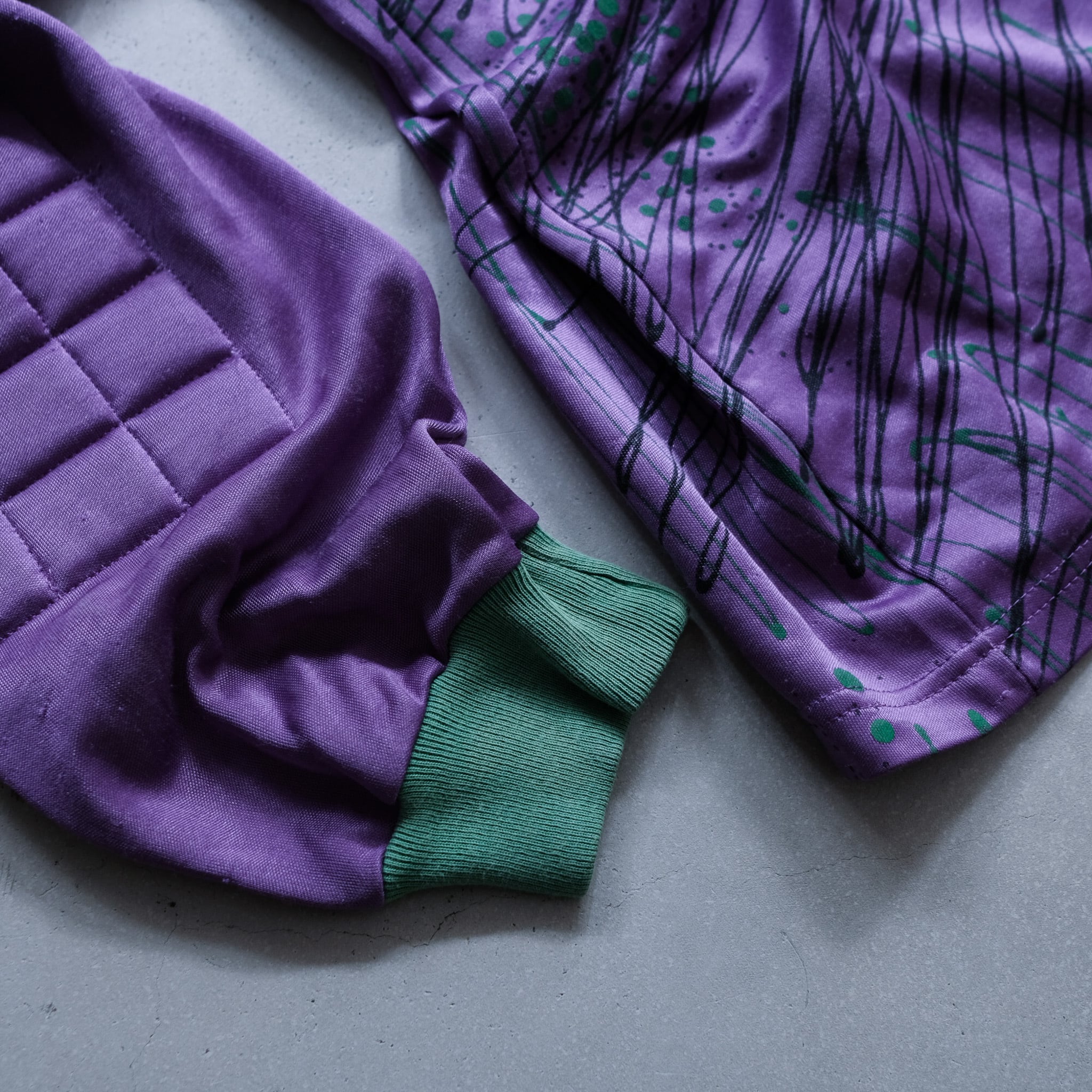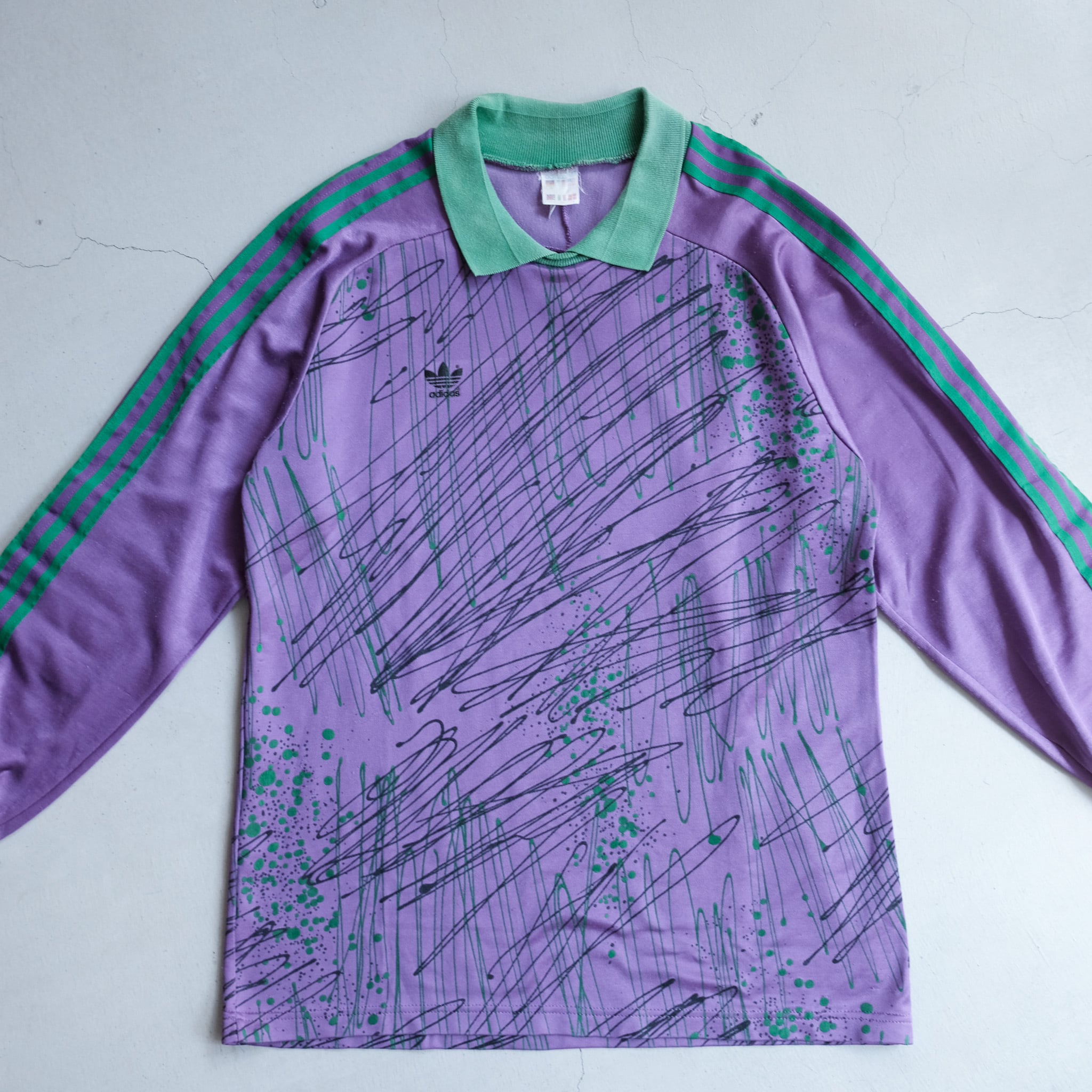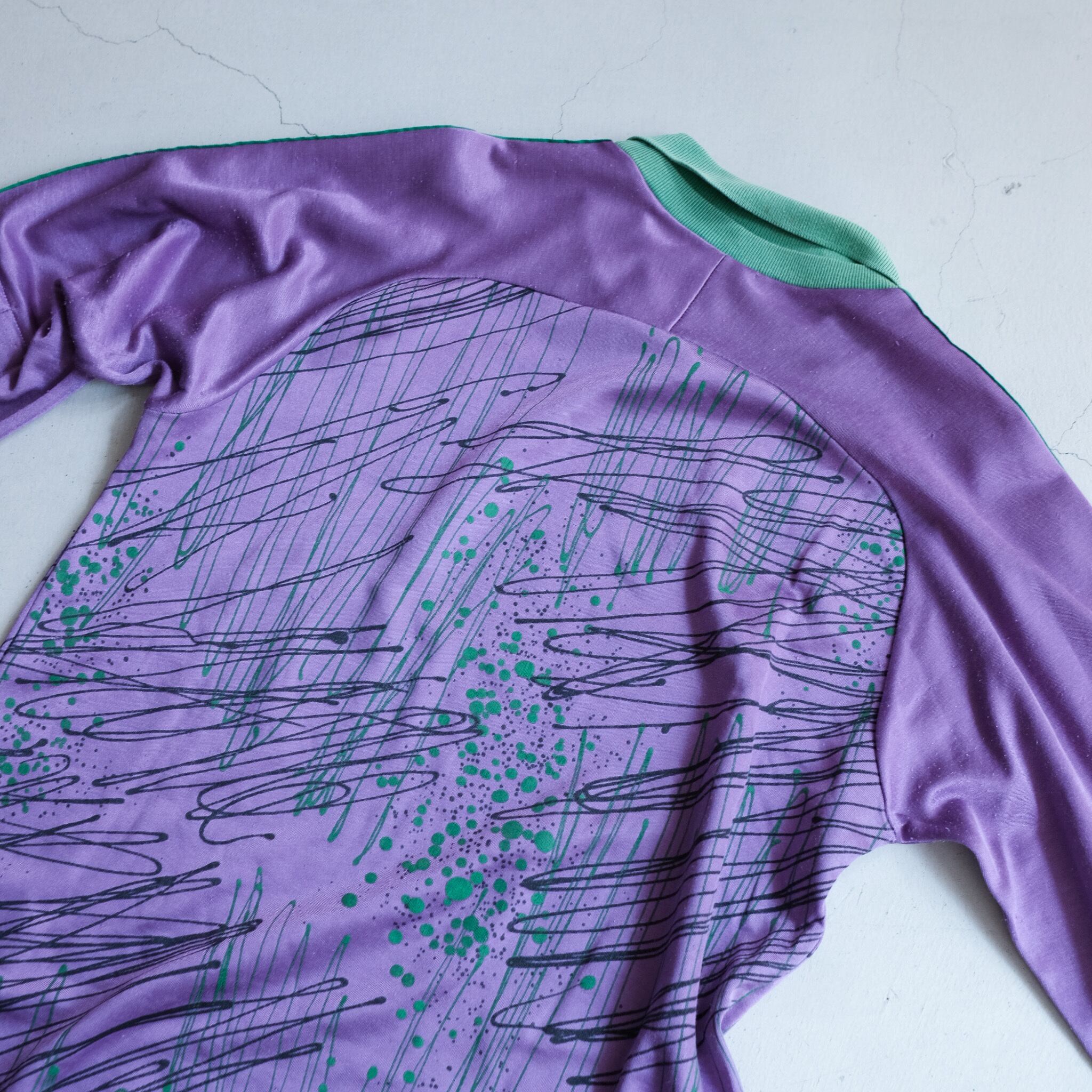 1980年代後半のフランス製adidasから配色の良いゲームシャツ。ハンドドローイングで描かれたようや曲線と、ブラッシングで飛沫が飛んだようなプリントがアートな雰囲気も感じられるグッドプリント。肘部分にキルティングのステッチがあることからキーパー用のユニフォームと推測。パープル、グリーンの組み合わせもファッションに落とし込みやすい好配色。程良くゆとりのあるシルエット。
