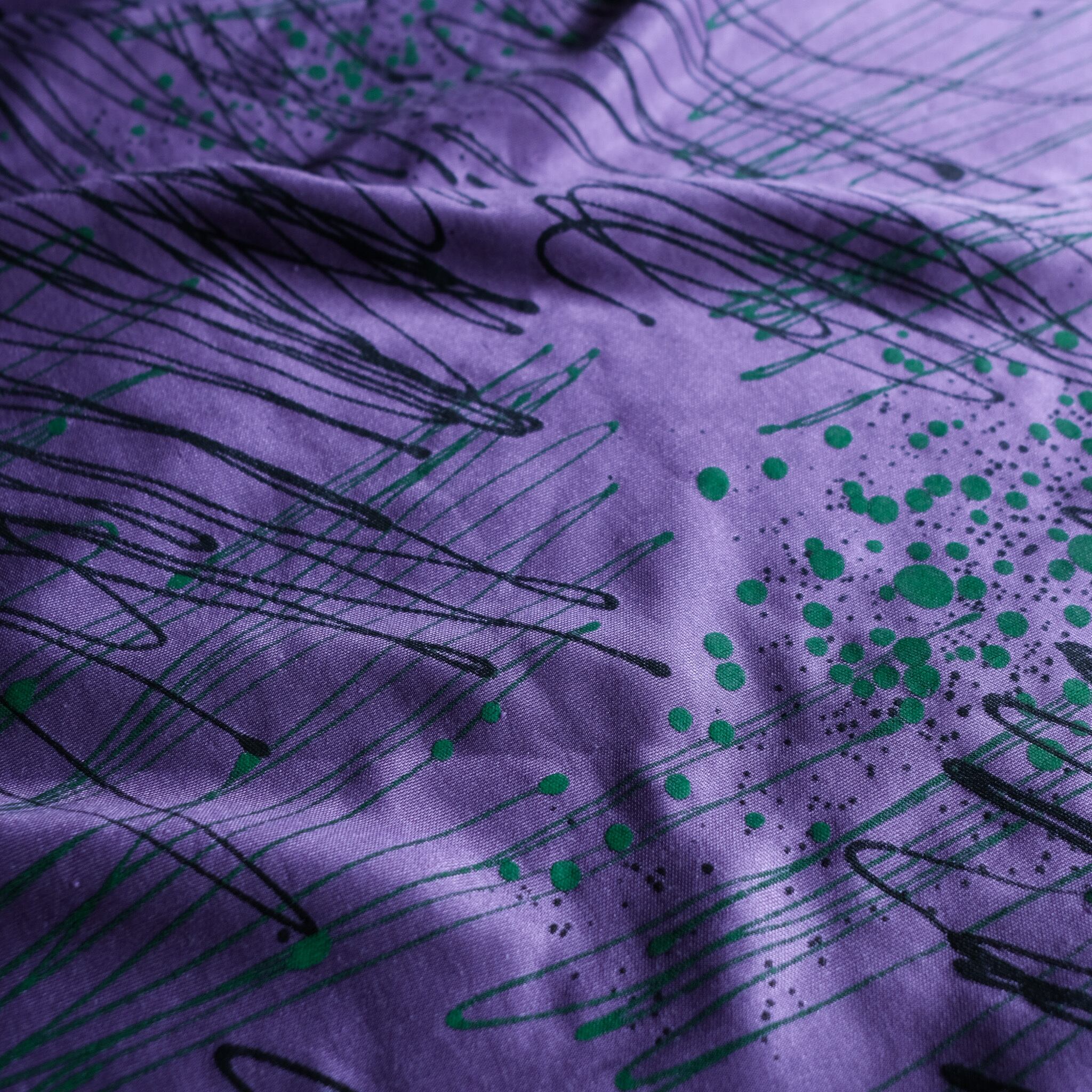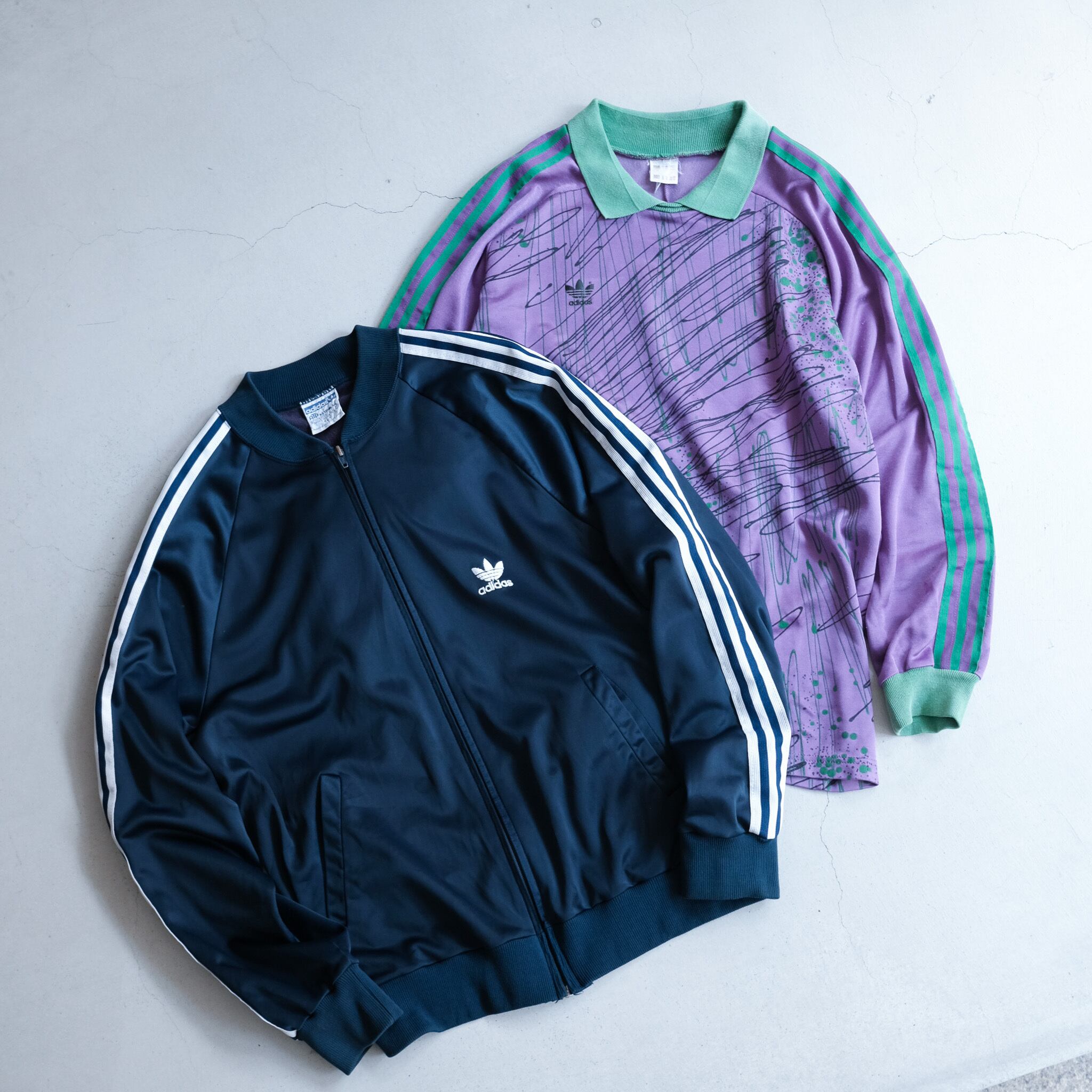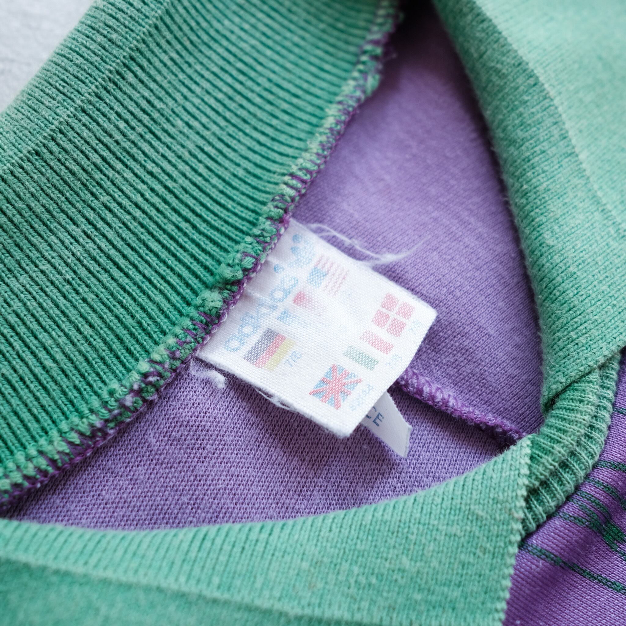 1980年代後半のフランス製adidasから配色の良いゲームシャツ。ハンドドローイングで描かれたようや曲線と、ブラッシングで飛沫が飛んだようなプリントがアートな雰囲気も感じられるグッドプリント。肘部分にキルティングのステッチがあることからキーパー用のユニフォームと推測。パープル、グリーンの組み合わせもファッションに落とし込みやすい好配色。程良くゆとりのあるシルエット。