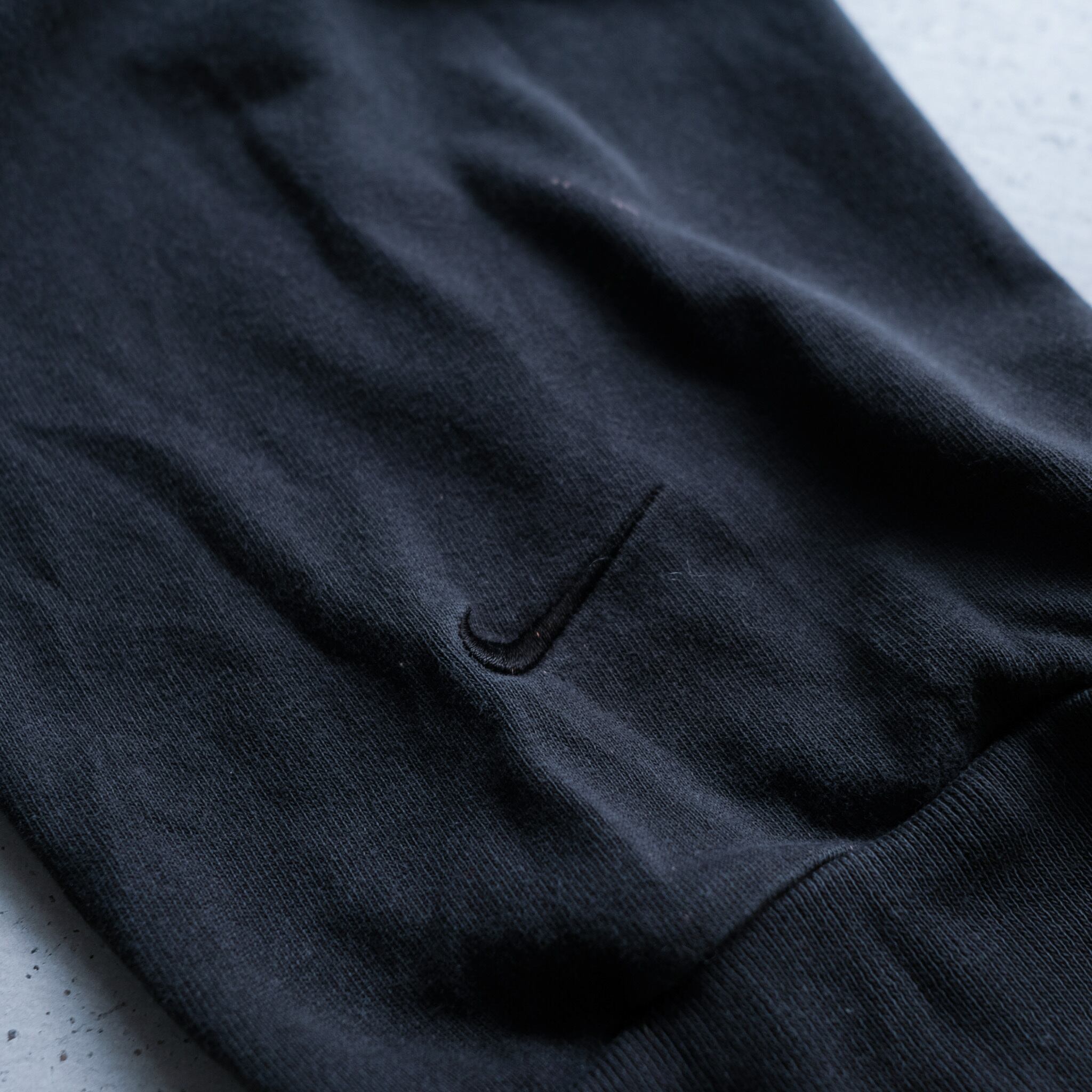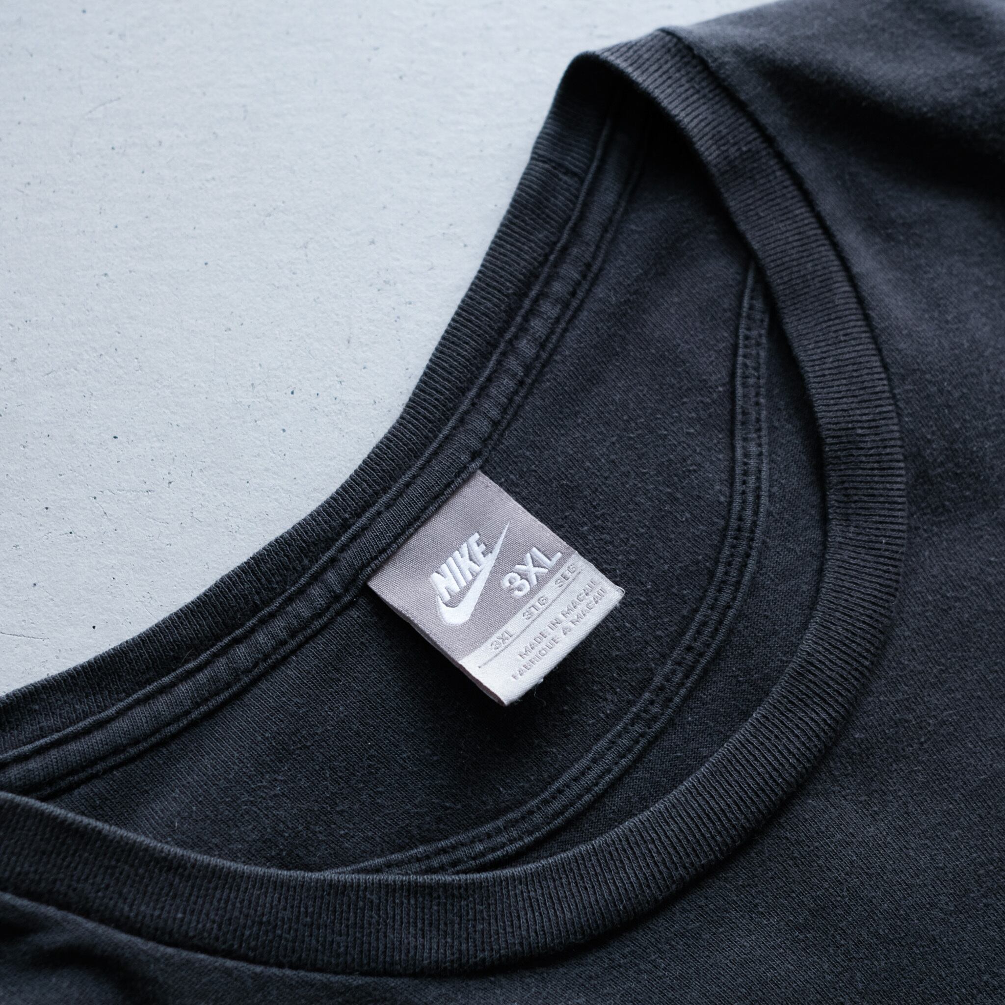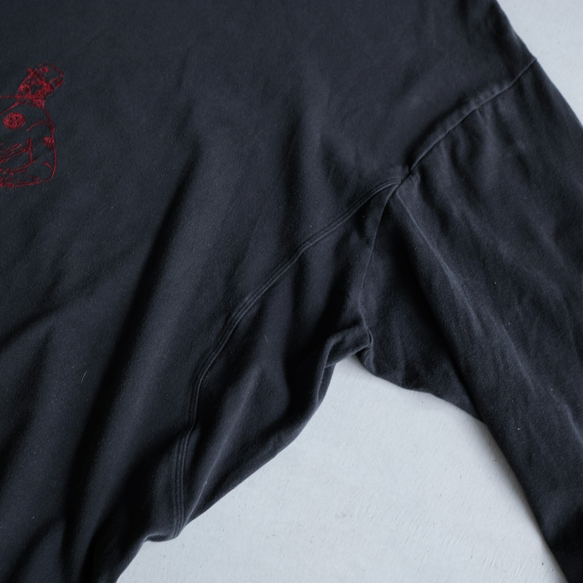 ナイキからこのブランドらしくないビッグサイズの刺繍ロンT。フロント、バック両方に繊細な刺繍で3人の男性が描かれ(恐らくバスケットボール選手)、同ブランドのブルゾン、キャップ、スニーカーまで丁寧にナイキのスウォッシュが配されている。ボディには同色で大判の英字プリント。また、脇線が湾曲しており、ロンTとしての作りも拘った使用に。古着では特に見つけるのが困難な"良いロンT"の中でも、クオリティの高い一品。
