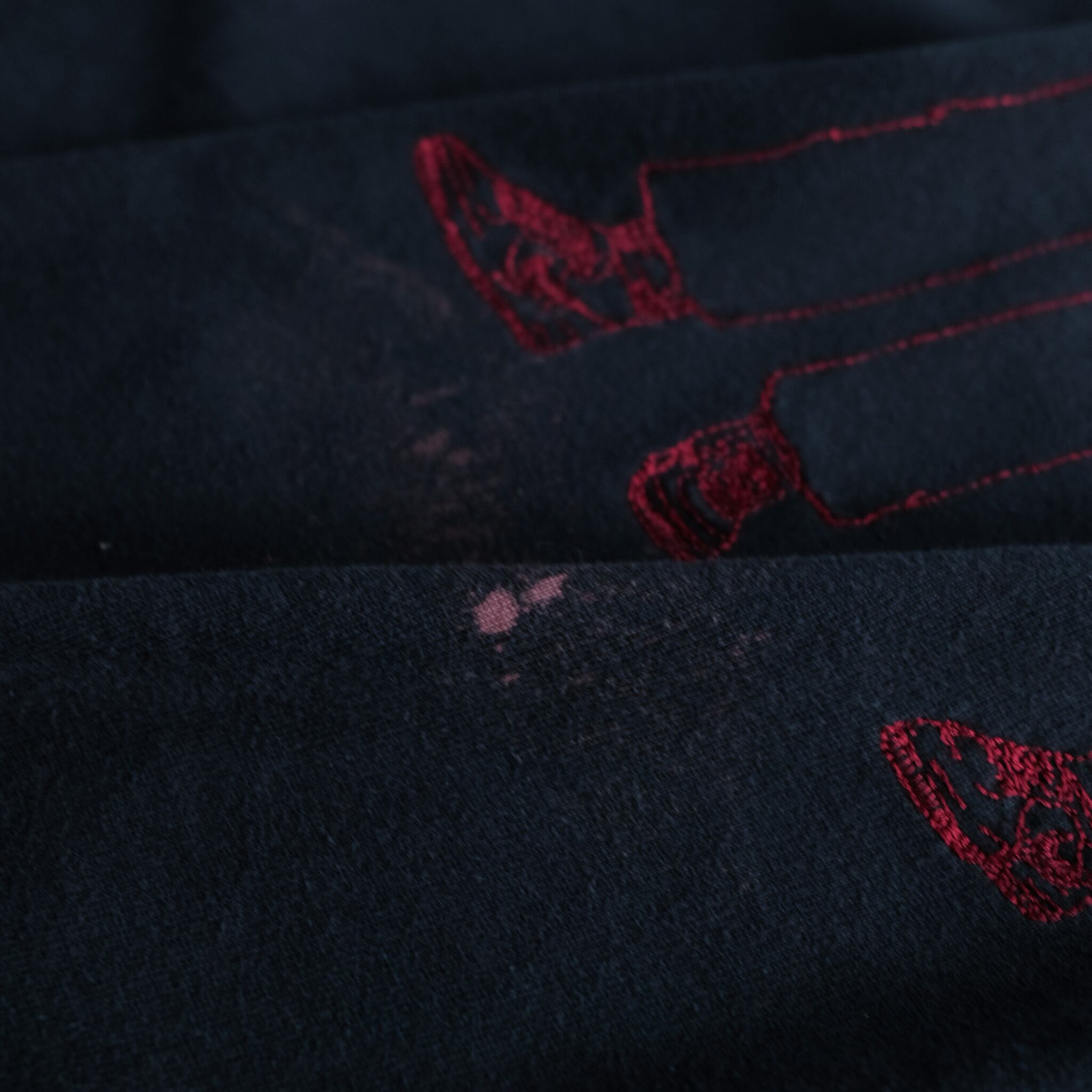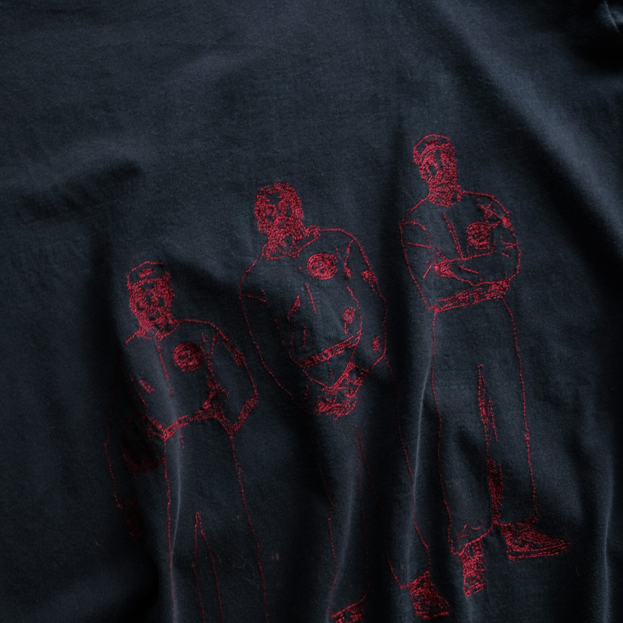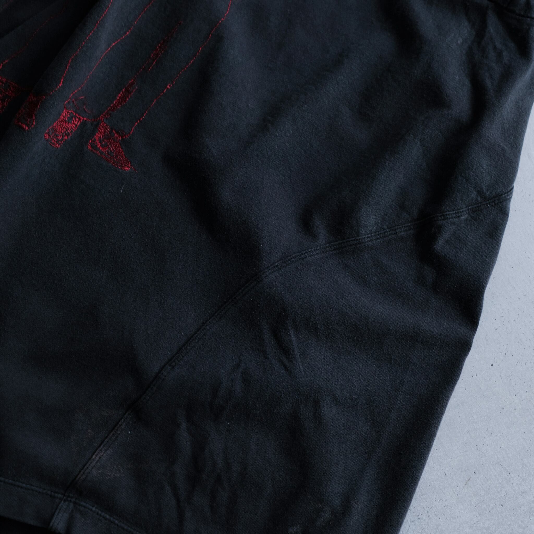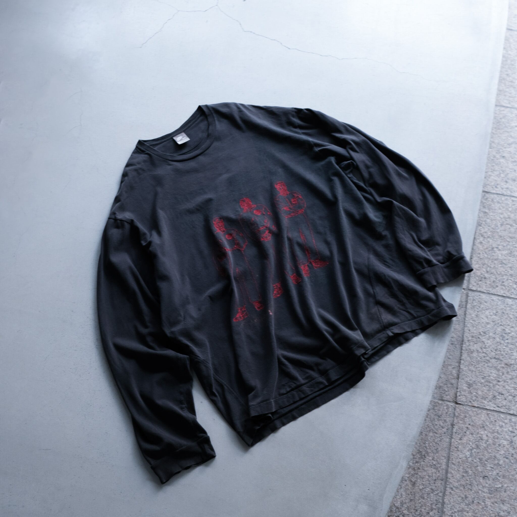 ナイキからこのブランドらしくないビッグサイズの刺繍ロンT。フロント、バック両方に繊細な刺繍で3人の男性が描かれ(恐らくバスケットボール選手)、同ブランドのブルゾン、キャップ、スニーカーまで丁寧にナイキのスウォッシュが配されている。ボディには同色で大判の英字プリント。また、脇線が湾曲しており、ロンTとしての作りも拘った使用に。古着では特に見つけるのが困難な"良いロンT"の中でも、クオリティの高い一品。