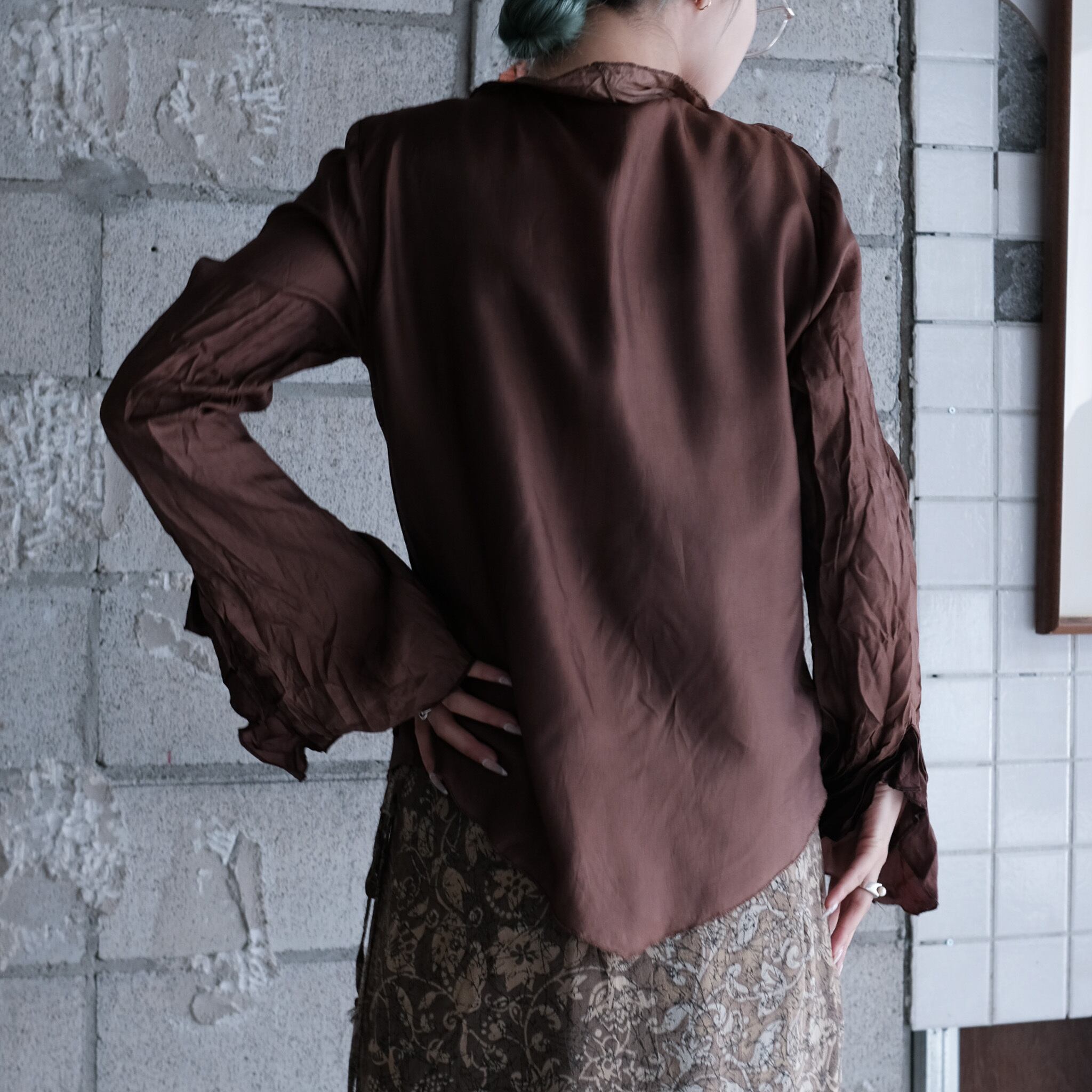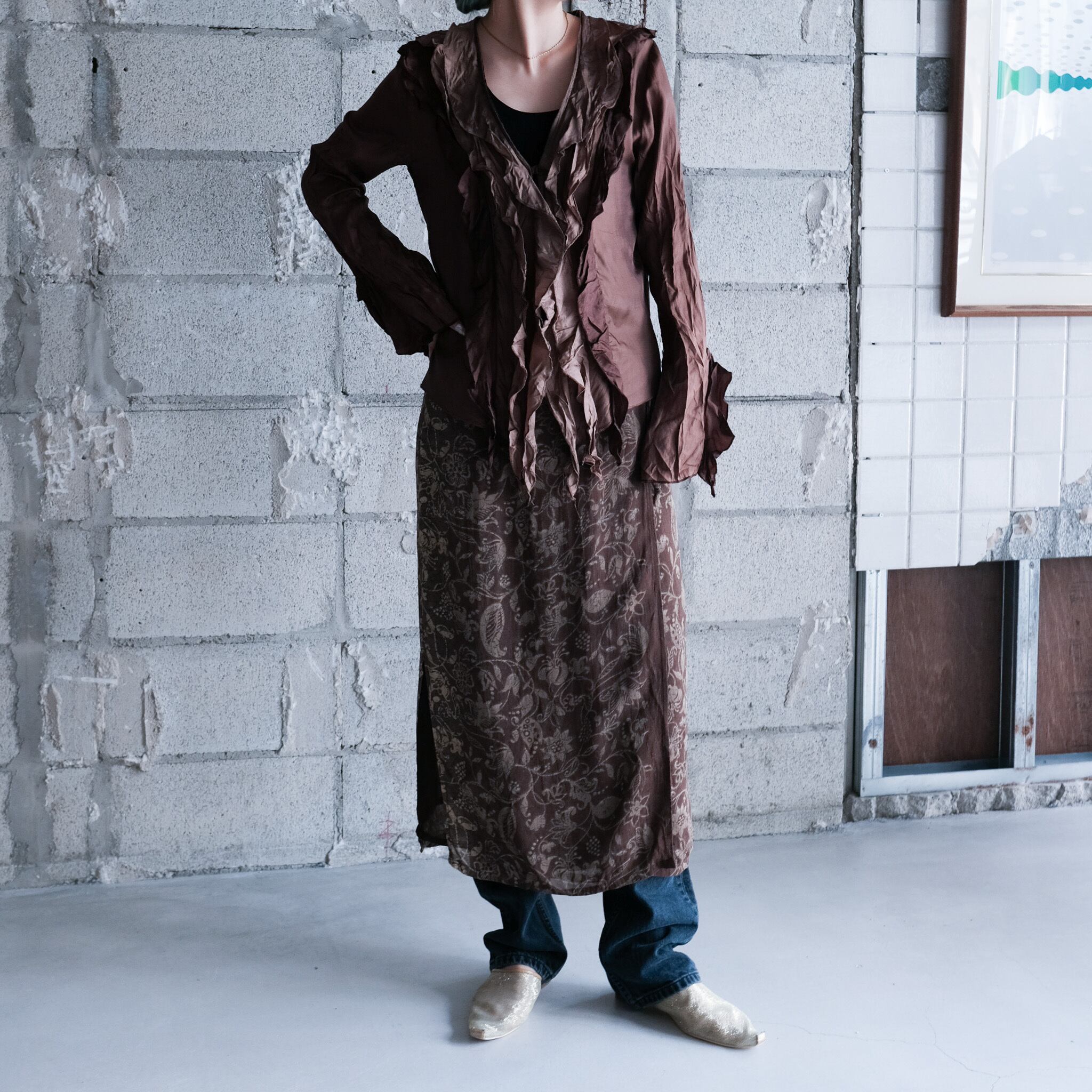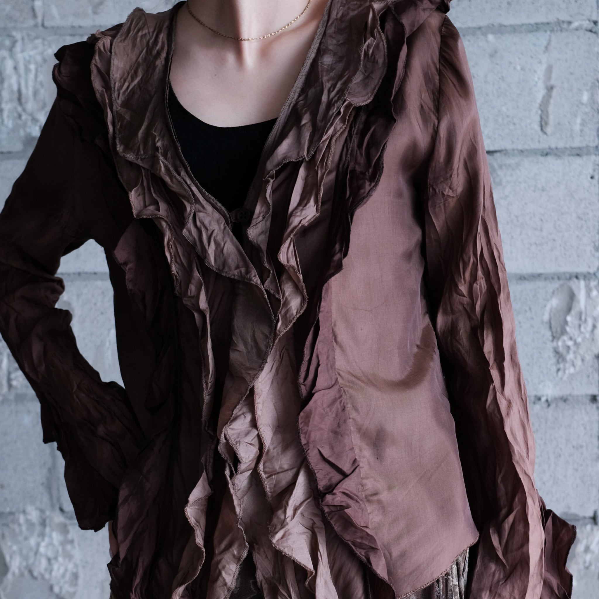 フロントと袖口に施されたフリルのデザインが特徴的なイタリアメイドのフリルブラウス。フリル毎にブラウンの濃淡が異なり、奥行きのある見え方に。身頃と袖口にはシワ加工が施された一枚でスタイリングの主役になるデザイントップス。