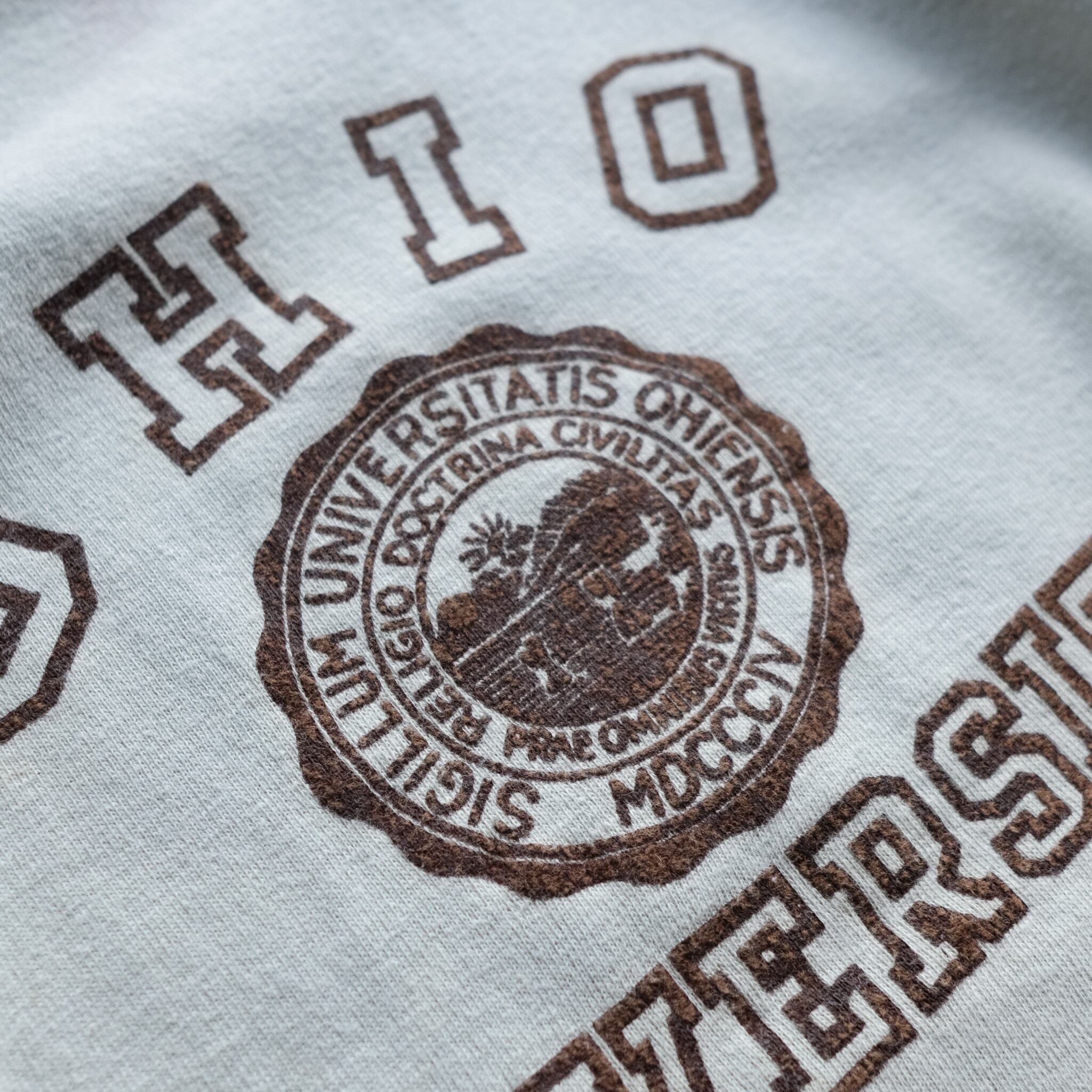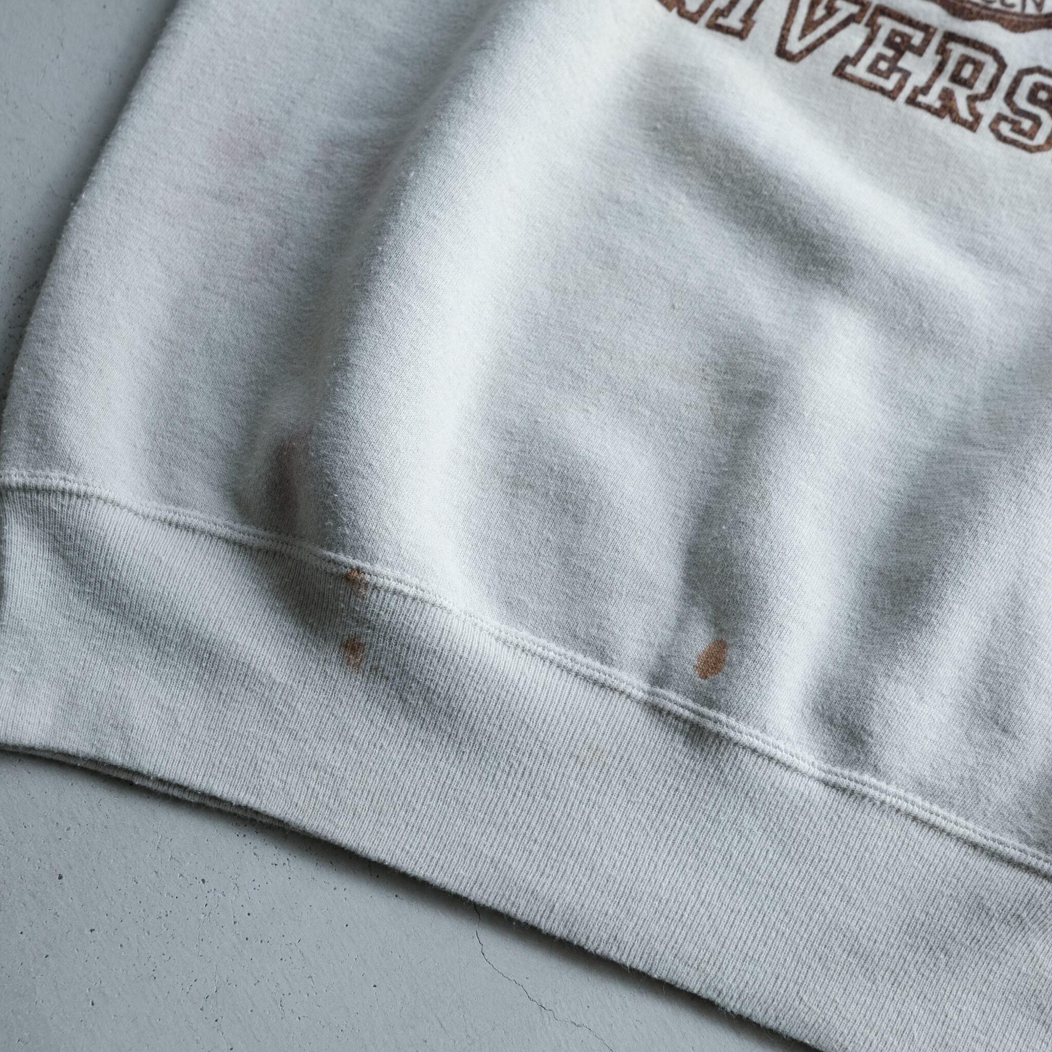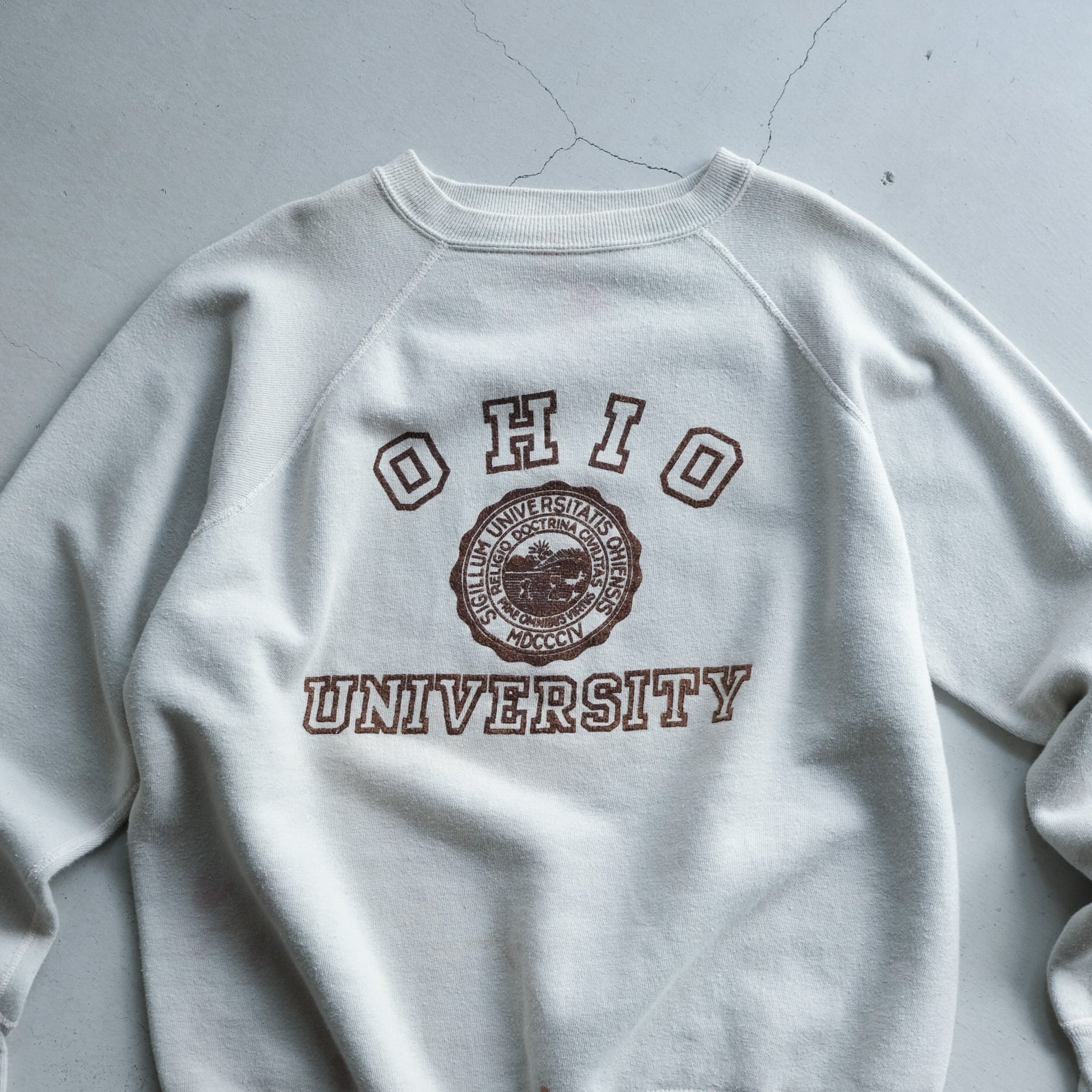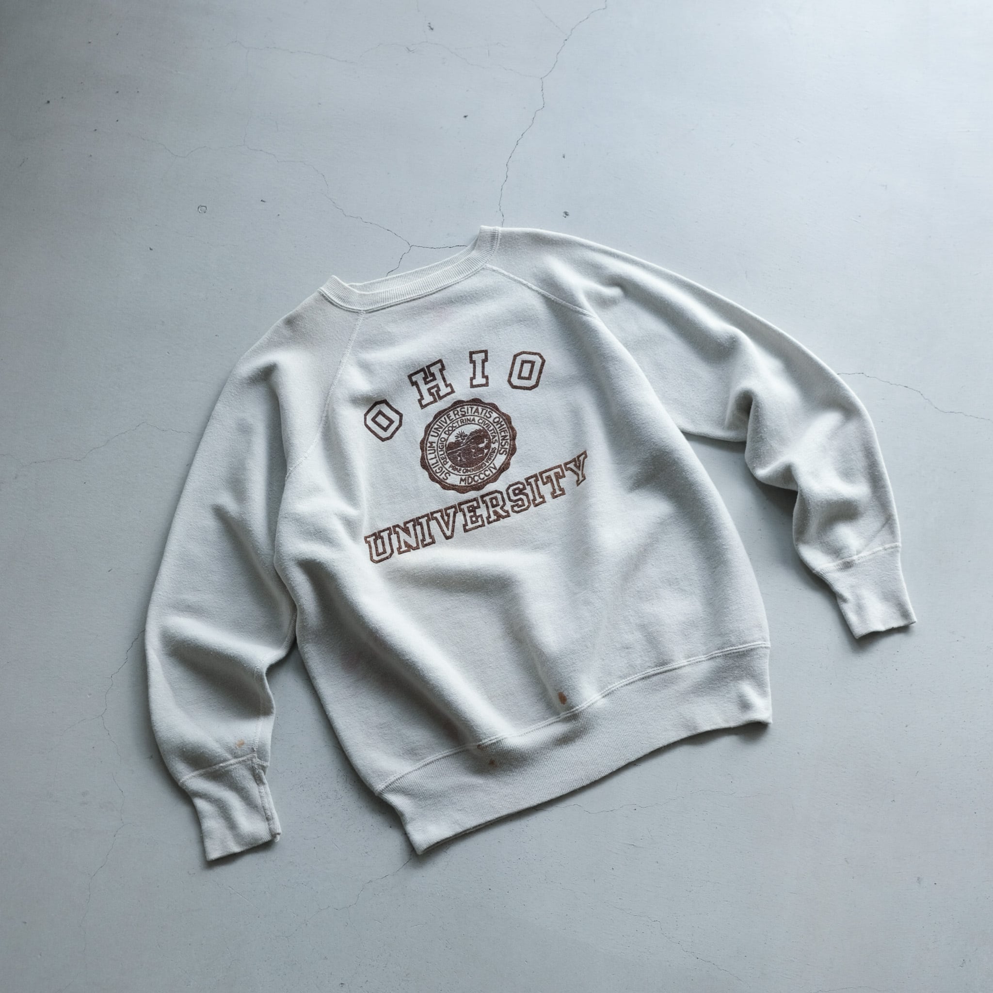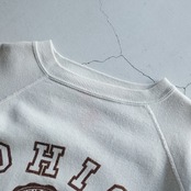 オハイオ大学のカレッジプリントが施された1960年代のスウェットシャツ。アイボリーカラーのボディに、微かに残るブラウンのブラッキープリントが好配色。この年代のスウェットにしてはやや大きめのサイジングで、着こなしの幅が広がるヴィンテージスウェット。