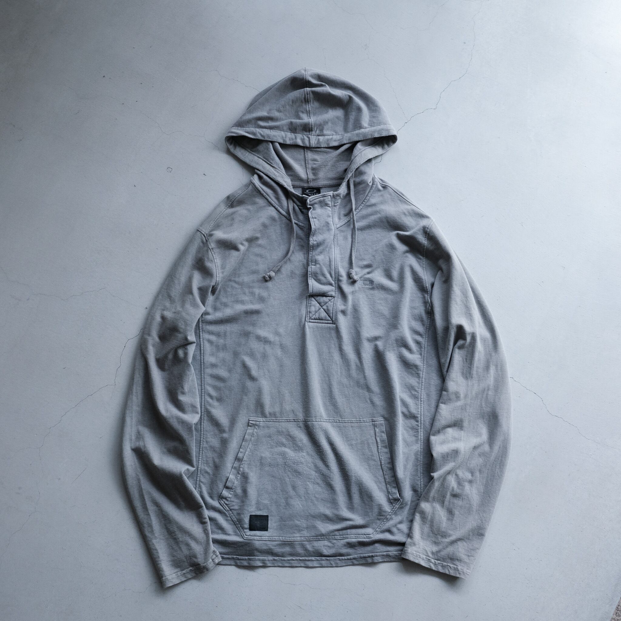 人気のOAKLEYからロングスリーブフーディ。古着史上で比較的球数の少ないカテゴリー。薄地のカットソー素材に、スッキリした縦長のシルエット。大きめの作りのフードは、キャップ等の着用時にもすっぽりと収まる大きさ。レイヤードにも使い勝手の良い一枚。
