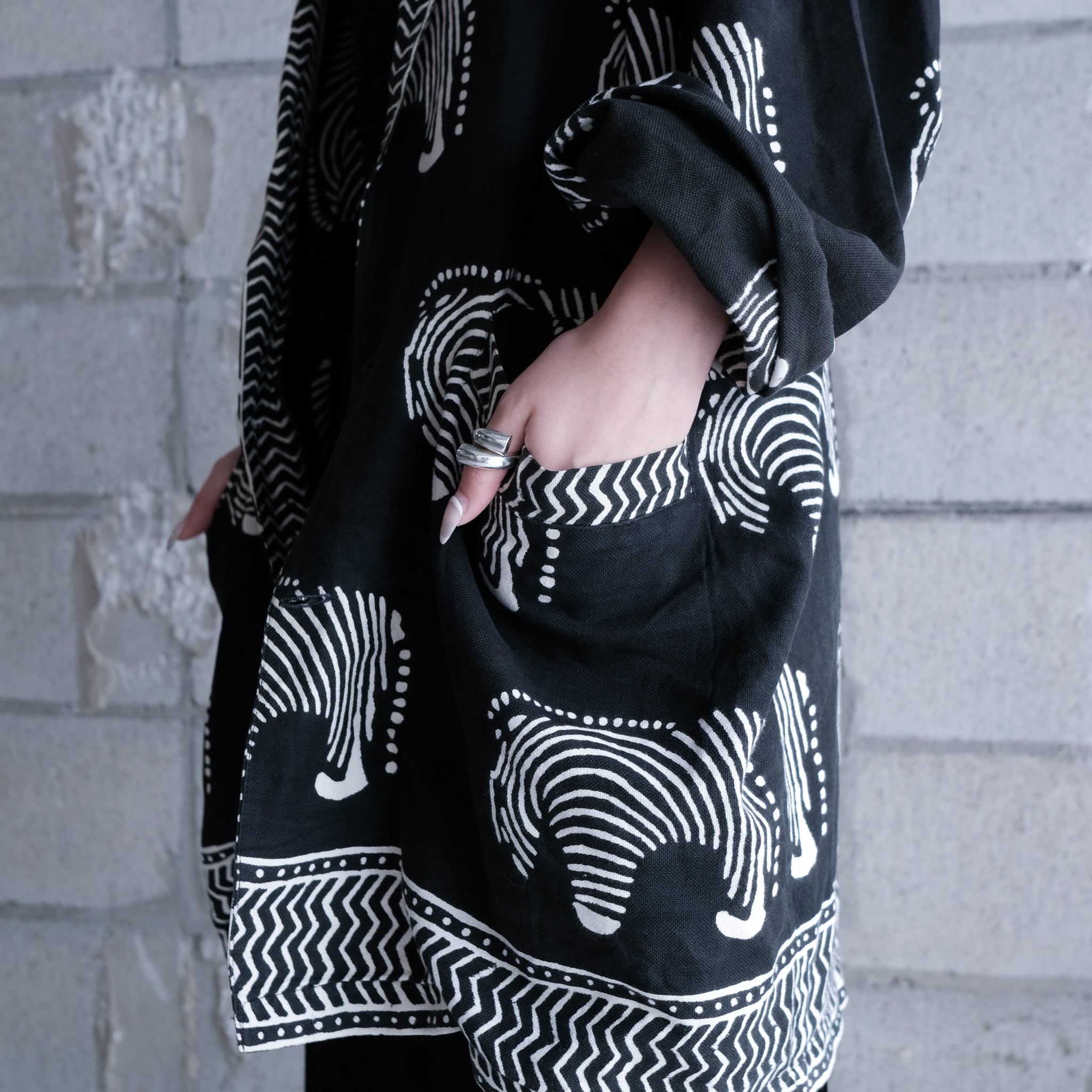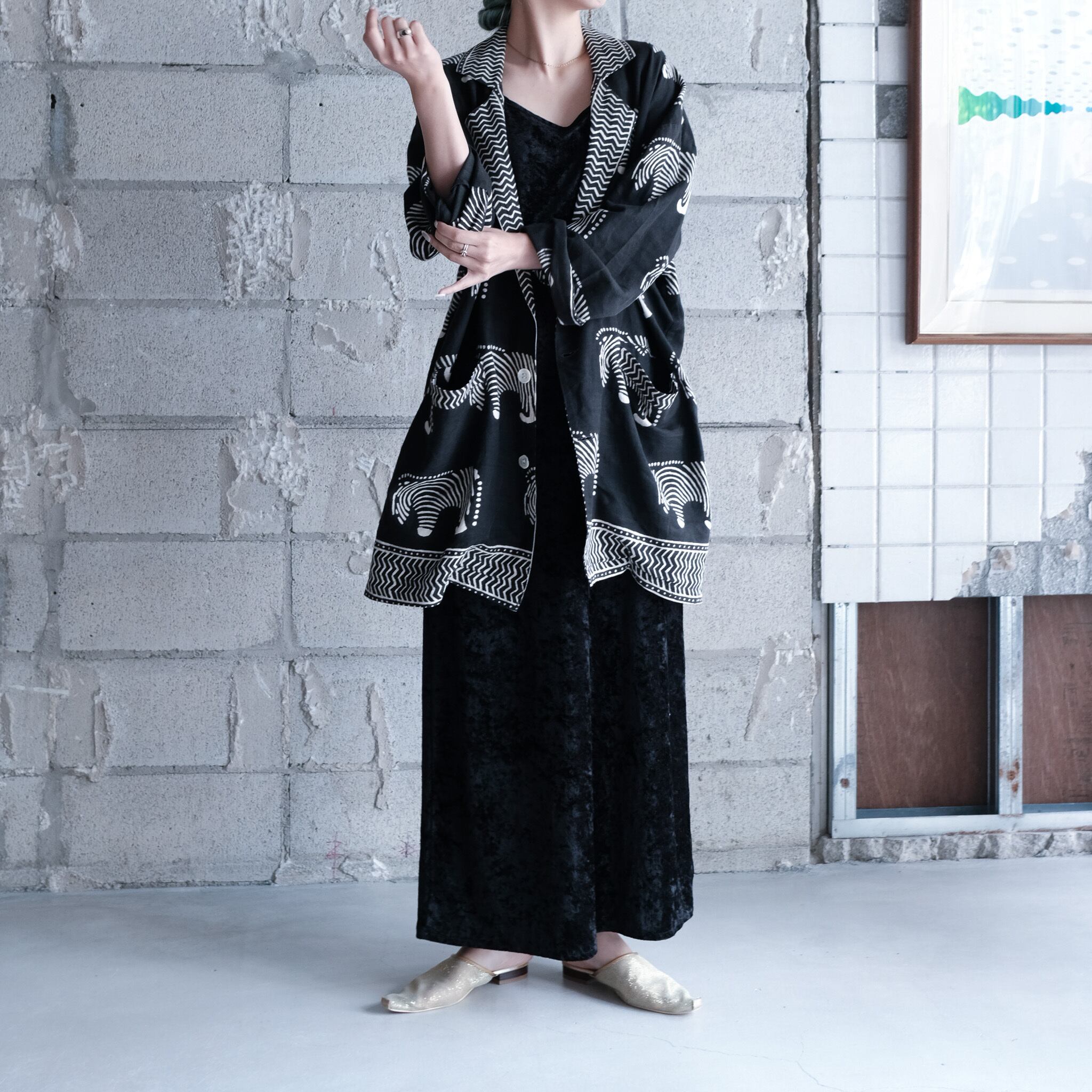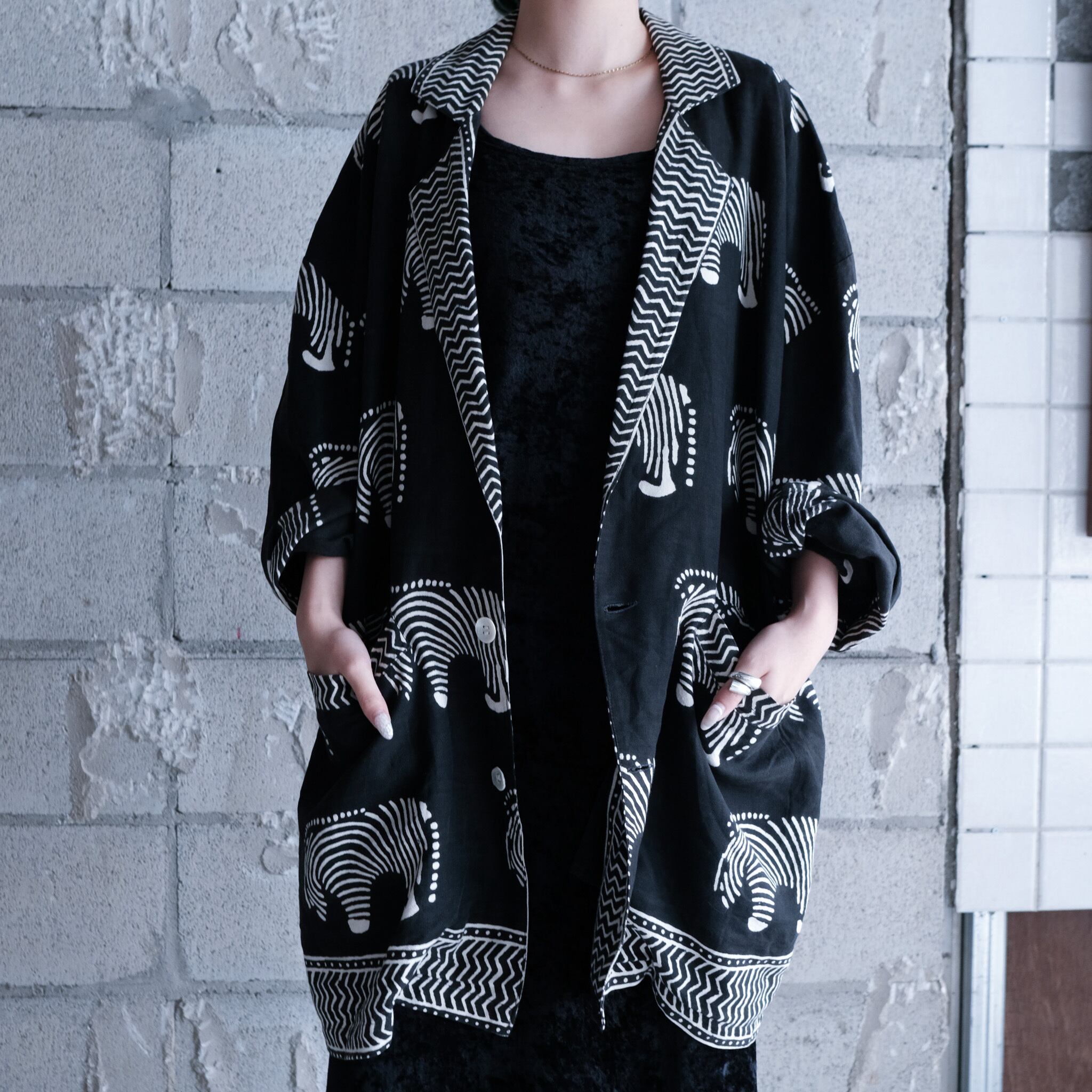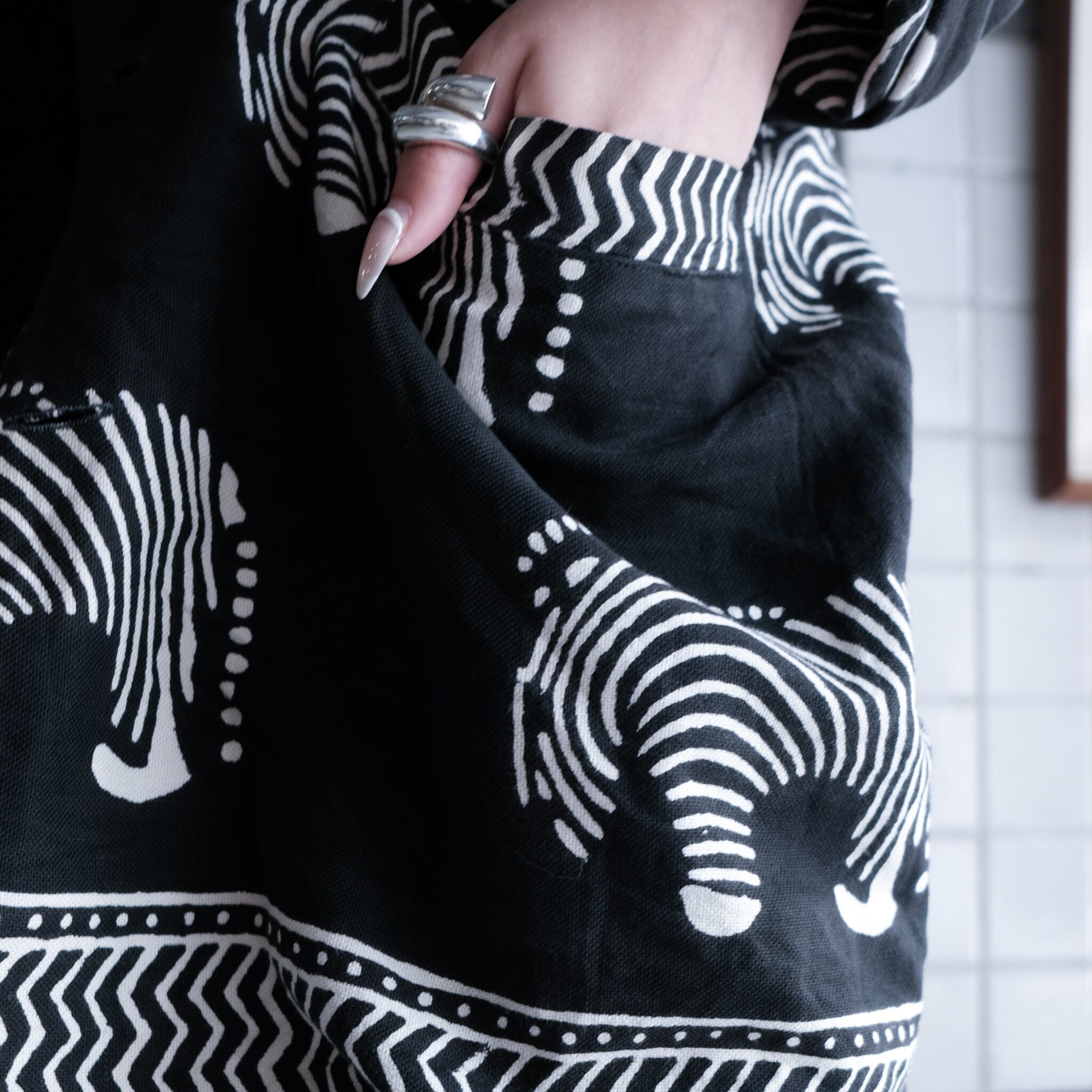インドメイドの雰囲気のある素材が特徴的な総柄ジャケット。形はオーバーサイズのテーラードジャケット。ポップになりすぎない抽象的なシマウマモチーフの柄とドロップした肩周りがモード感のある仕上がりに。スタイリングによって表情を変えてくれる春先や秋口に丁度良いライトアウター。