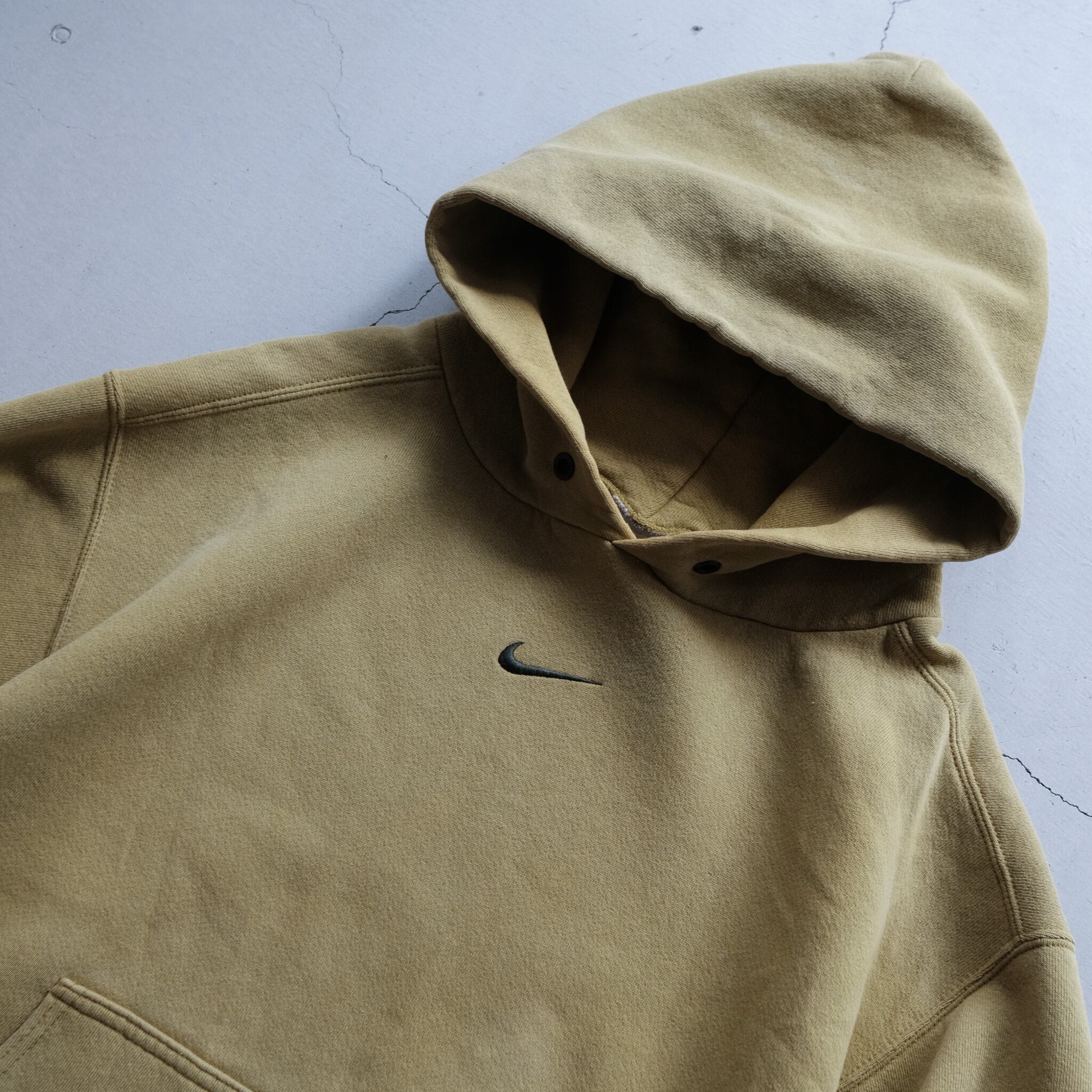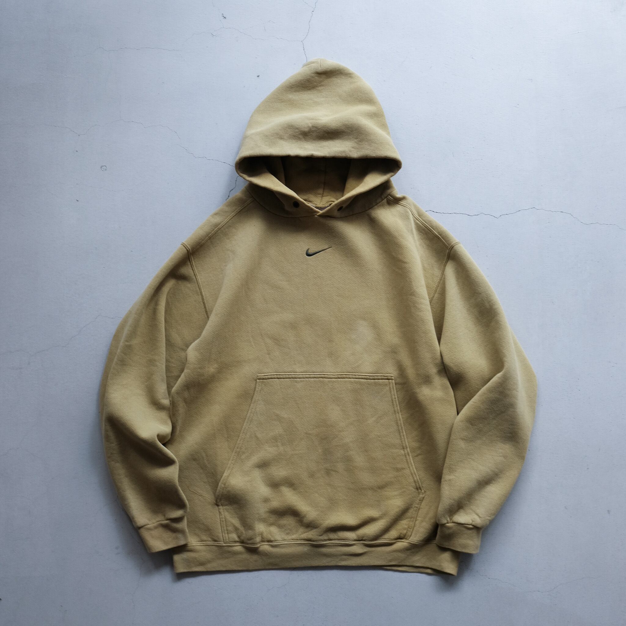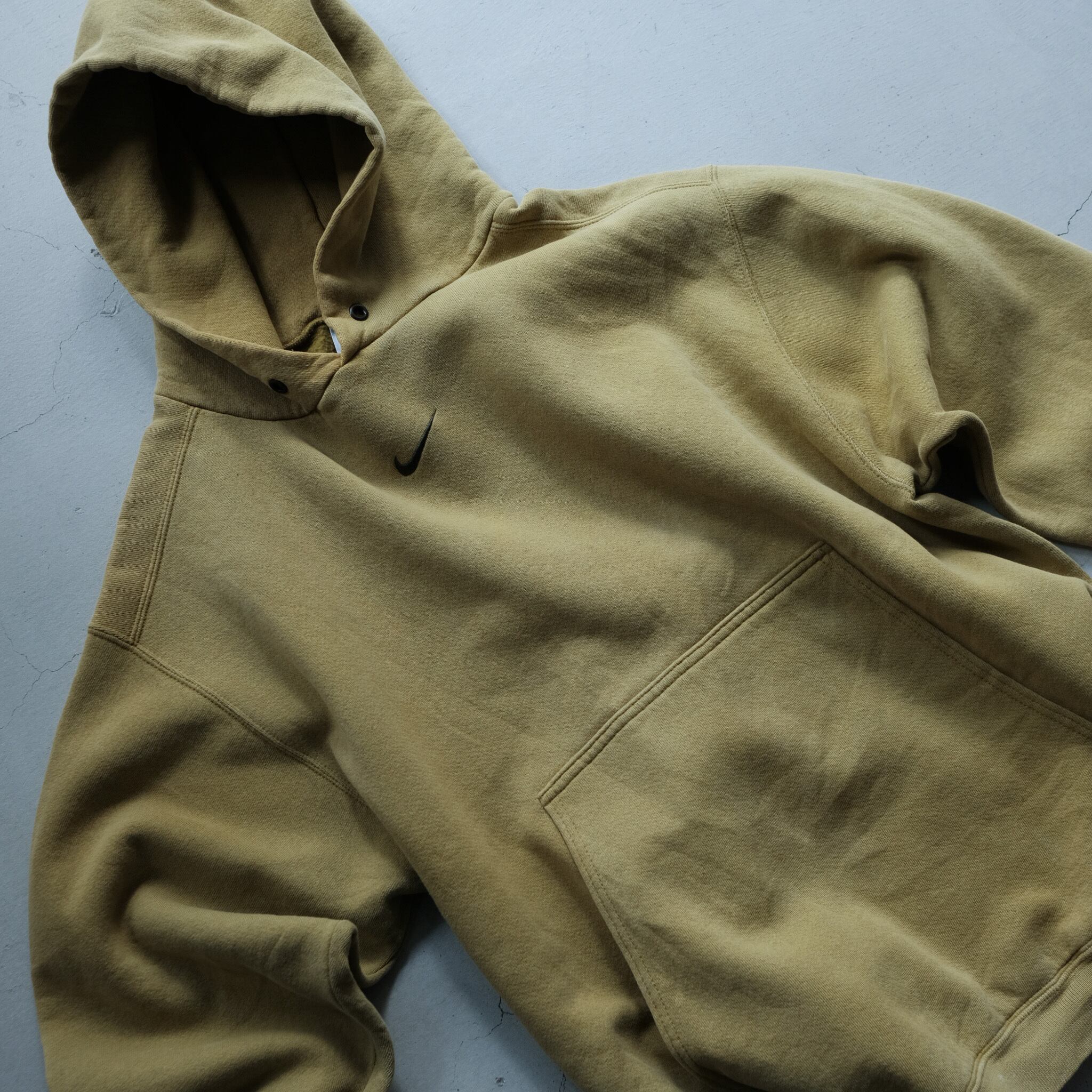 著名人の着用等もあり、NIKEの中でも特に人気のセンターにスウォッシュが配置されたスウェットフーディ。こちらはさらに希少性の高いスモーキーイエローのカラー。ポケットの作りが大きく、裾のリブ幅のみ細め。寸法で見るとコンパクトに見えますが、太いアームホームや全体のバランスで、非常に収まりの良い綺麗なシルエットに。フードを顔周りに寄った作りになっており、デザイン、カラー、シルエットどれも今の気分にはまる一枚。