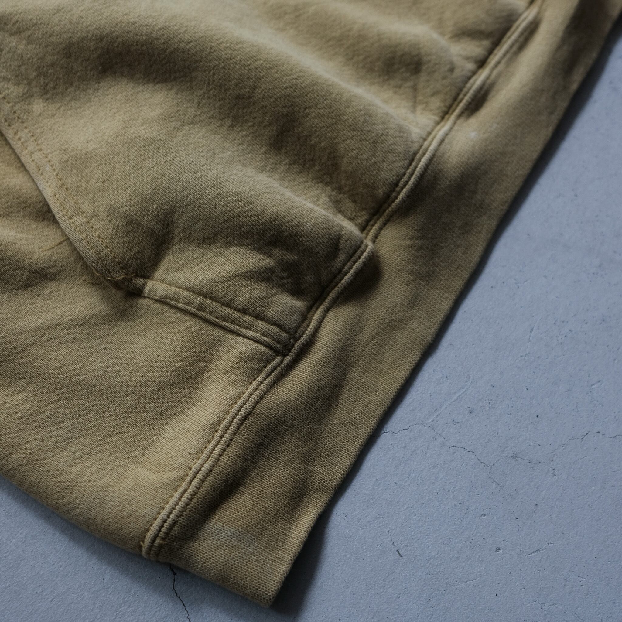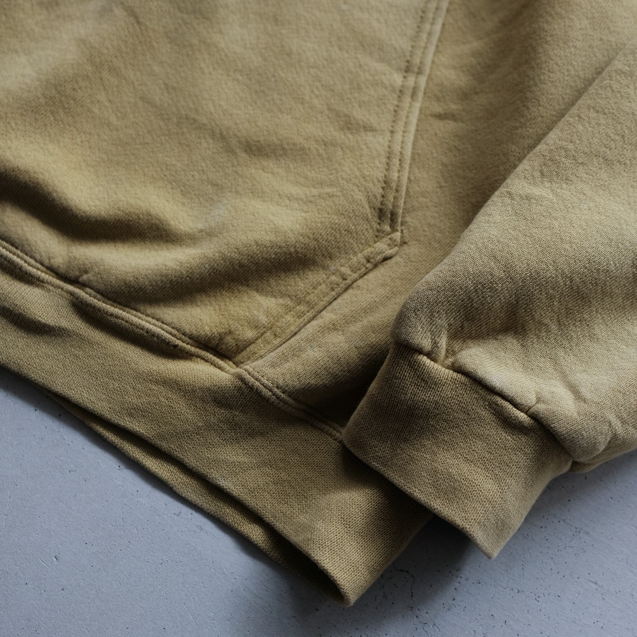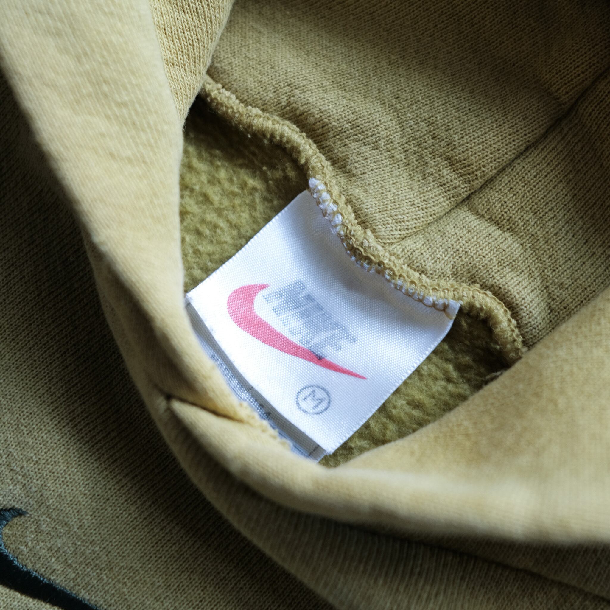 著名人の着用等もあり、NIKEの中でも特に人気のセンターにスウォッシュが配置されたスウェットフーディ。こちらはさらに希少性の高いスモーキーイエローのカラー。ポケットの作りが大きく、裾のリブ幅のみ細め。寸法で見るとコンパクトに見えますが、太いアームホームや全体のバランスで、非常に収まりの良い綺麗なシルエットに。フードを顔周りに寄った作りになっており、デザイン、カラー、シルエットどれも今の気分にはまる一枚。