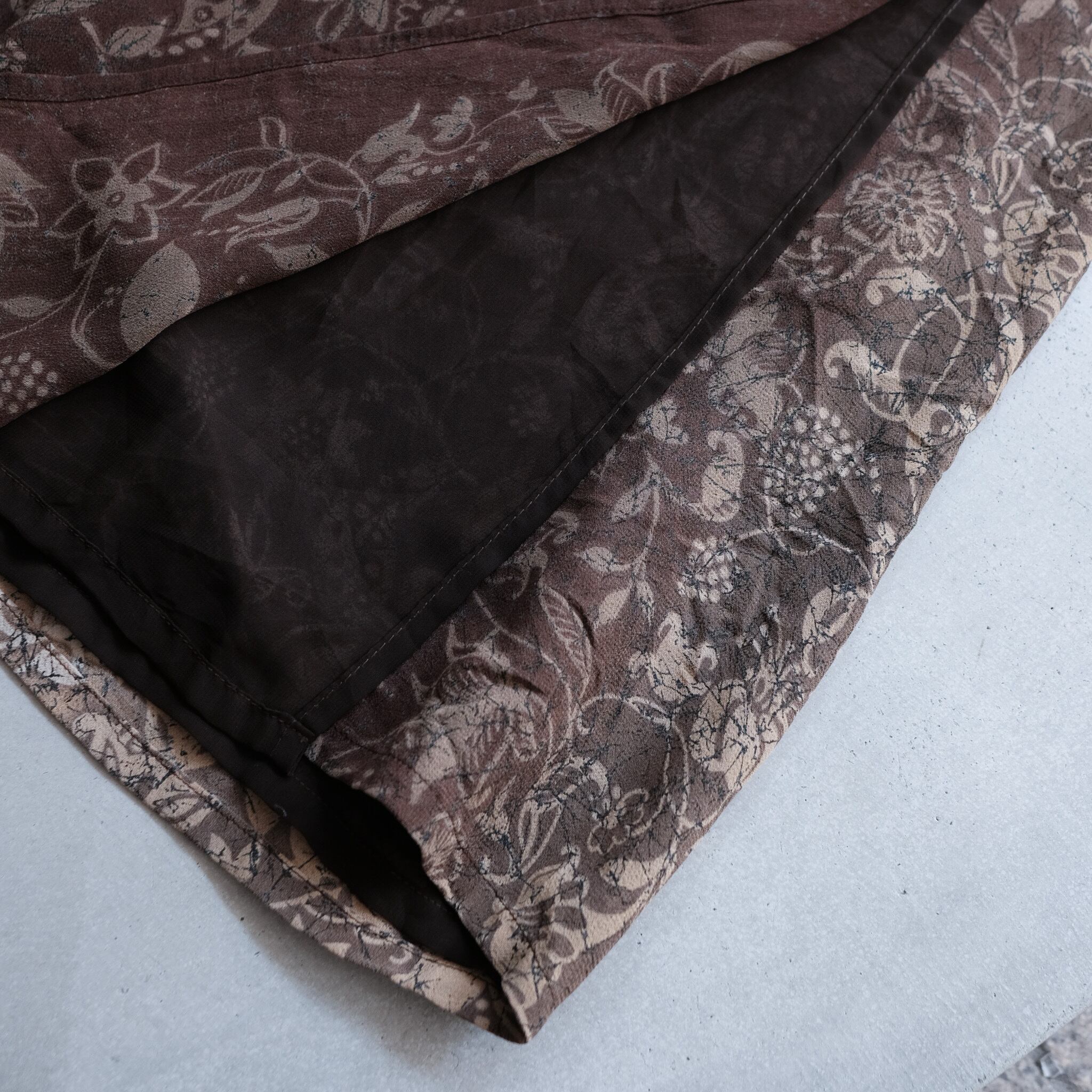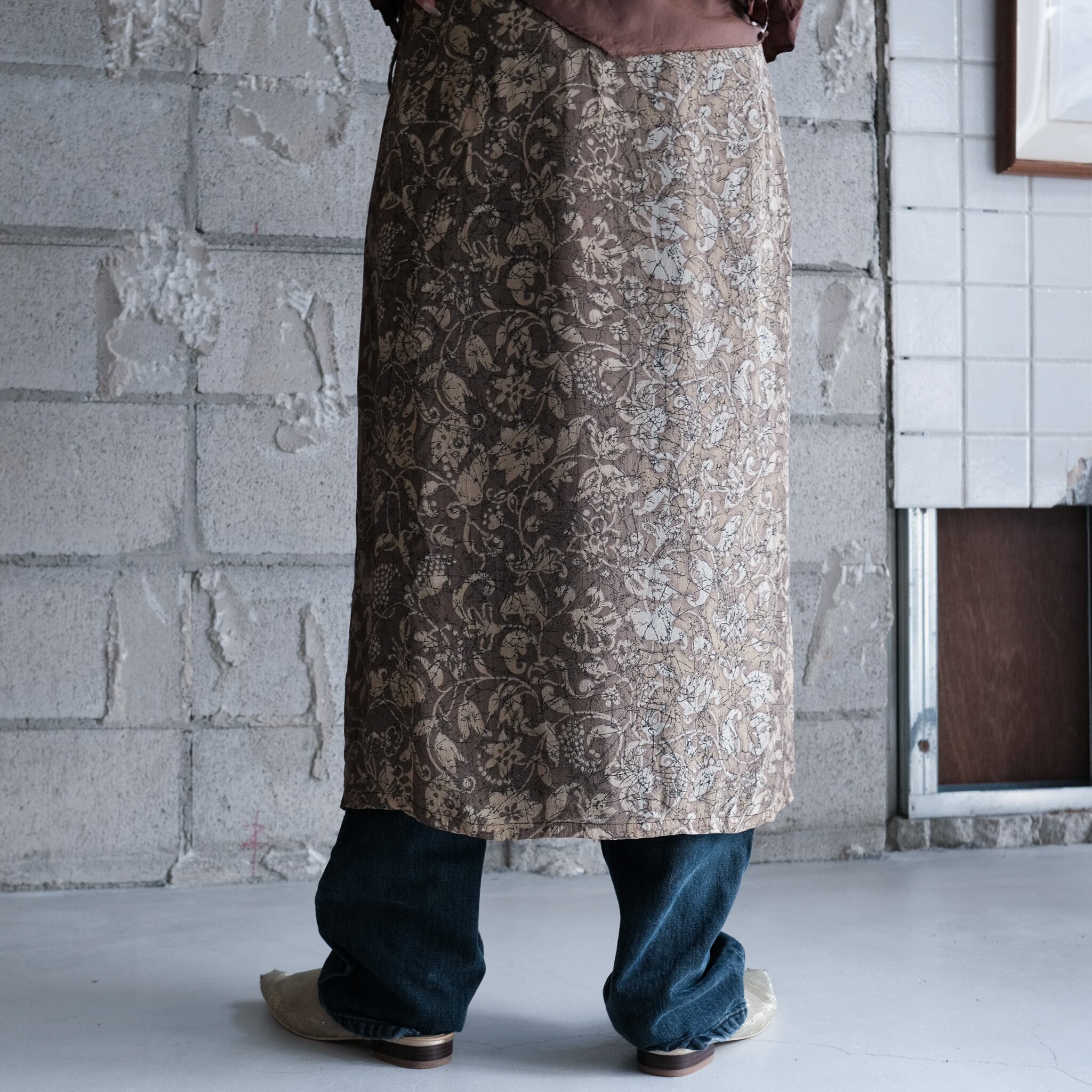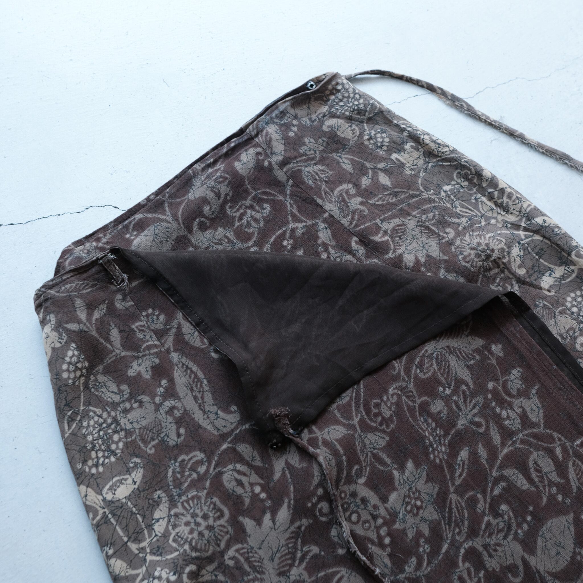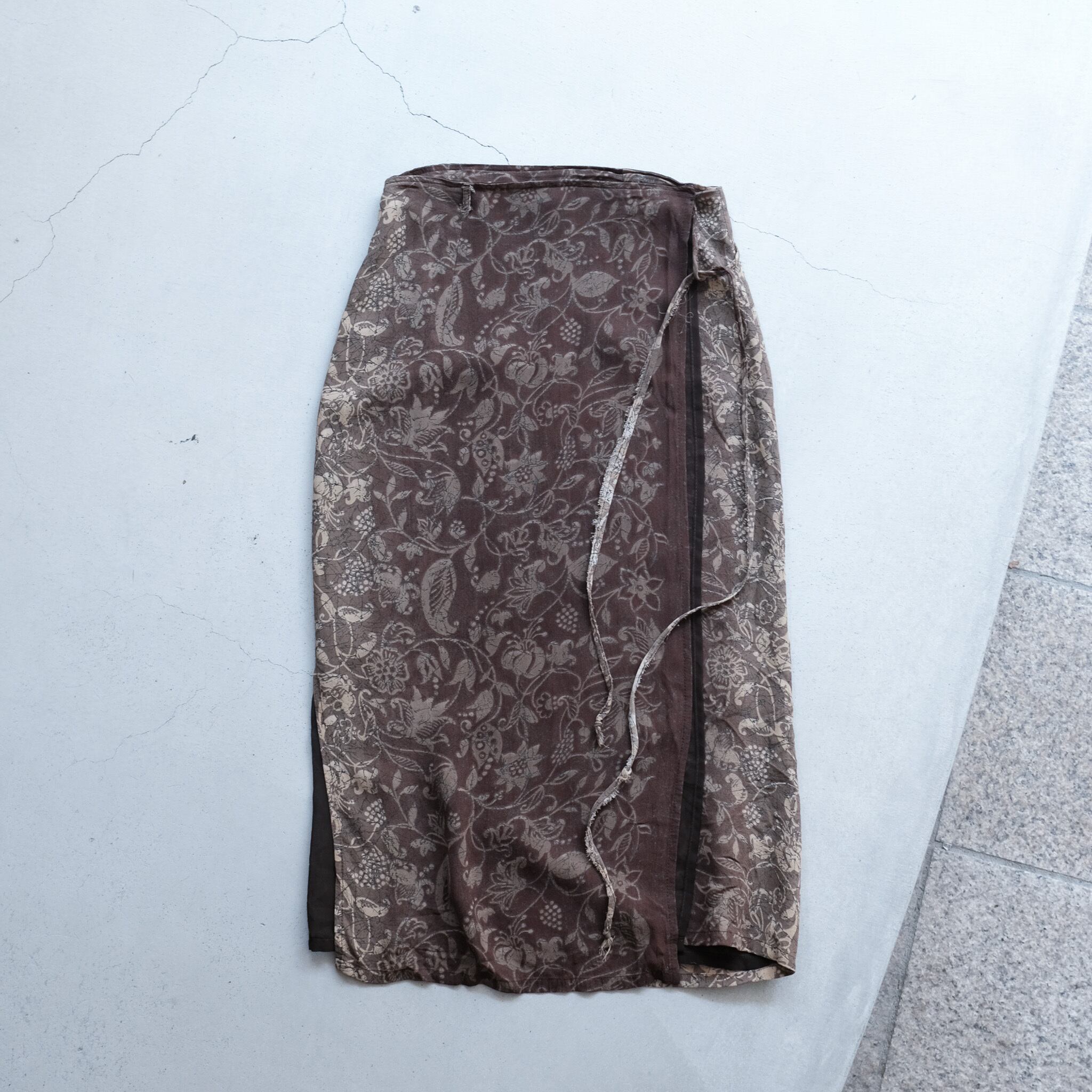 繊細な花柄に、落ち着いたベージュカラーからブラウンへのグラデーションが美しい生地を使用した巻きスカート。内側にはシースルーの生地が二層になっており、スリットや生地が重なる部分から見える奥行きのある仕様に。ウエストはスナップボタンで止め、紐は垂らしても結んでも◎。膝下丈のレングスは、一枚でもボトムスの上から着用してもまとまるバランス。