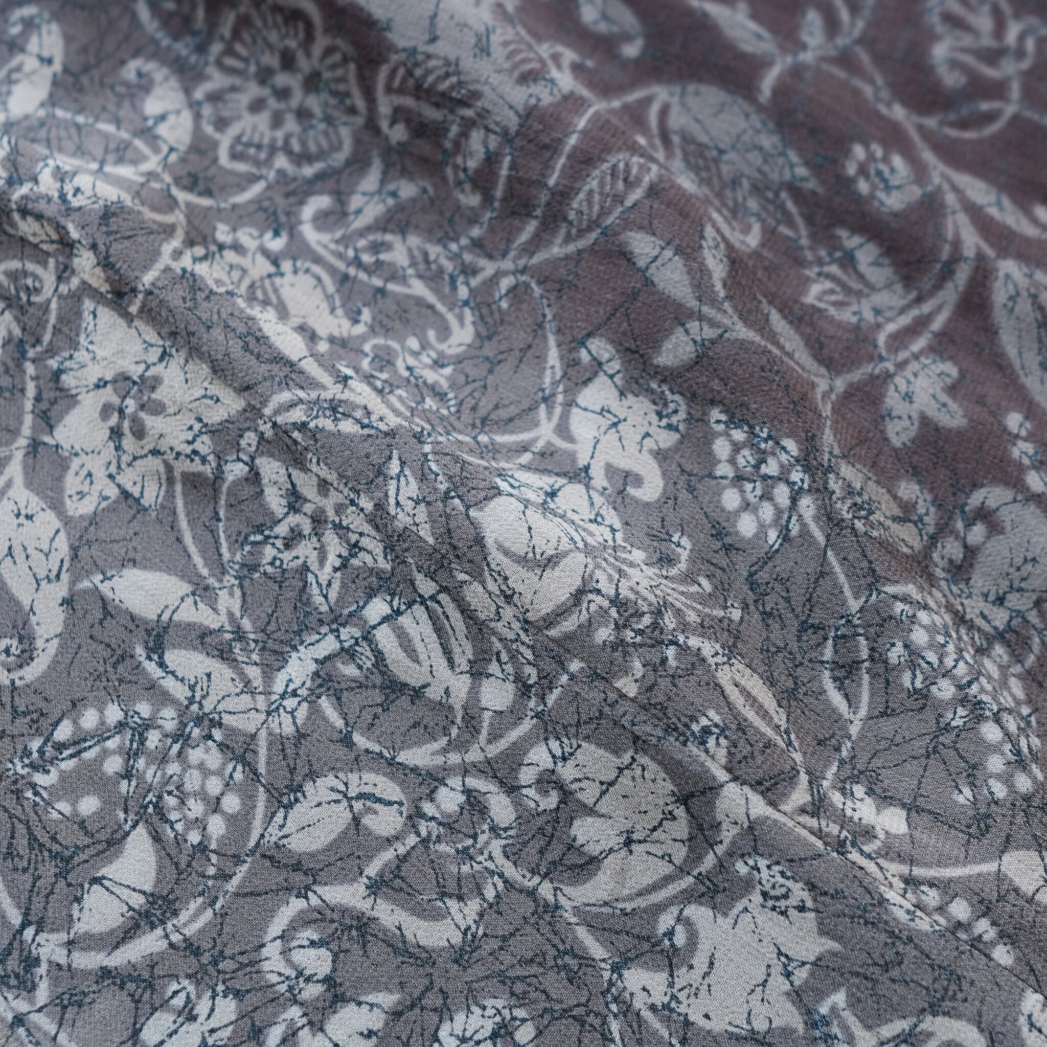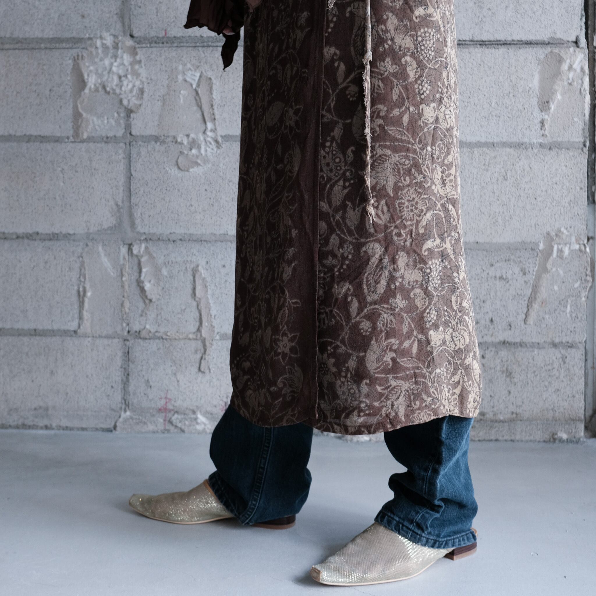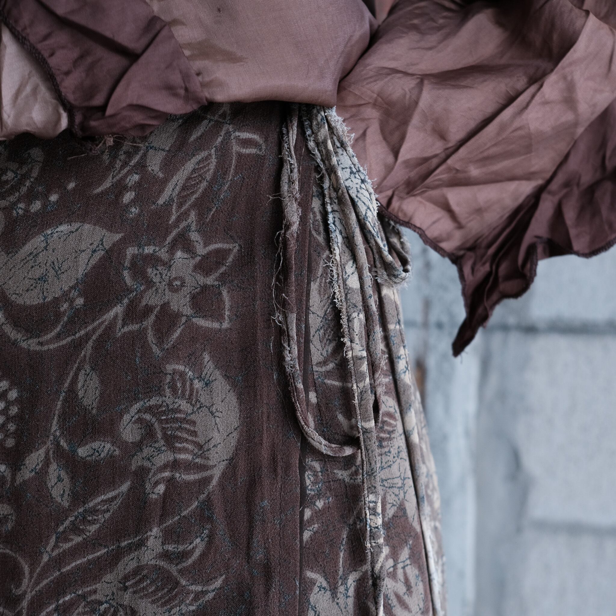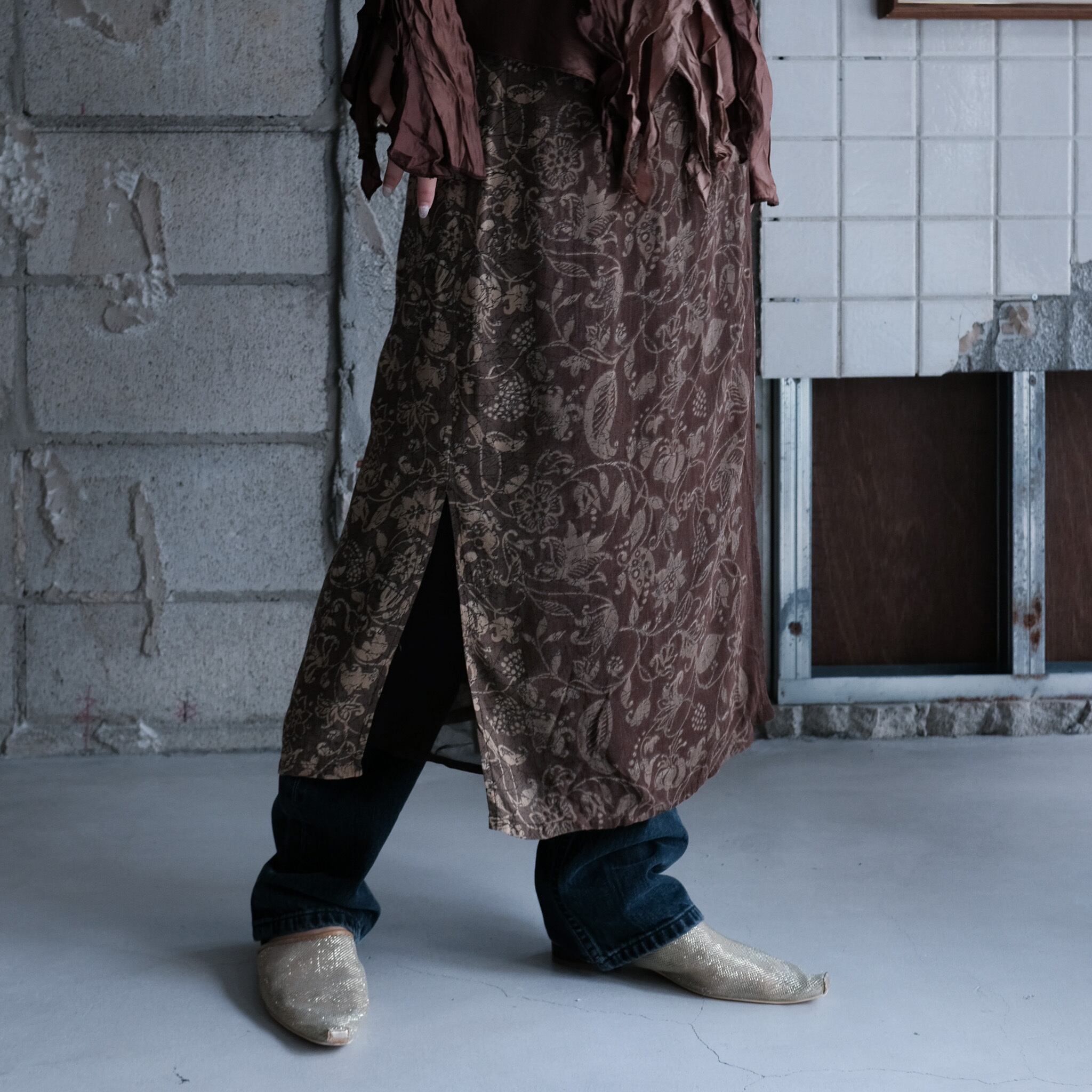繊細な花柄に、落ち着いたベージュカラーからブラウンへのグラデーションが美しい生地を使用した巻きスカート。内側にはシースルーの生地が二層になっており、スリットや生地が重なる部分から見える奥行きのある仕様に。ウエストはスナップボタンで止め、紐は垂らしても結んでも◎。膝下丈のレングスは、一枚でもボトムスの上から着用してもまとまるバランス。