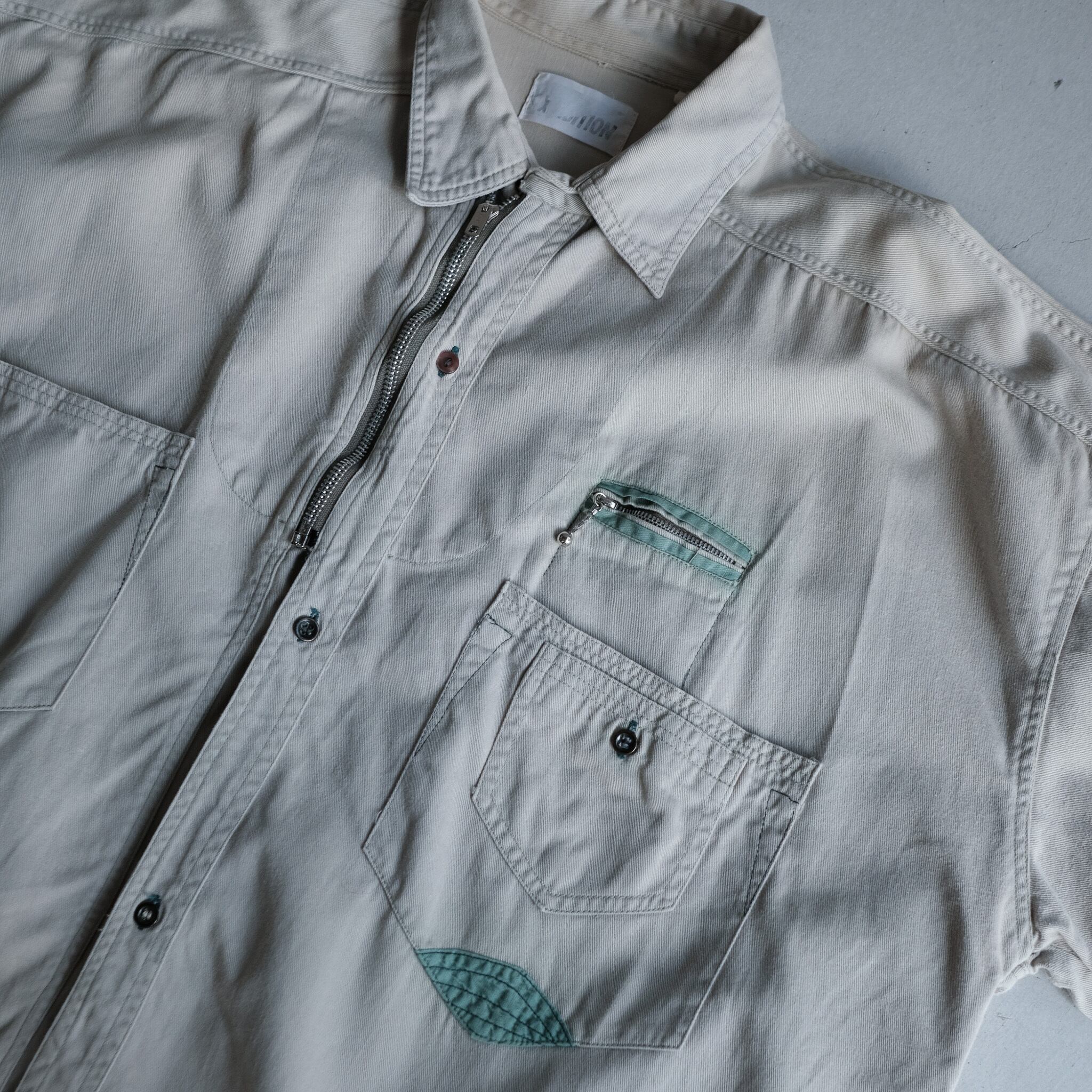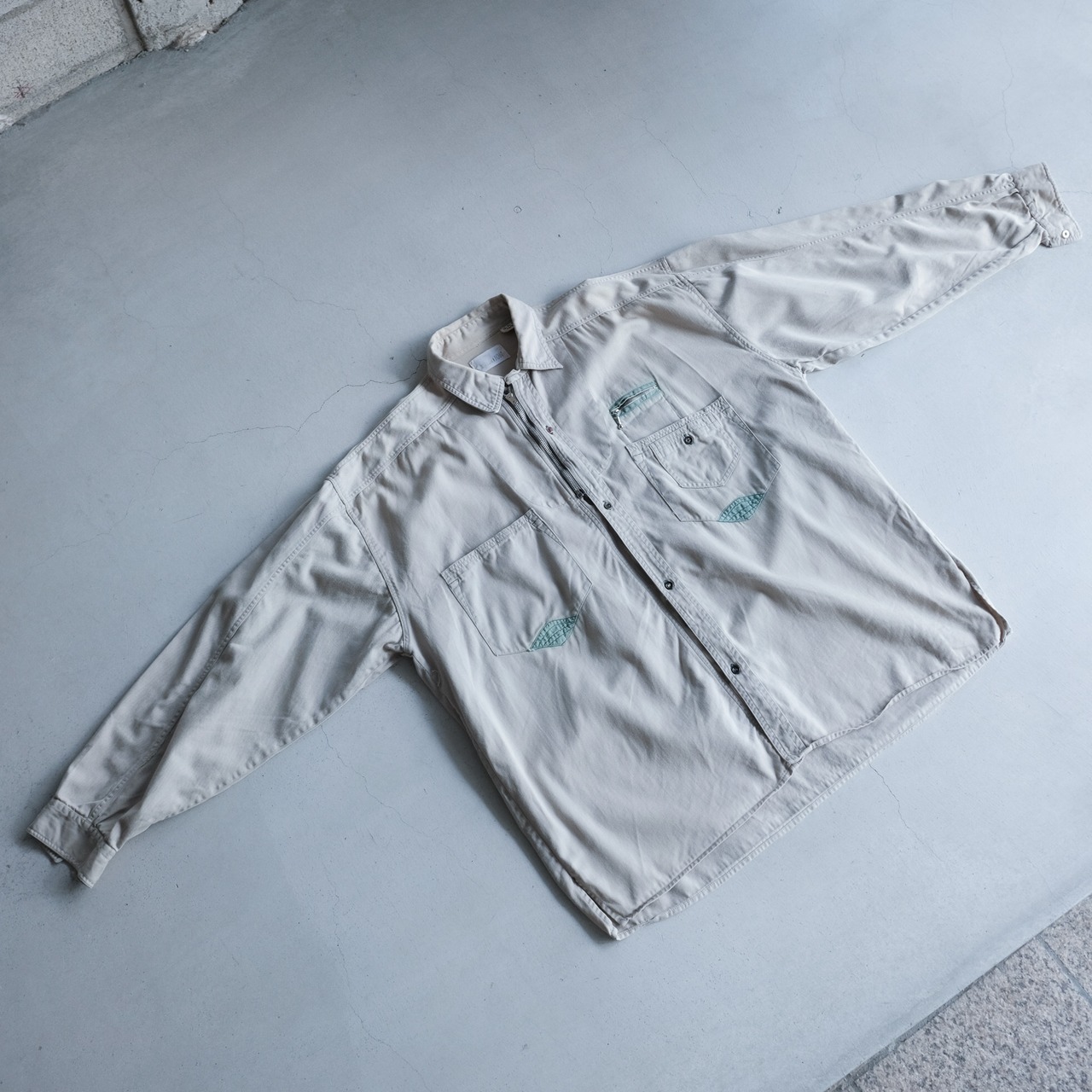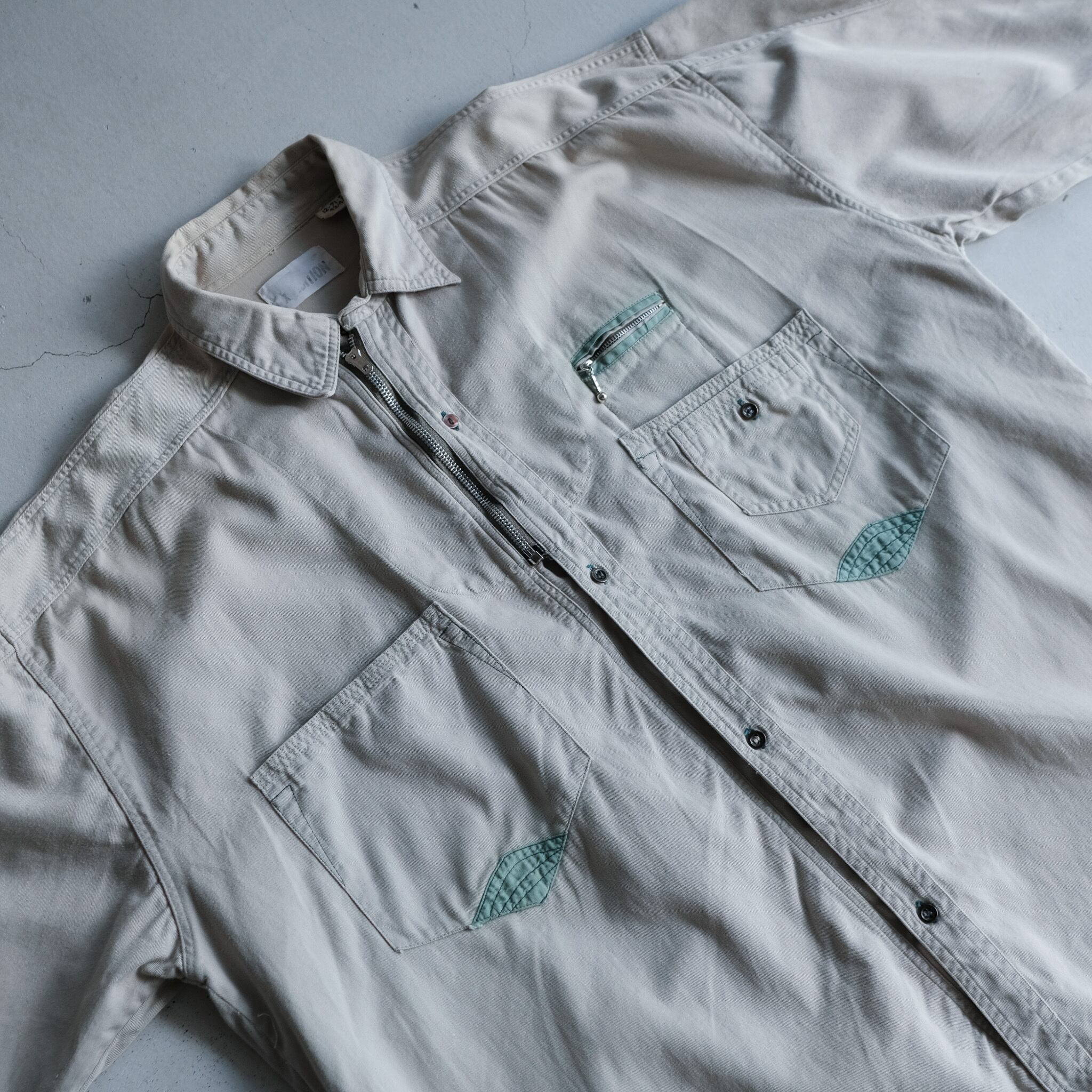 フロントのジップデザインやポケットのステッチが目を惹くデザインシャツ。薄く緑がかったコットンボディに補強するかのように取り付けられたポケットの当て布、パイピングはカーキ。首元の半端なファスナーはボタンを使用せずとも開閉することが出来、着脱もノンストレスに。原産国表記は読み取れませんでしたがタグやデザインから推測するにユーロレギュラーアイテム。他にはないディテールやカラーが唯一無二の古着ならではなシャツ。