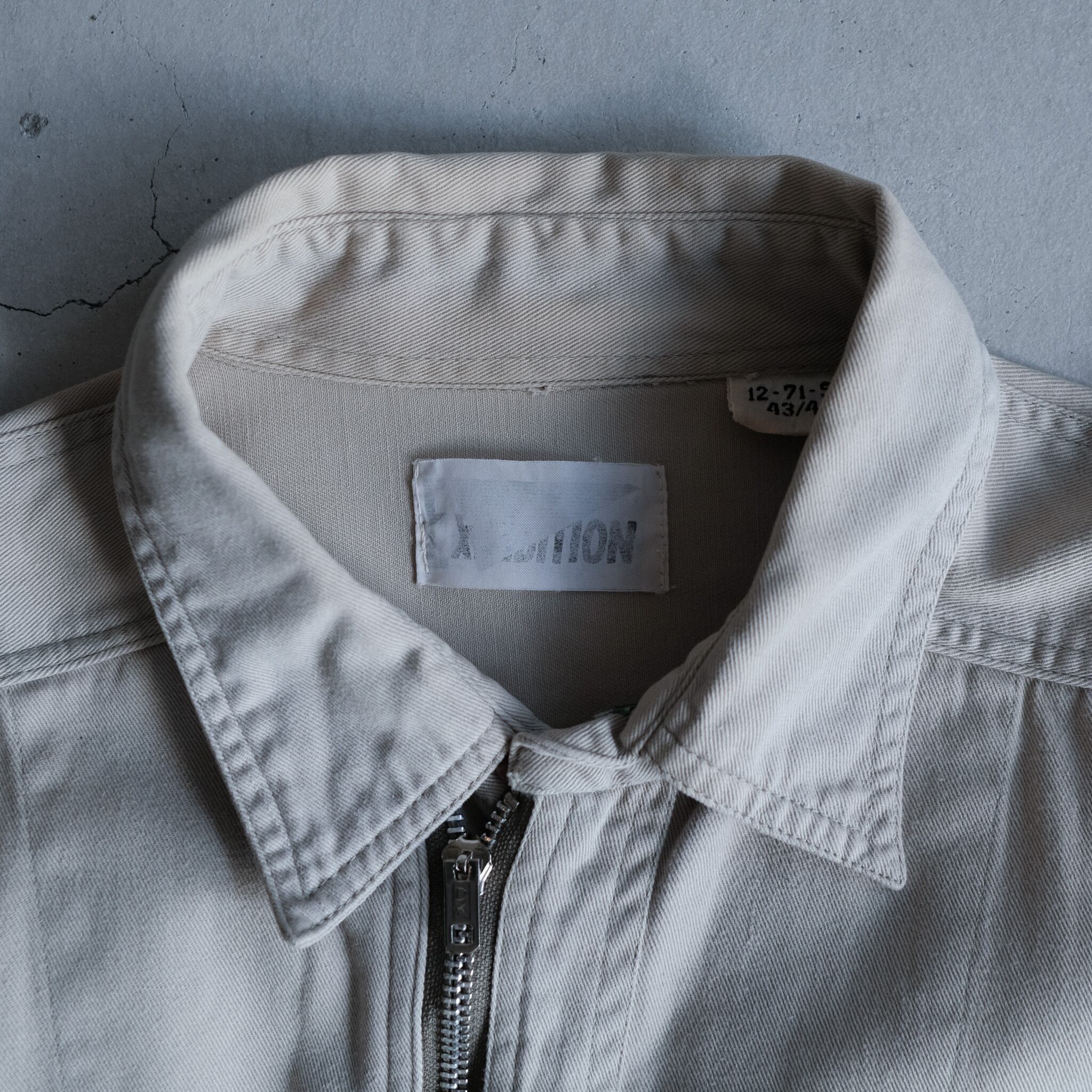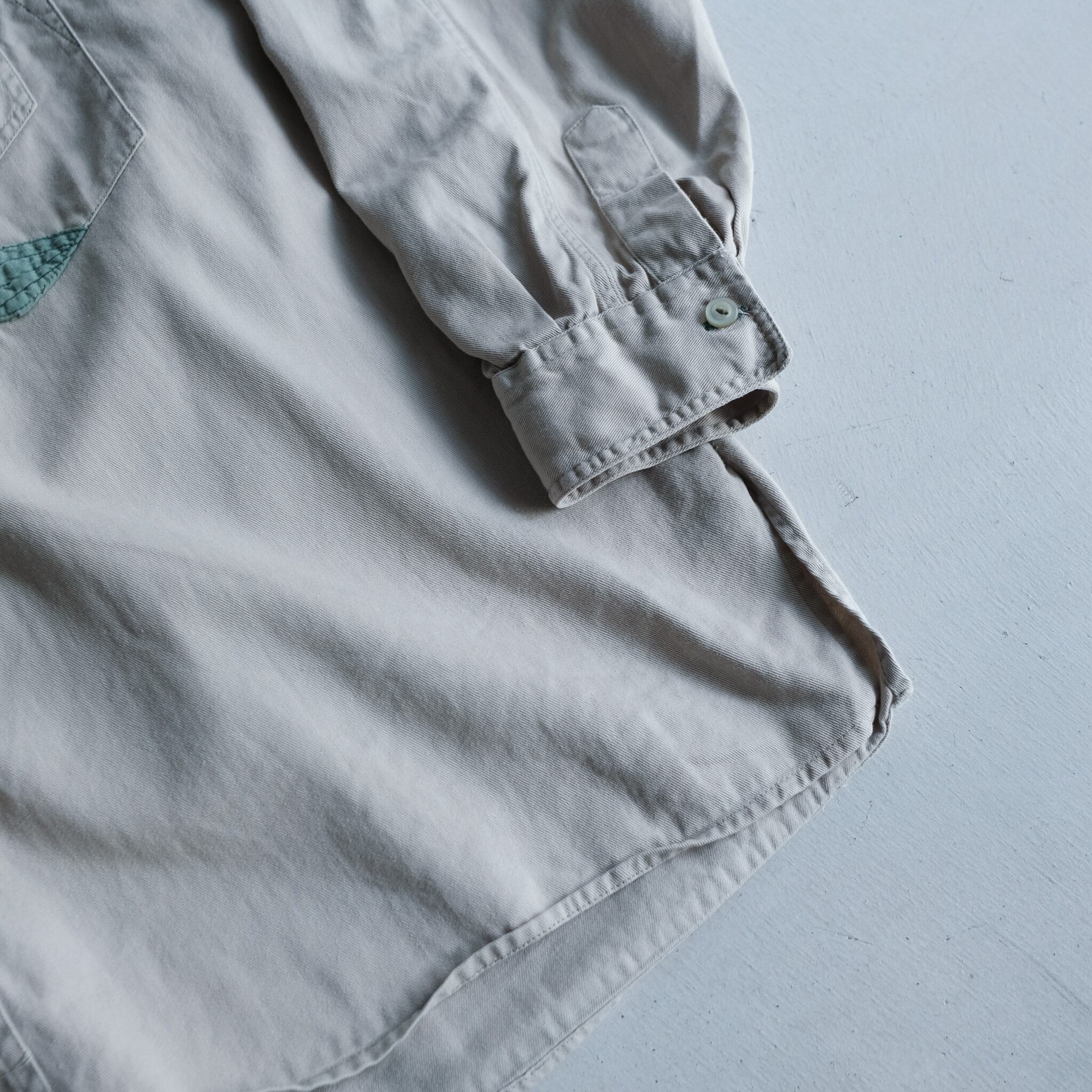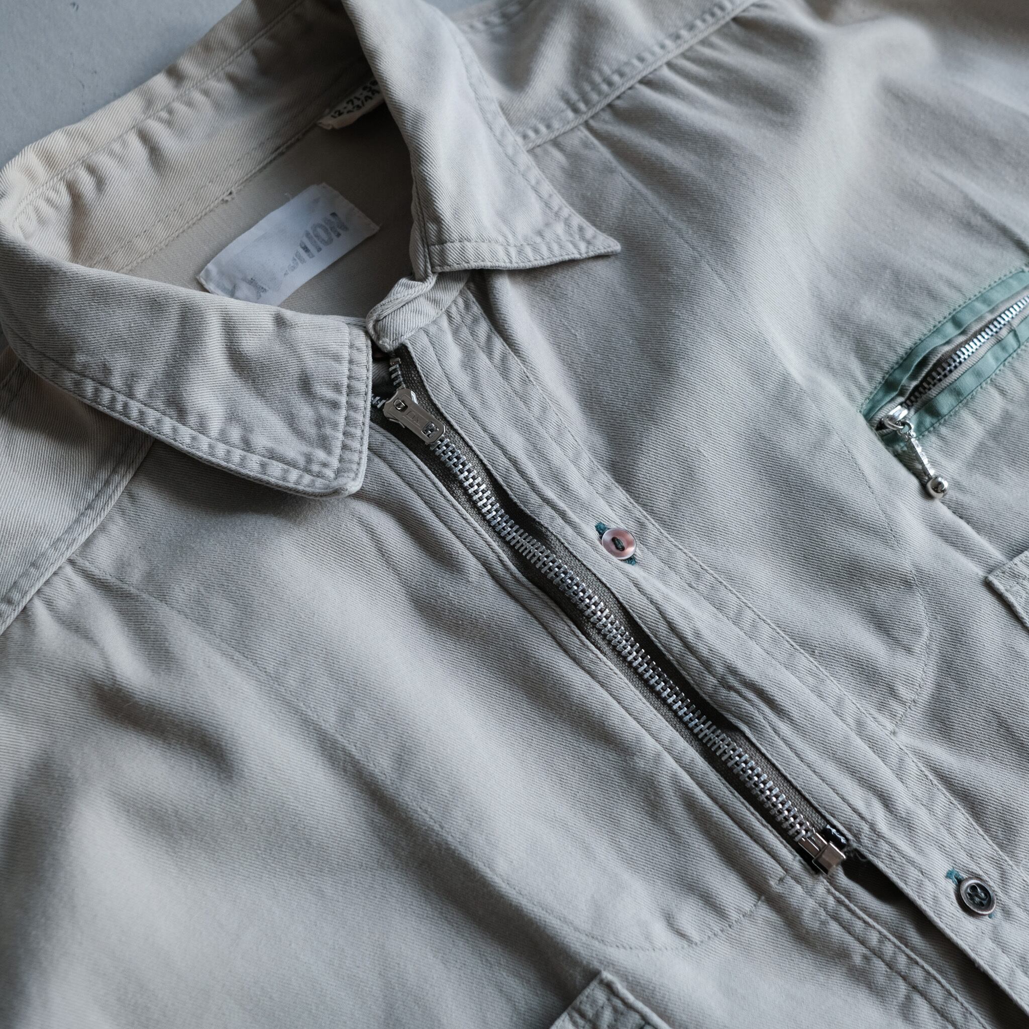 フロントのジップデザインやポケットのステッチが目を惹くデザインシャツ。薄く緑がかったコットンボディに補強するかのように取り付けられたポケットの当て布、パイピングはカーキ。首元の半端なファスナーはボタンを使用せずとも開閉することが出来、着脱もノンストレスに。原産国表記は読み取れませんでしたがタグやデザインから推測するにユーロレギュラーアイテム。他にはないディテールやカラーが唯一無二の古着ならではなシャツ。