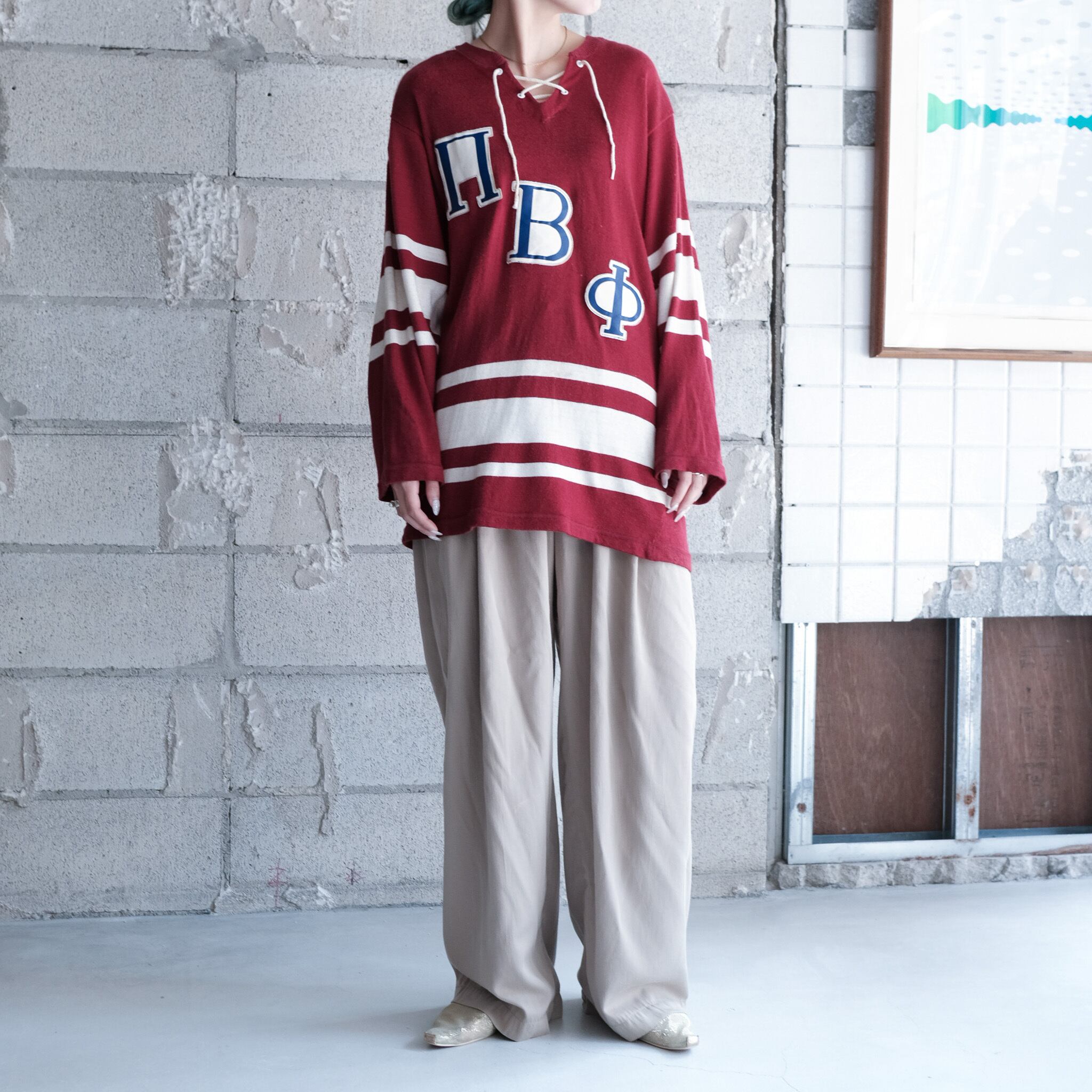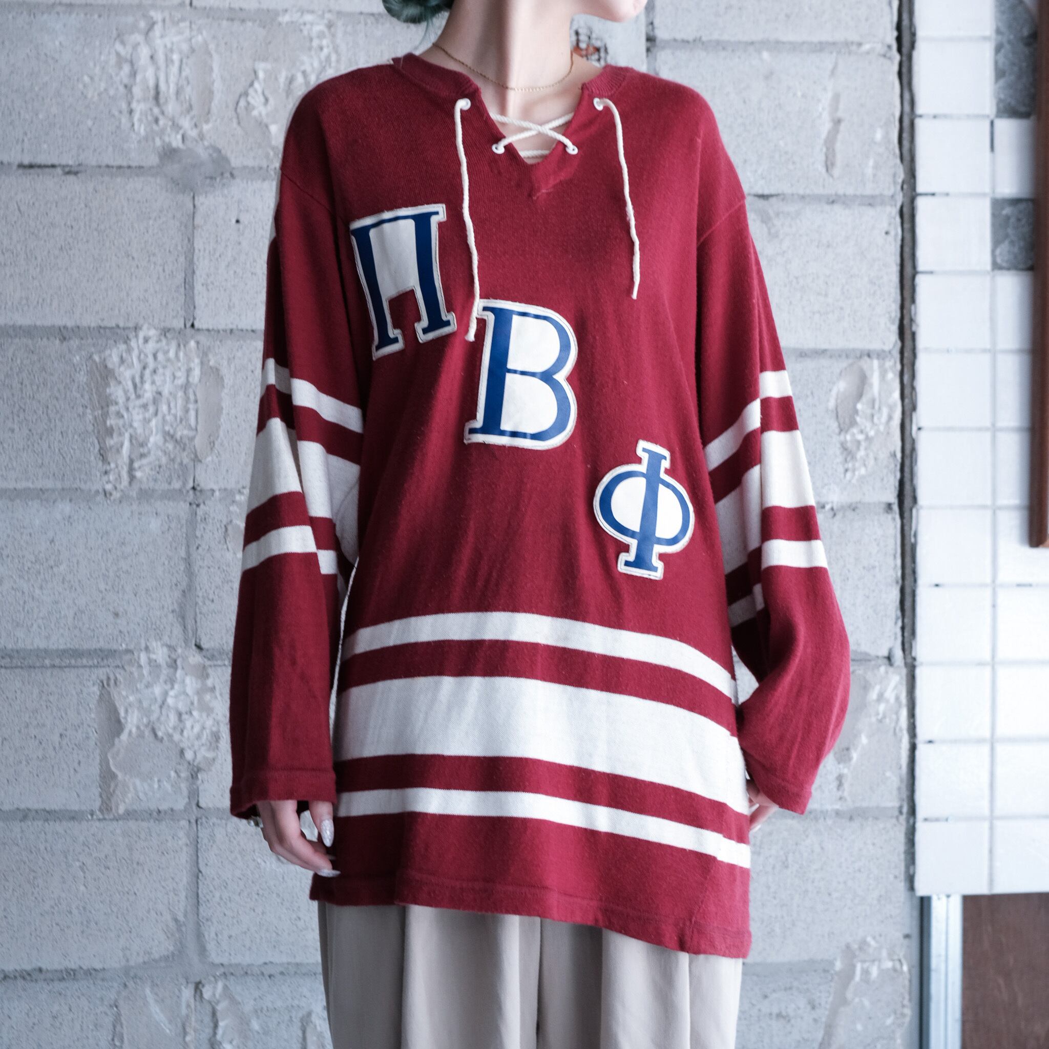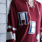 レースアップされた首元のディテールが特徴的なフットボールTシャツ。フロントには恐らくチーム名と思われる英字のパッチが施され、素材はレーヨン/コットン。古い年代の同ジャンルらしい雰囲気のあるエイジング感が幅広いアイテムと相性◎。広いアームホールに対してコンパクトな身幅でスッキリとしたシルエット。男女問わず着用可能。