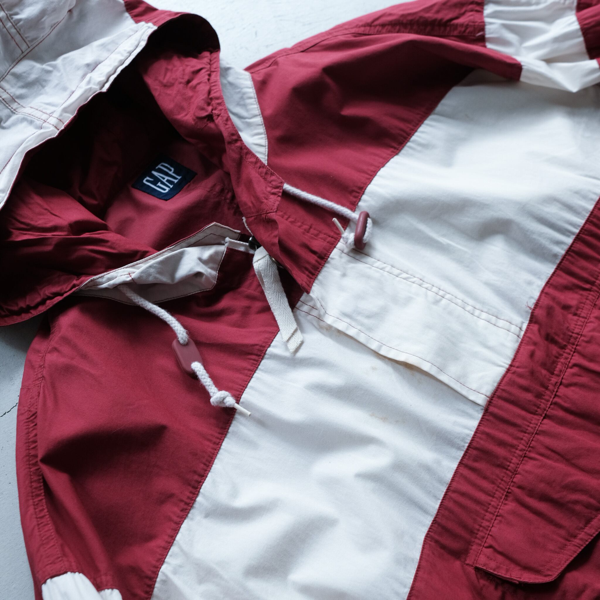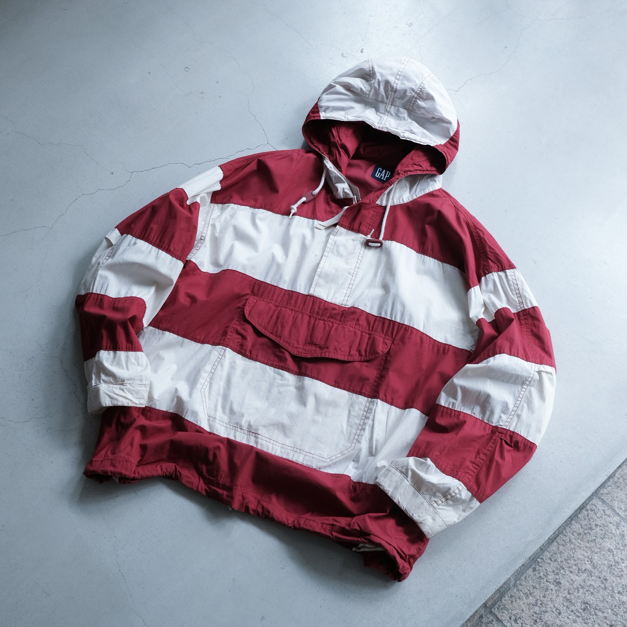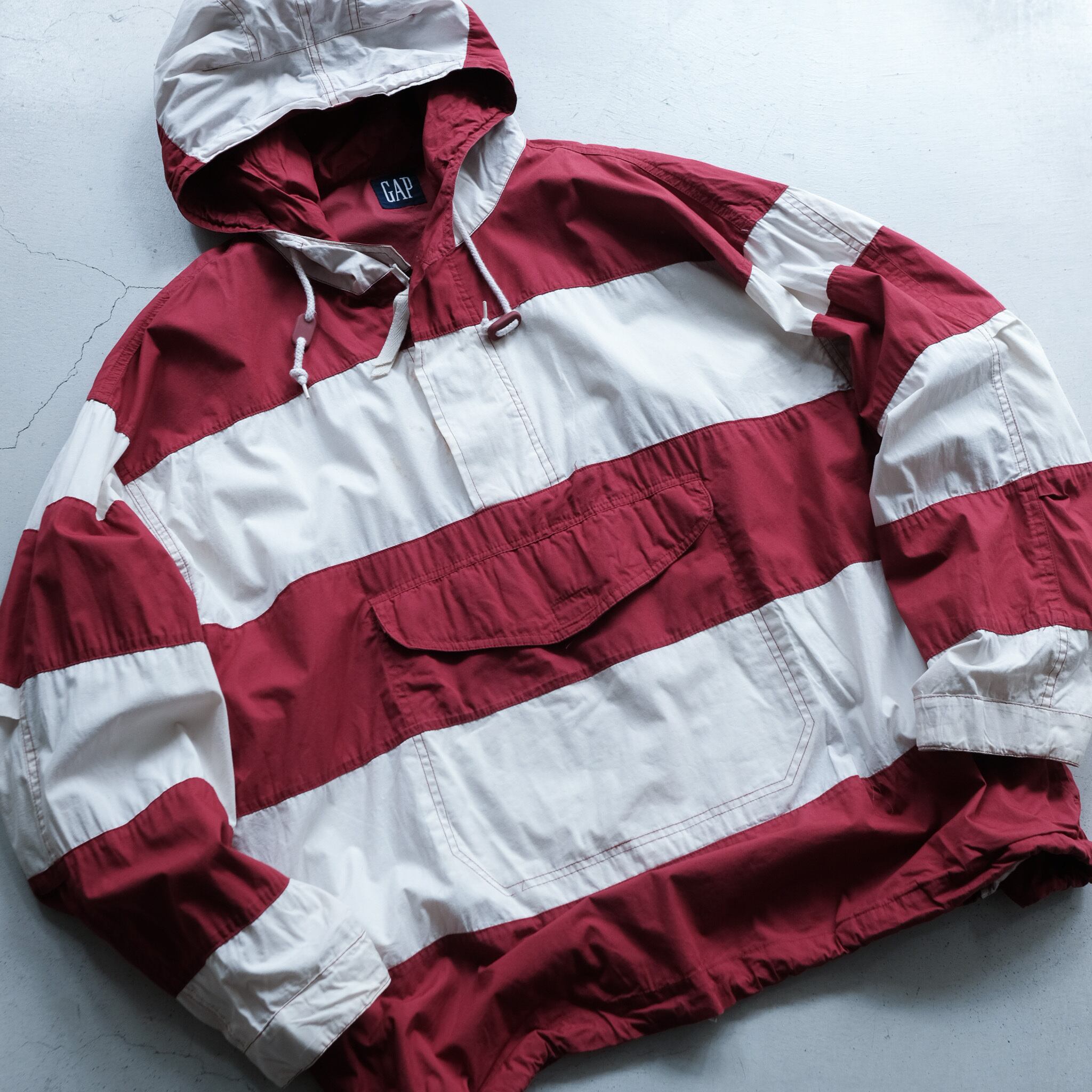 90年代のGAPの中でも一際存在感のあるカテゴリー"アノラック"。その中でも球数の少ない切り替えデザインのコットンアノラック。ハリのある薄地のコットンをアイボリー、レッドの組み合わせで太幅のボーダー切り替え。フードまで同幅で配置され、ブランドの拘りを感じる一枚。サイドのシームポケットやボリュームのある袖をまとめる為の膝のタック、袖口のアジャスター等、作り込まれたクオリティの高いアイテム。着丈と身幅が同寸のボックスシルエット。生地感も相まって、着用時にはボリューム感がありながらも収まりの良いシルエットに。全体的にシミ等見られますが、バッドコンディション含めて雰囲気のある商品だと思います。