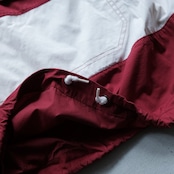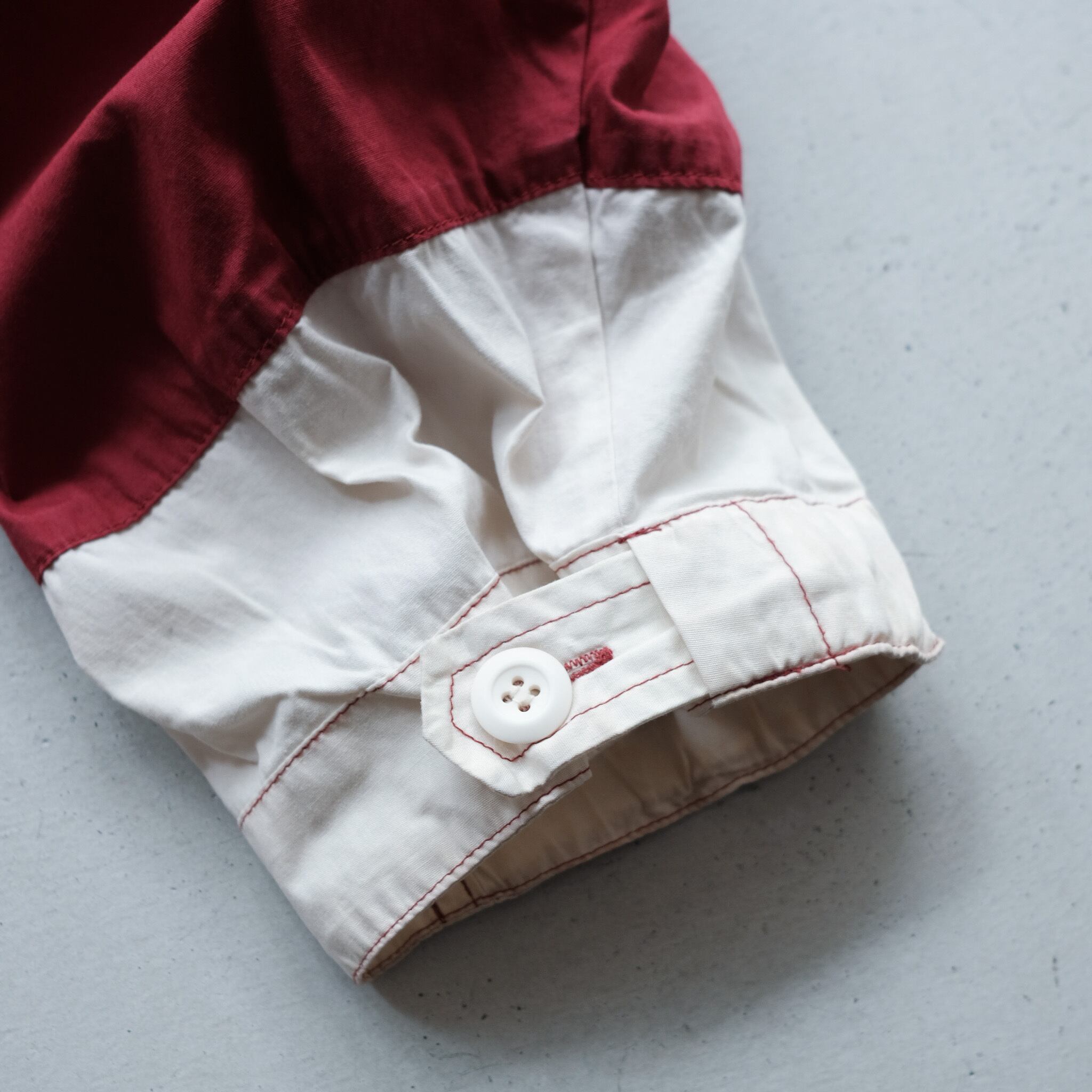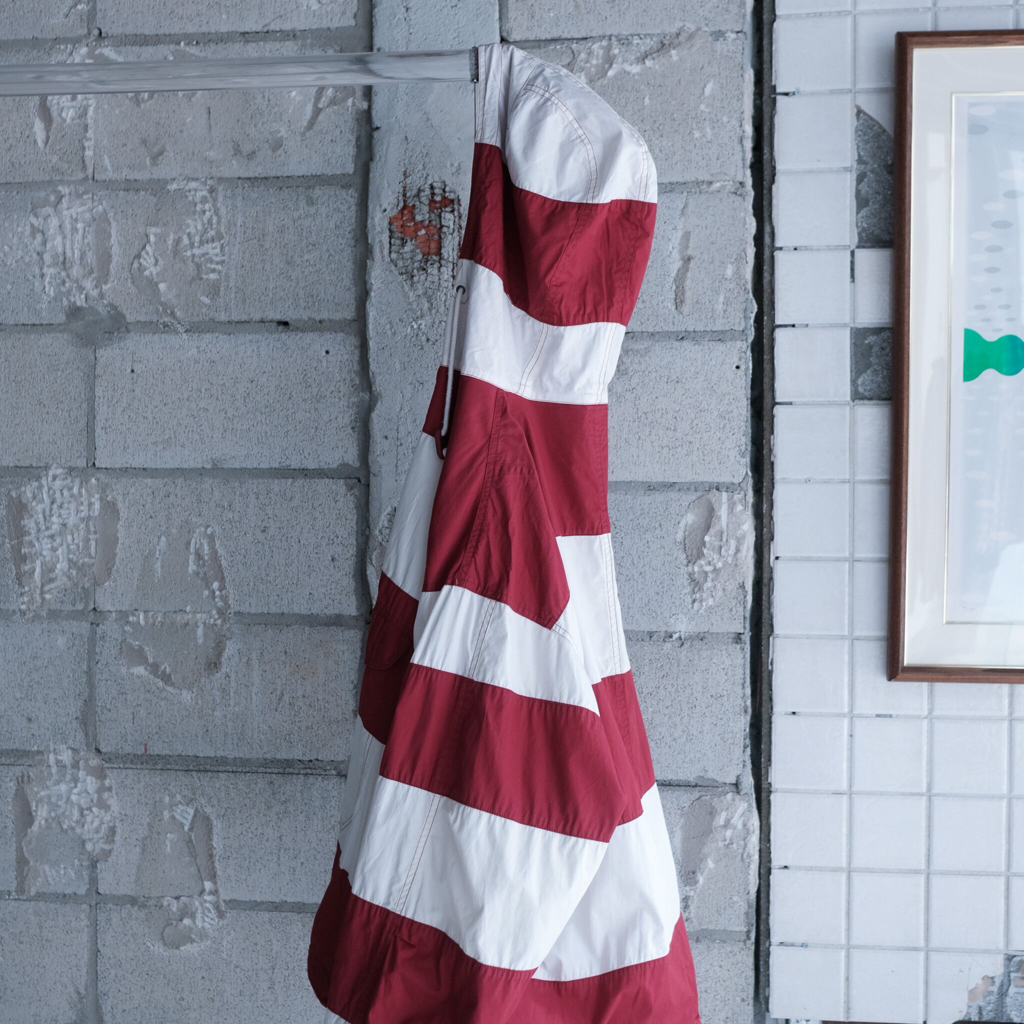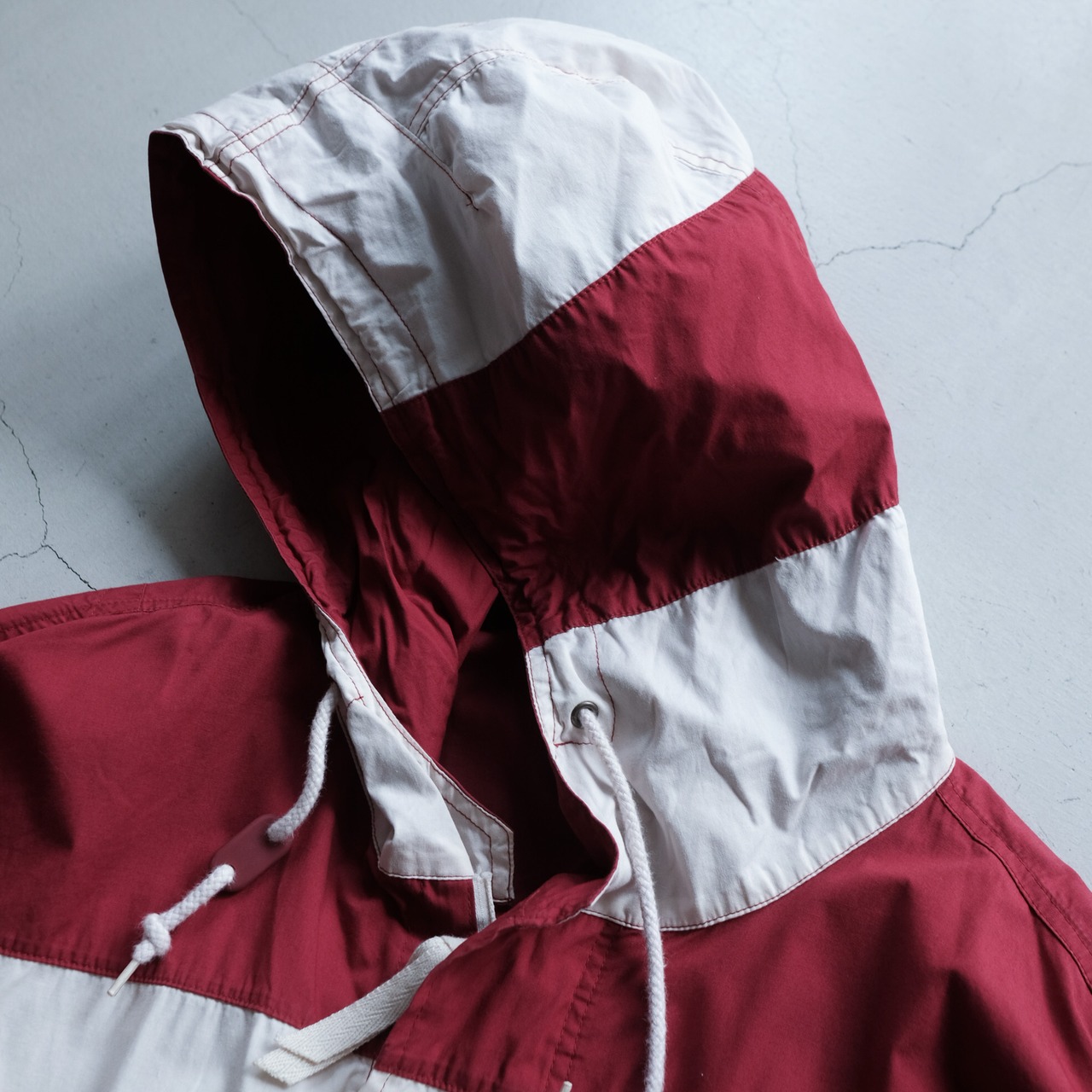 90年代のGAPの中でも一際存在感のあるカテゴリー"アノラック"。その中でも球数の少ない切り替えデザインのコットンアノラック。ハリのある薄地のコットンをアイボリー、レッドの組み合わせで太幅のボーダー切り替え。フードまで同幅で配置され、ブランドの拘りを感じる一枚。サイドのシームポケットやボリュームのある袖をまとめる為の膝のタック、袖口のアジャスター等、作り込まれたクオリティの高いアイテム。着丈と身幅が同寸のボックスシルエット。生地感も相まって、着用時にはボリューム感がありながらも収まりの良いシルエットに。全体的にシミ等見られますが、バッドコンディション含めて雰囲気のある商品だと思います。