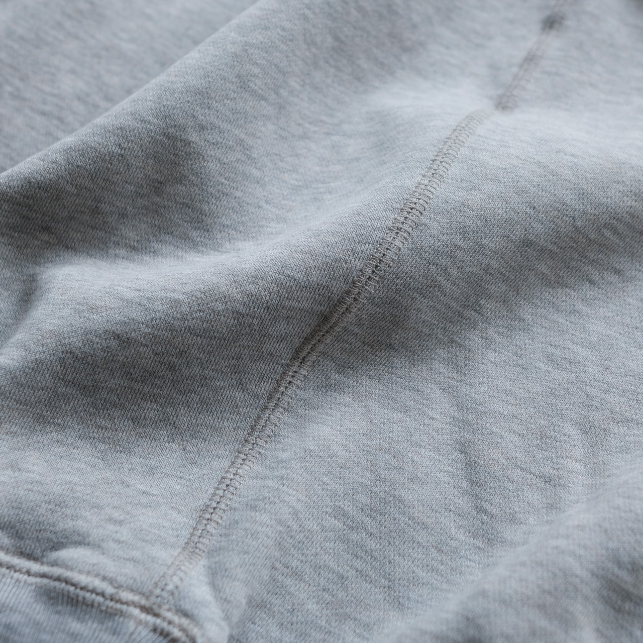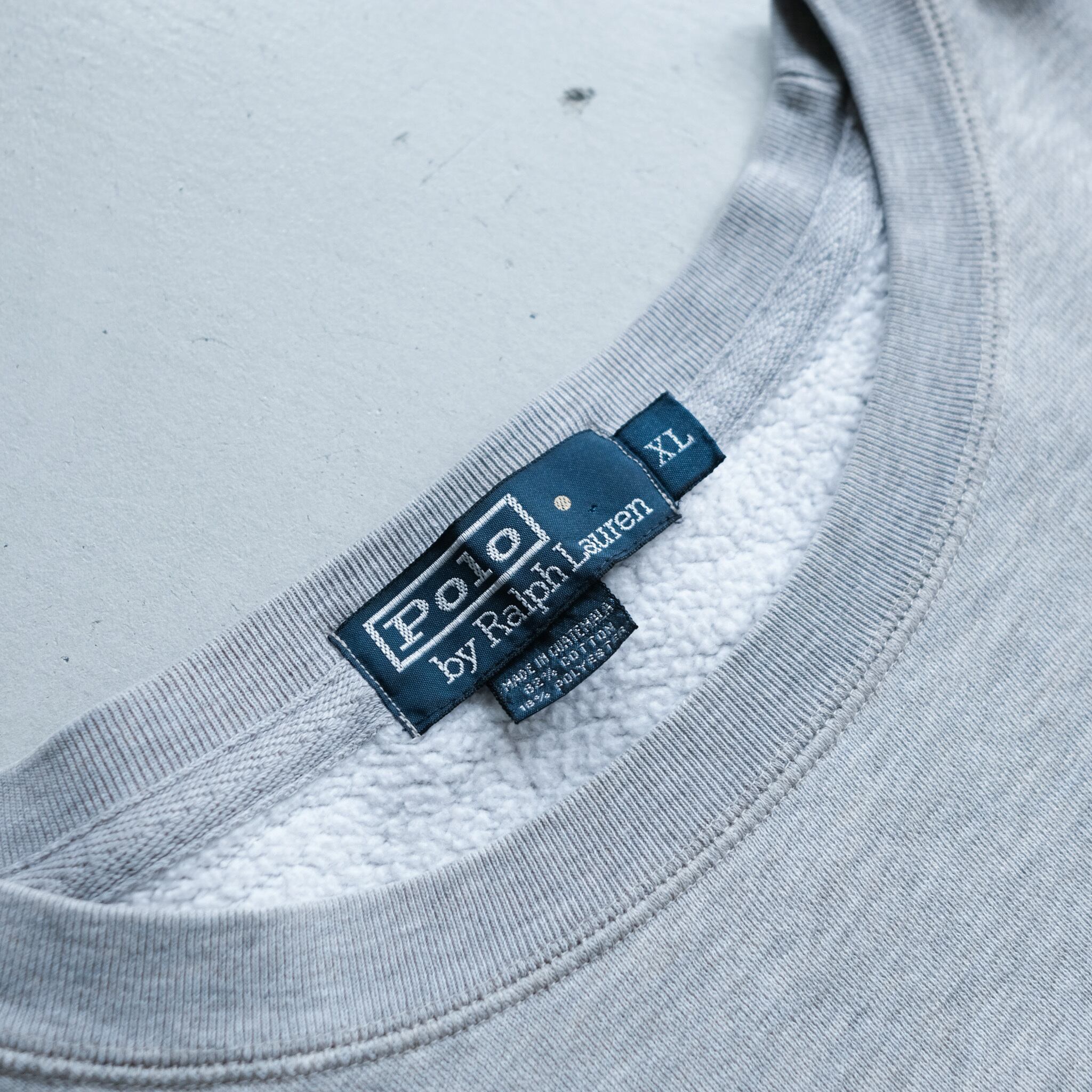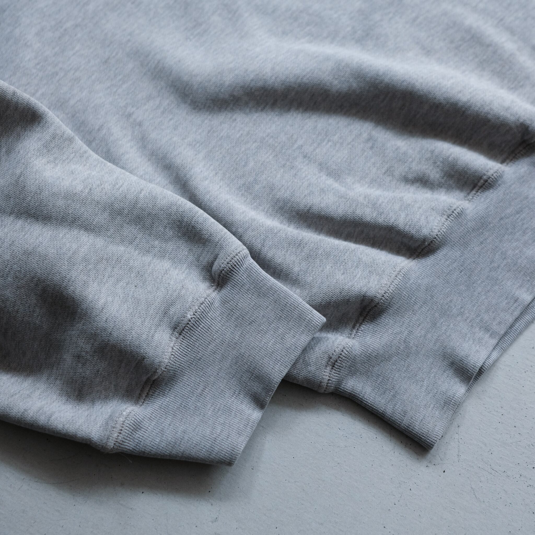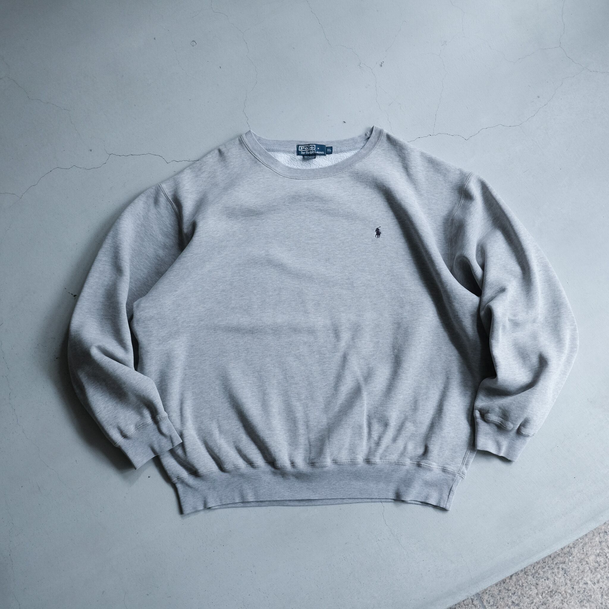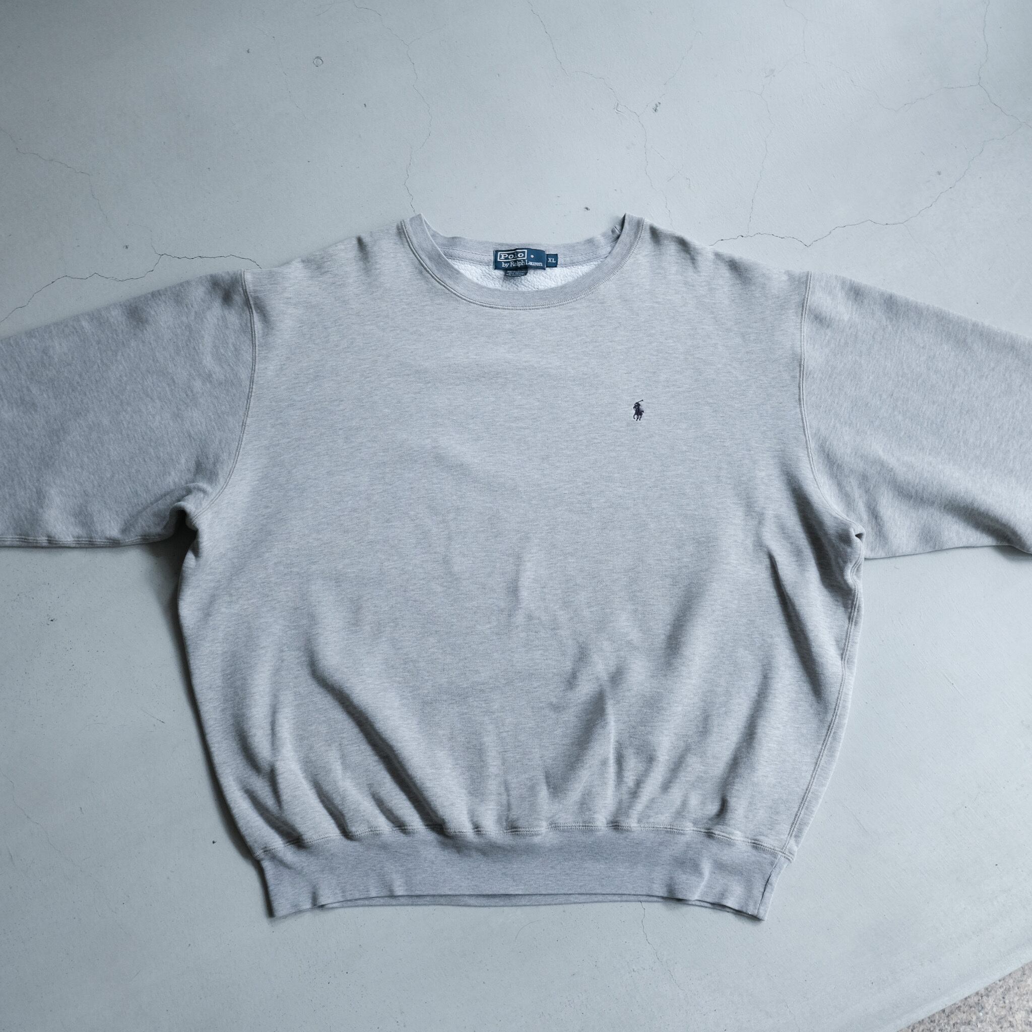 ラルフローレンのプレーンスウェットシャツ。シンプルな作りに反して、着丈を超える75cmの身幅に大きなアームホール。着用時に溜まる脇周りの生地や、やや横に広いネックなど細かな変化が心地よい。目の詰まった薄くややハリのあるスウェット地。胸元のポニー刺繍が暗いパープルなのも◎。インナーにフードのあるアイテムを入れたレイヤードの際も収まりのいい作り。