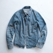 立体裁断によるウエストのシェイプが美しいGUCCIのデニムシャツジャケット。通常垂直に配置される脇のパネルを身体を包むように巻き込んだカッティングがシルエット、デザインに反映されており、ベーシックながらもメゾンブランドの拘りが感じられる仕上がりに。シャツ地よりもやや厚みのある素材で、インナー、アウターどちらでも映える仕様。袖口の"g"の刺繍がワンポイントに。