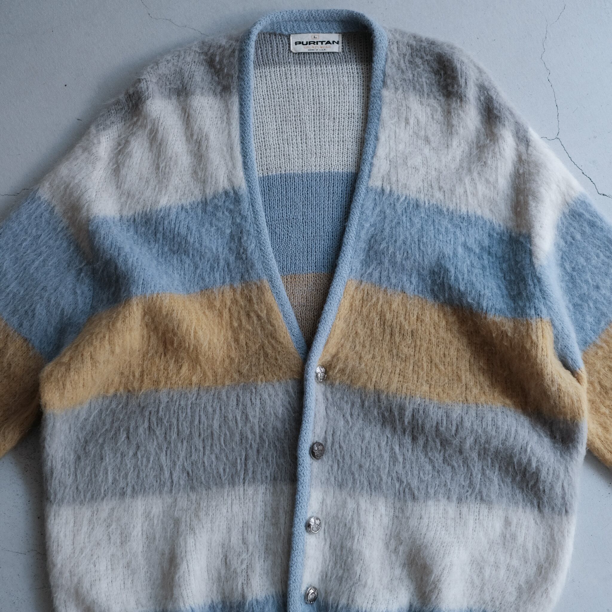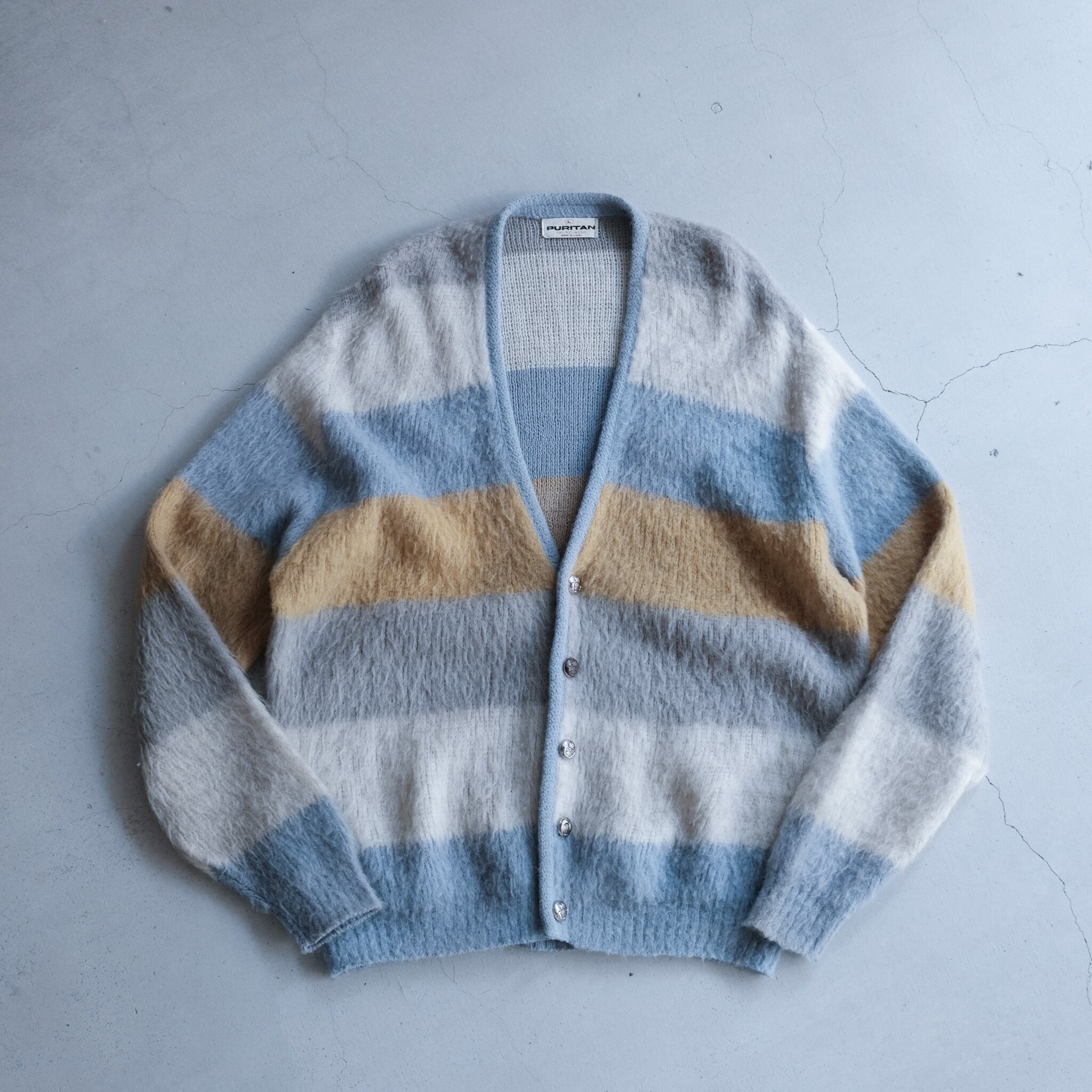 1960年代の上質で長く柔らかい毛足が特徴的なロングヘアーのモヘアニットカーディガン。価格高騰しているカテゴリーの一つですが、その中でも特に個体数の少ないオーバーサイズ。身幅64cmでスウェットやフーディの上からも着用可能。配色も珍しく、淡くくすんだトーンの太幅のライン。シルバーのボタンの相性も良く、モヘアカーディガンの中でも古着色が薄い仕上がりに。ブランドはクオリティの高い洋服が多い印象の老舗ブランド"PURITAN"。着たいと思えるヴィンテージです。
