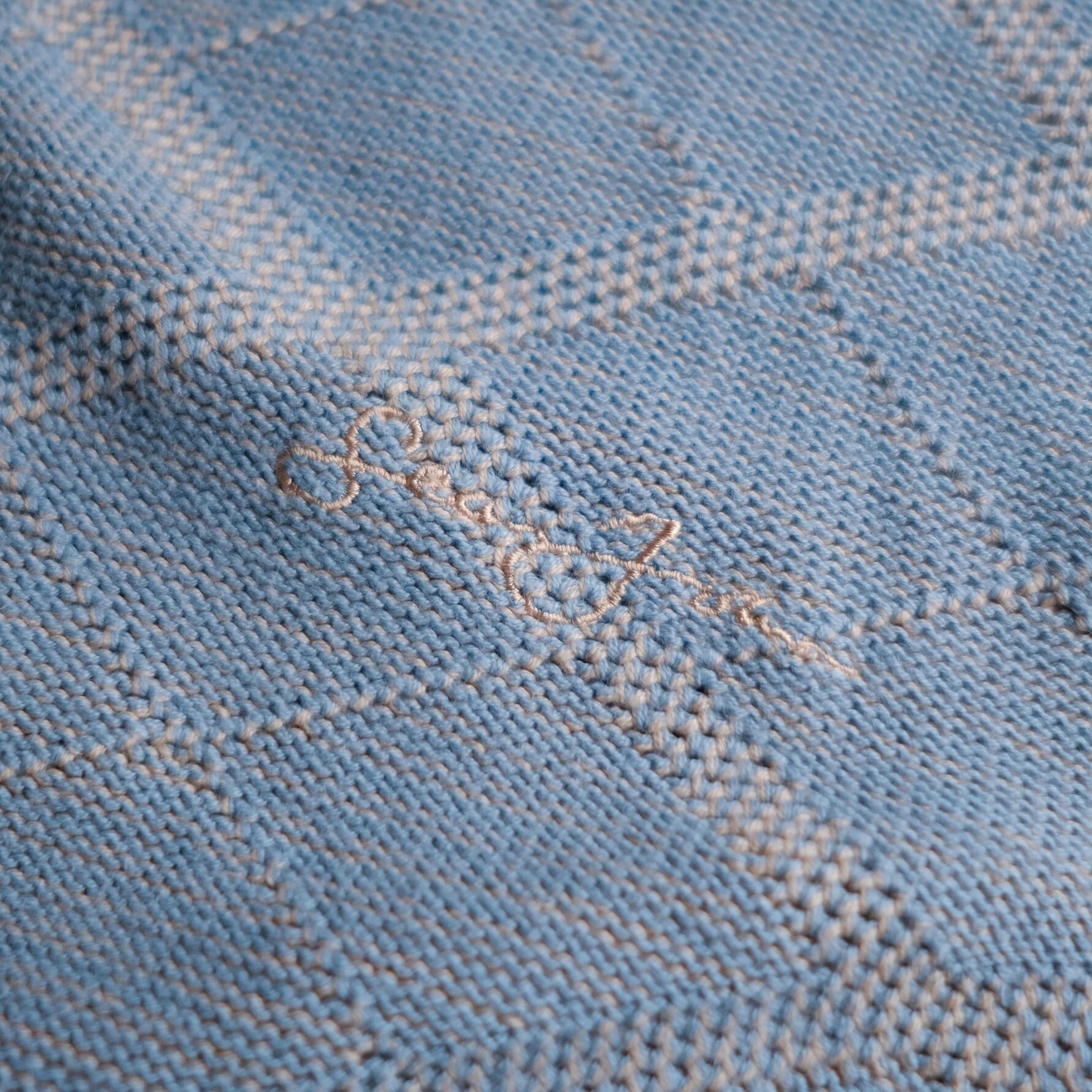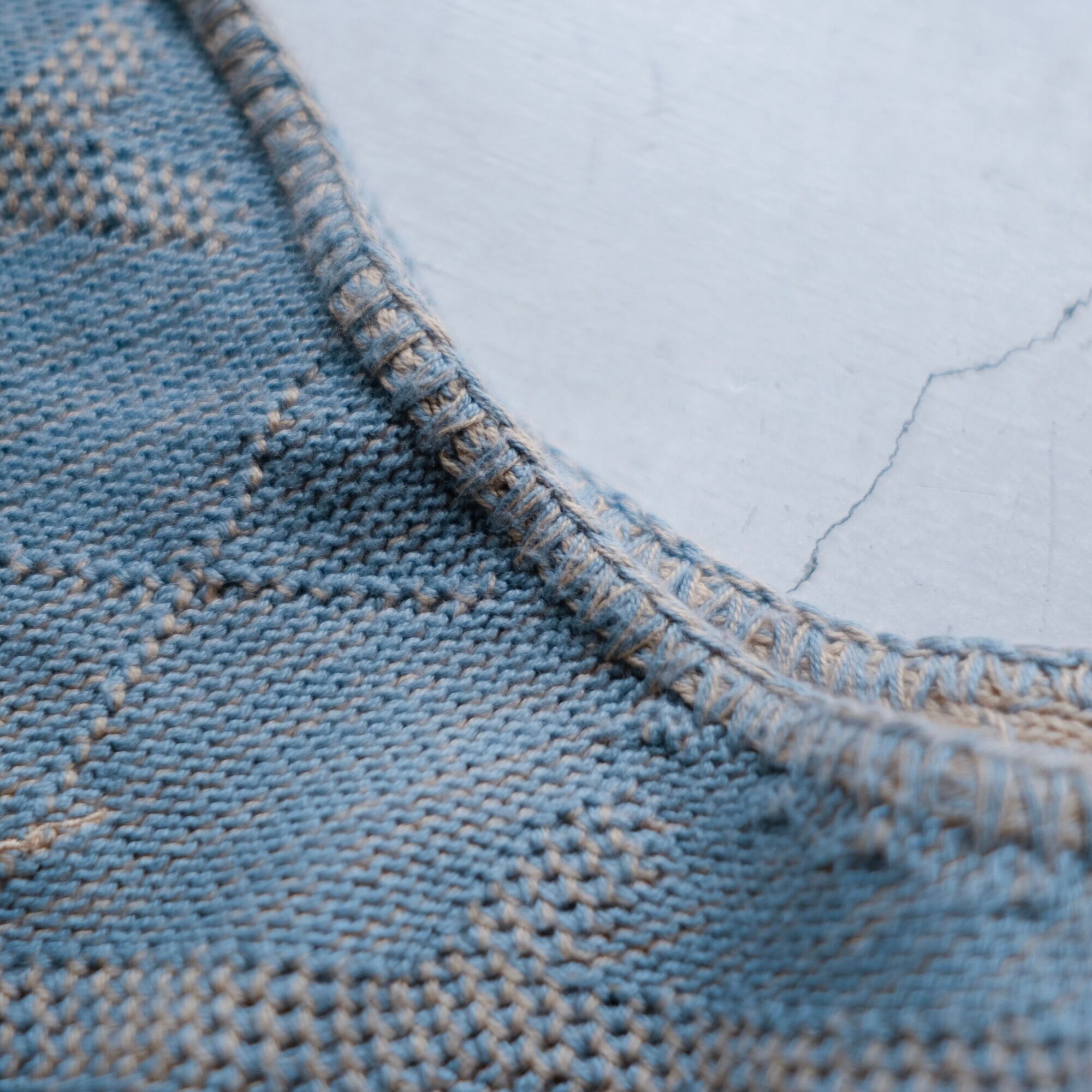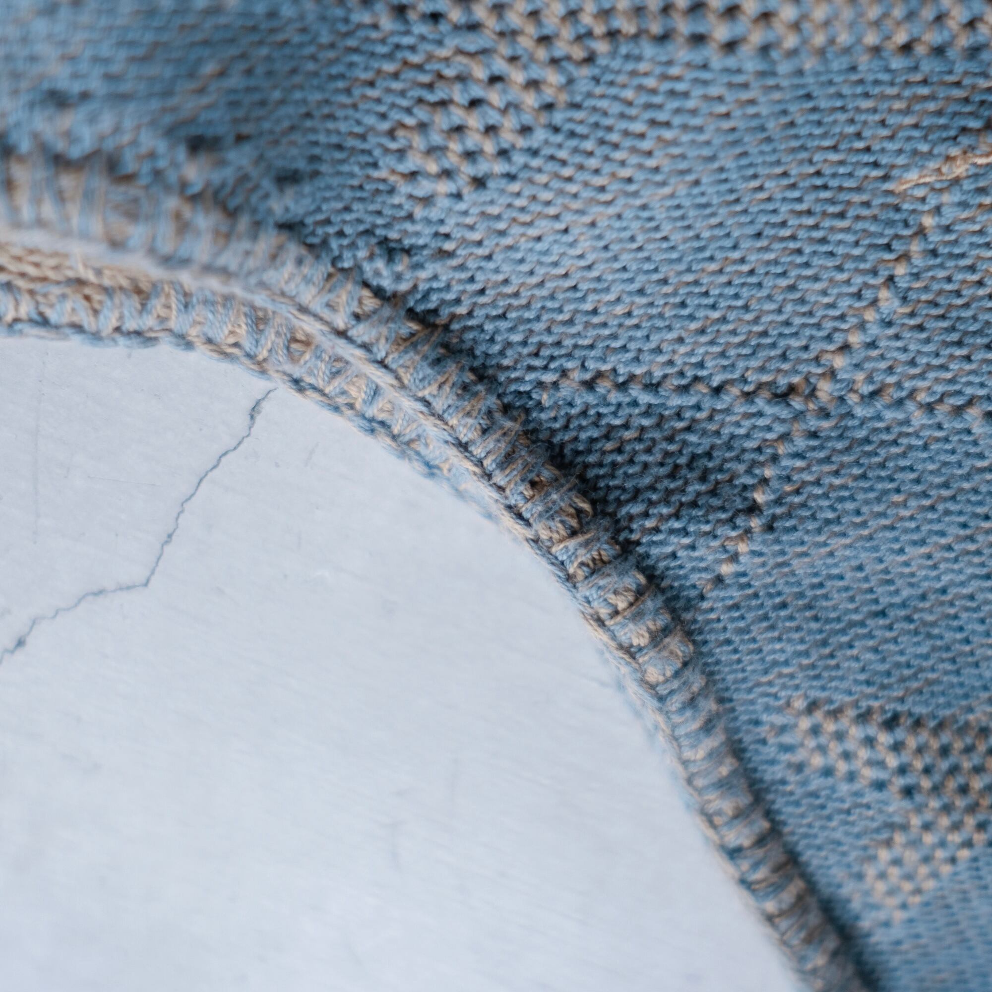 ライトブルー×ベージュの配色は、このブランドのバックボーンを感じさせない柔らかな仕上がり。