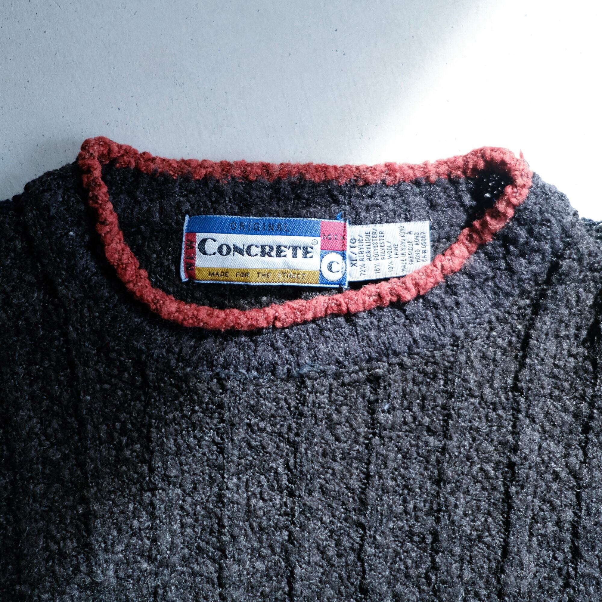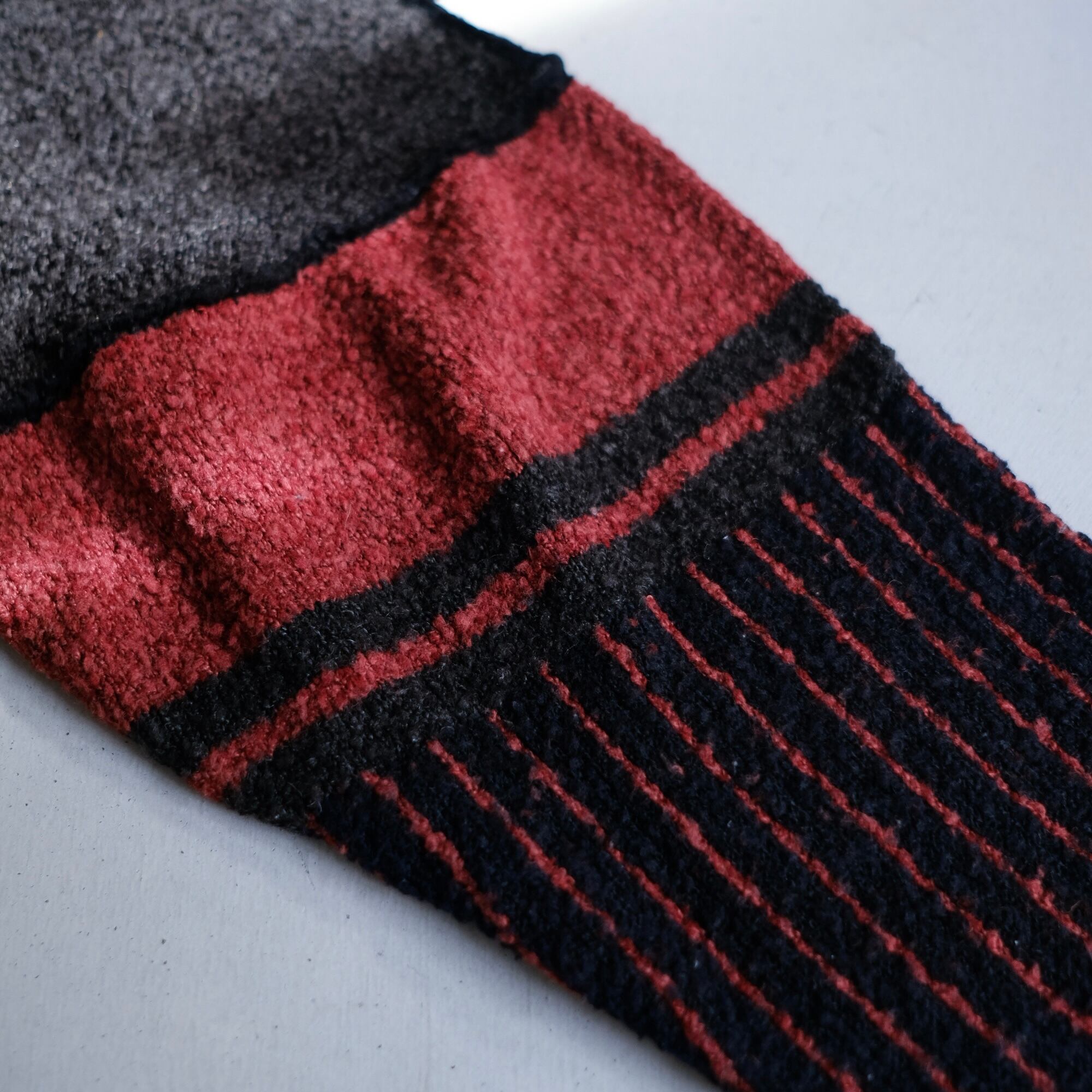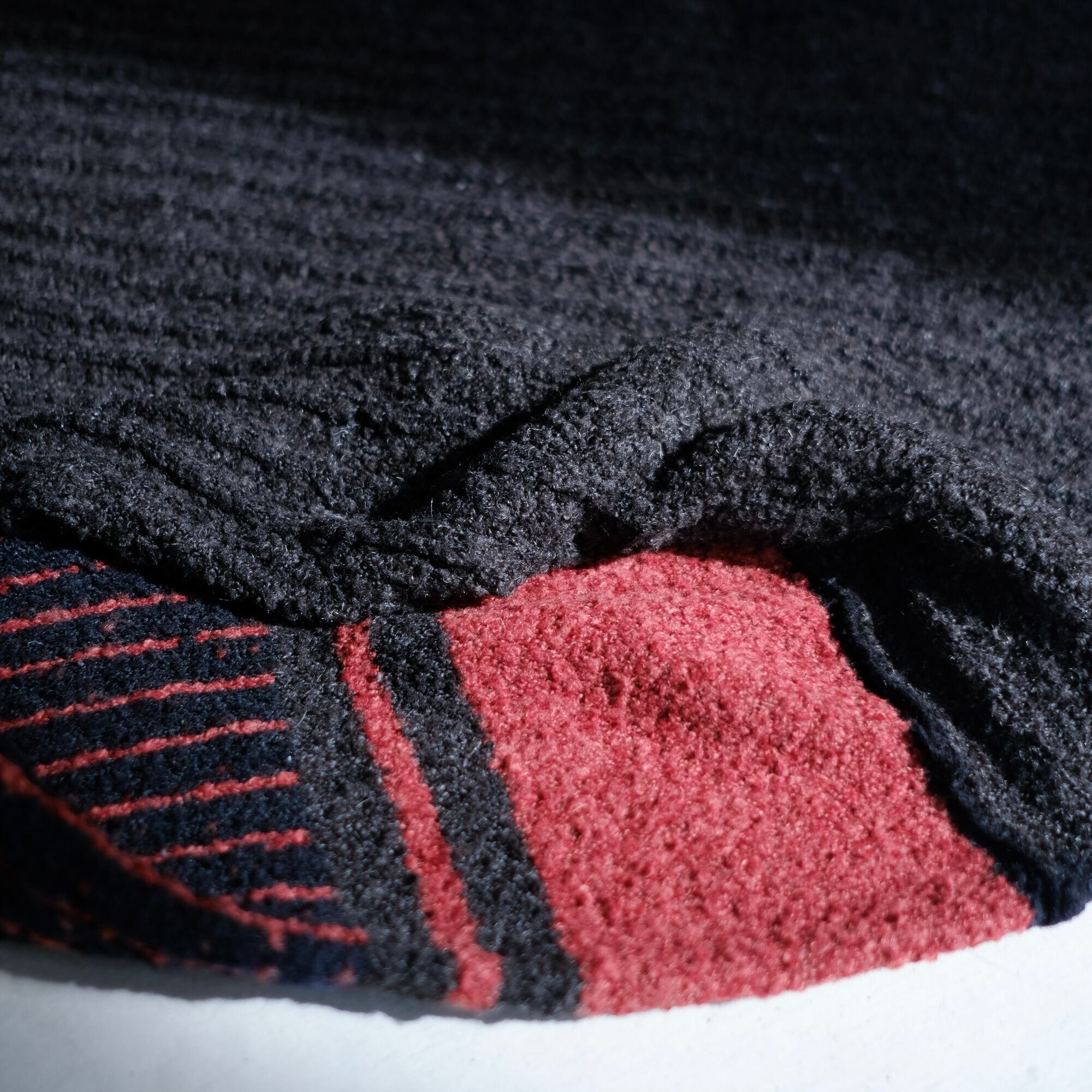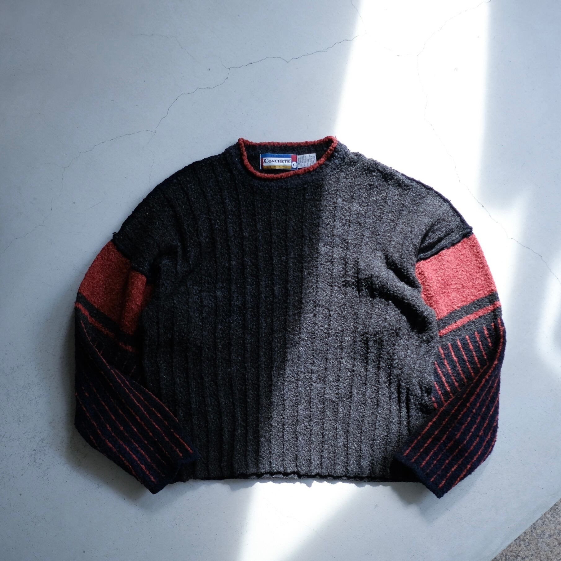 インサイドアウトのような肩のシーム、各パーツごとに編み地やカラーリングが変わるユニークなデザイン。