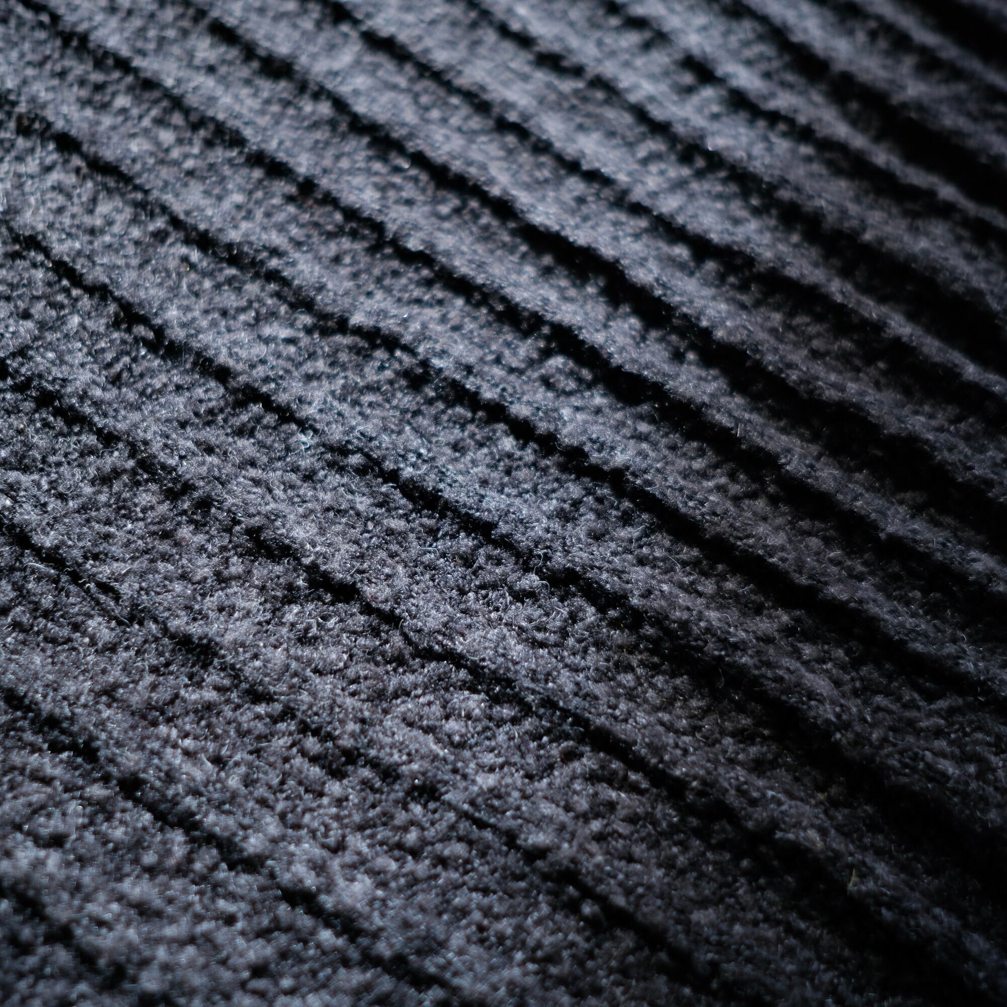 首元のロールネックやアームに散りばめられたレッド、よく見ると肘下からはネイビーに切り替わるディテール。