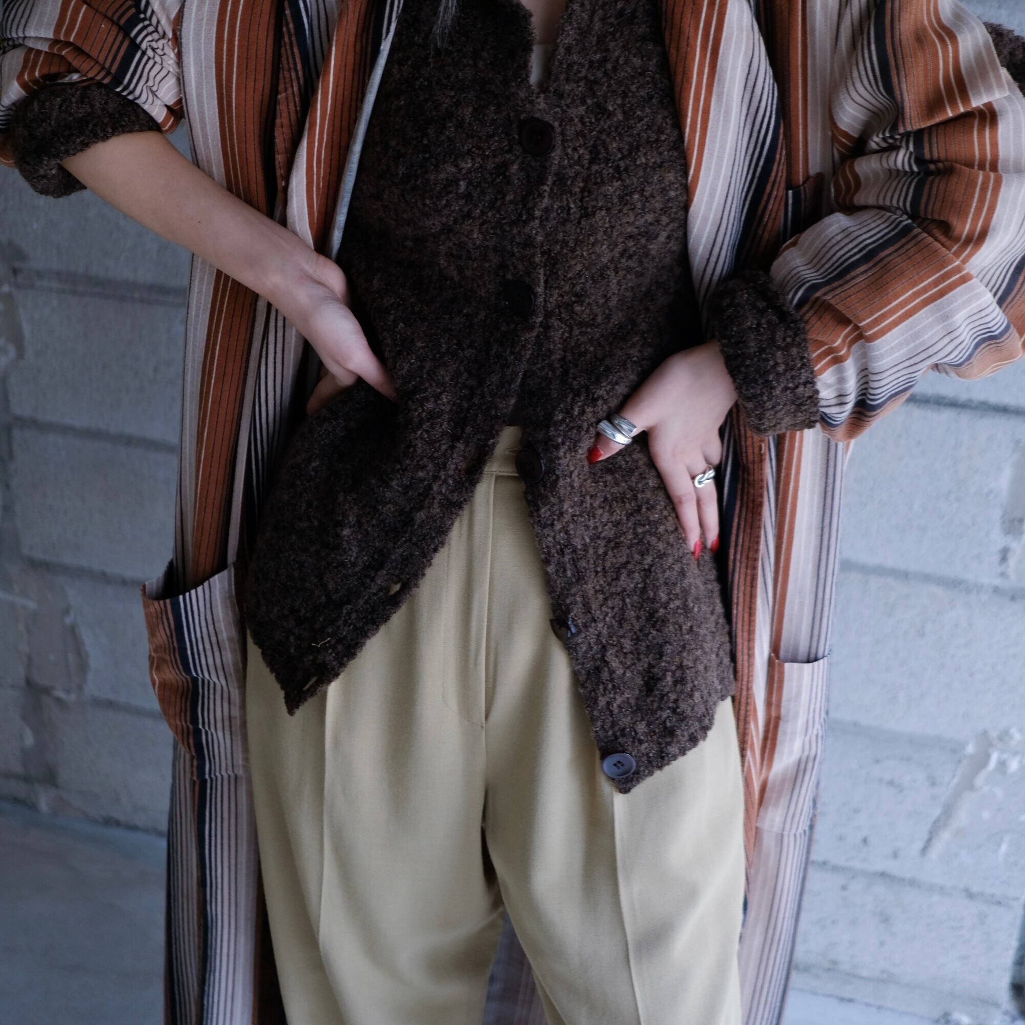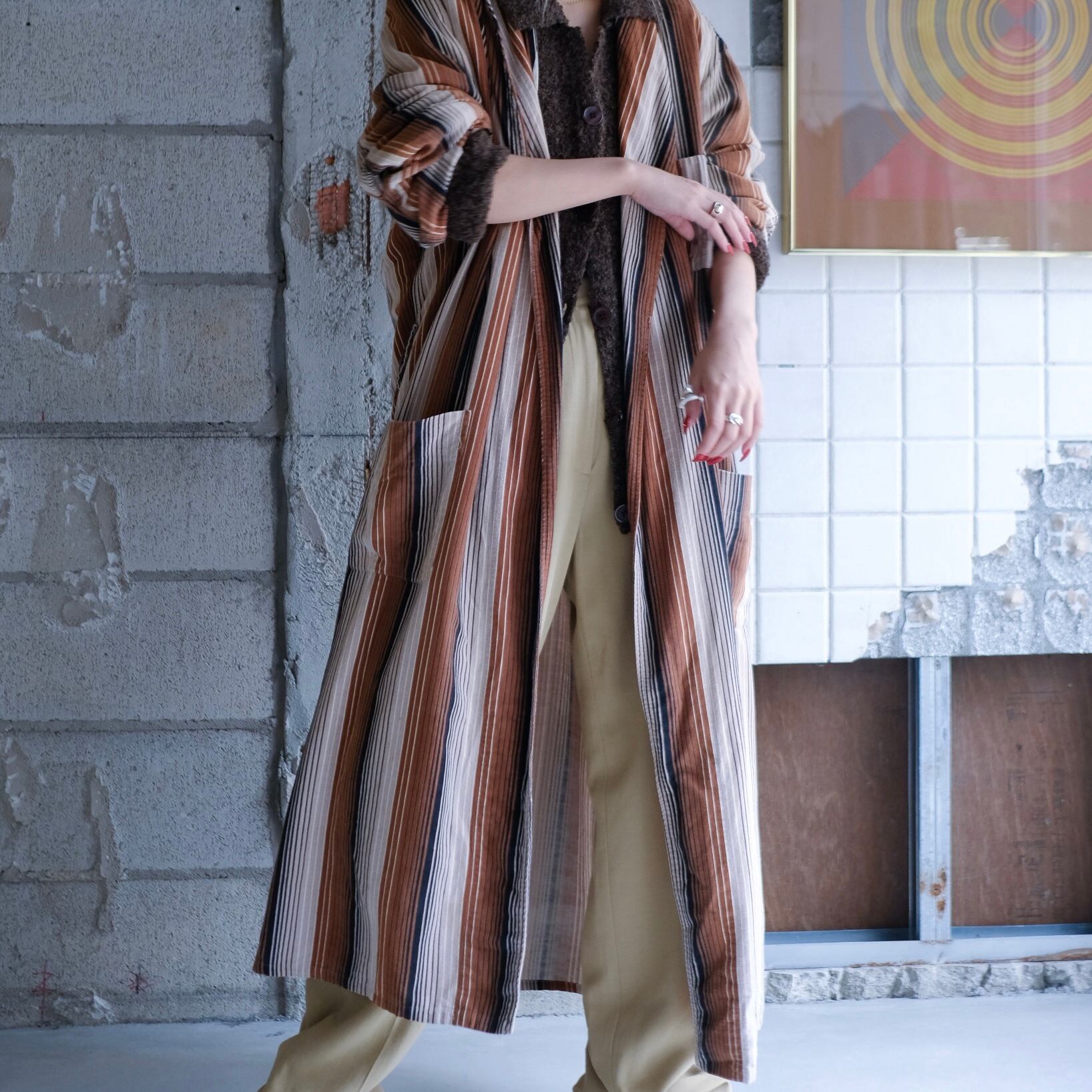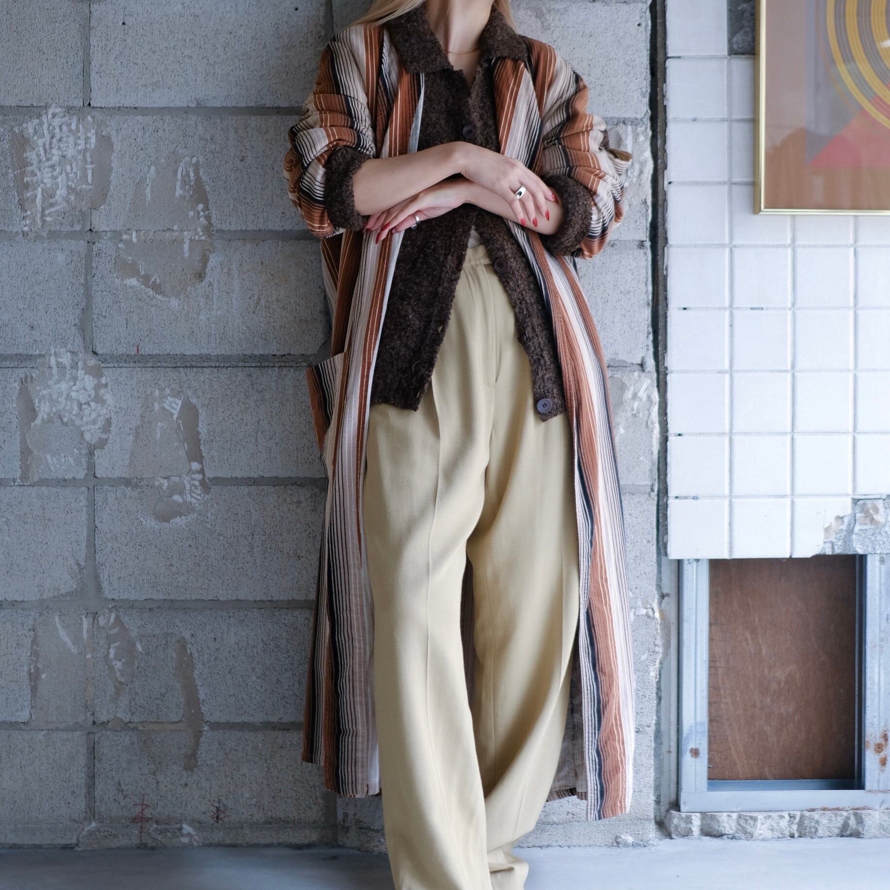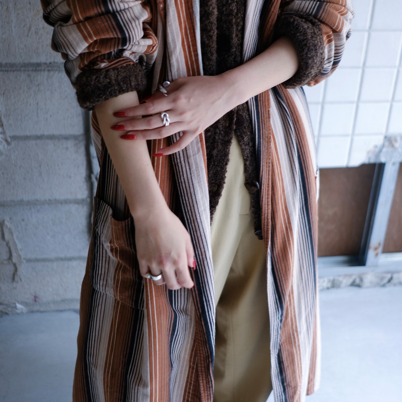 1950年代頃のヴィンテージのコットンロングガウン。洗い込まれ柔らかくなった起毛感のあるフランネル素材は肌馴染みが良く、配色が美しいオンブレストライプ柄はスタイリングに馴染みやすい。