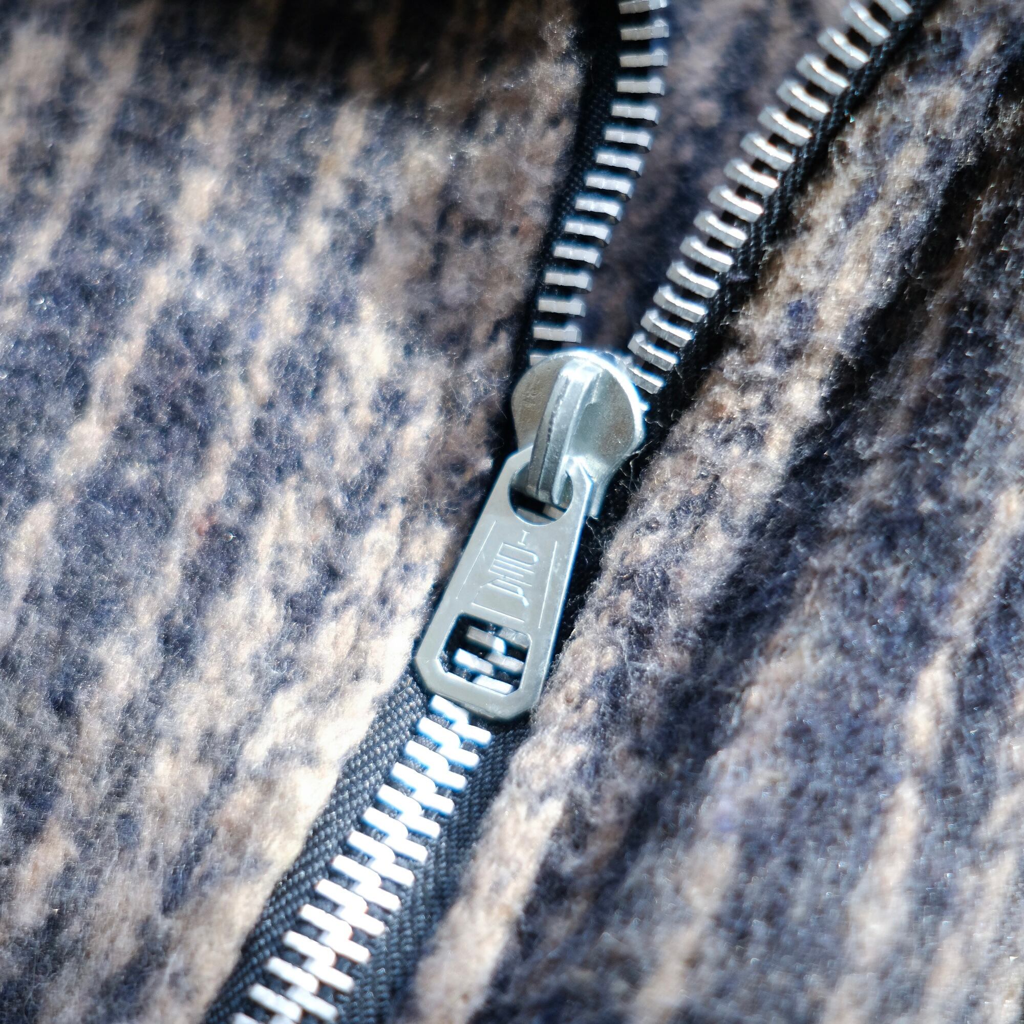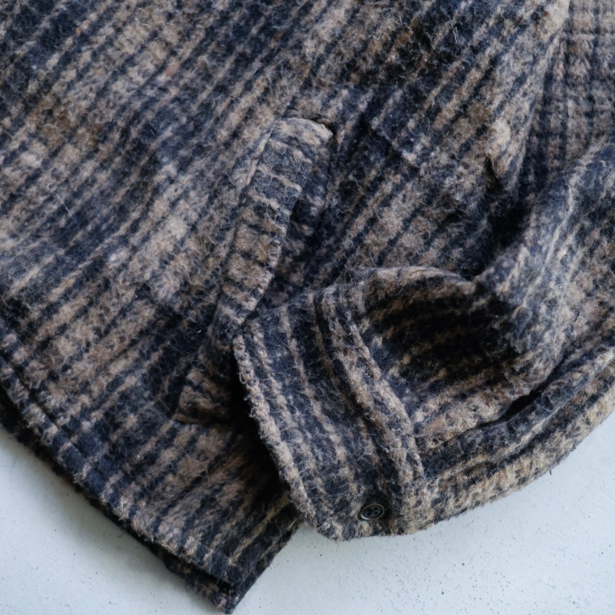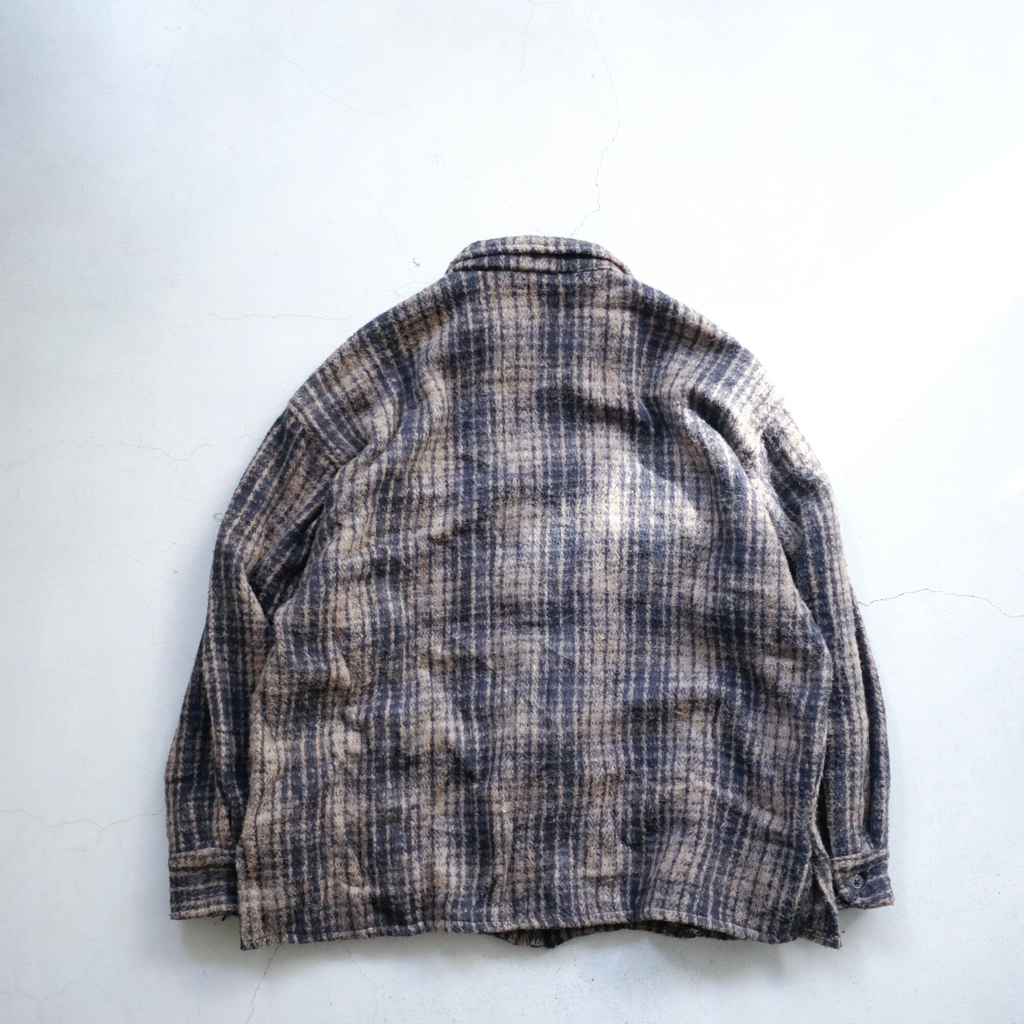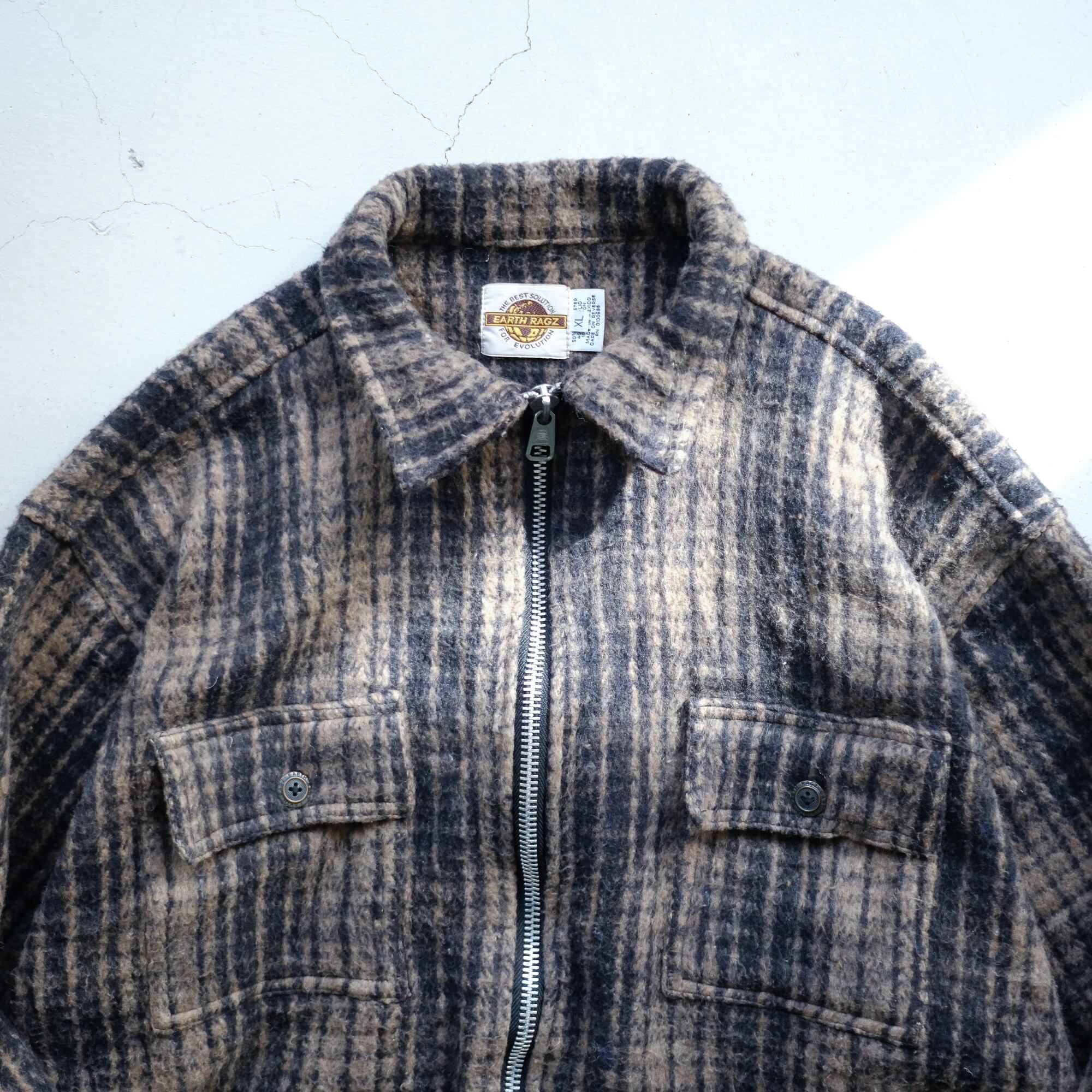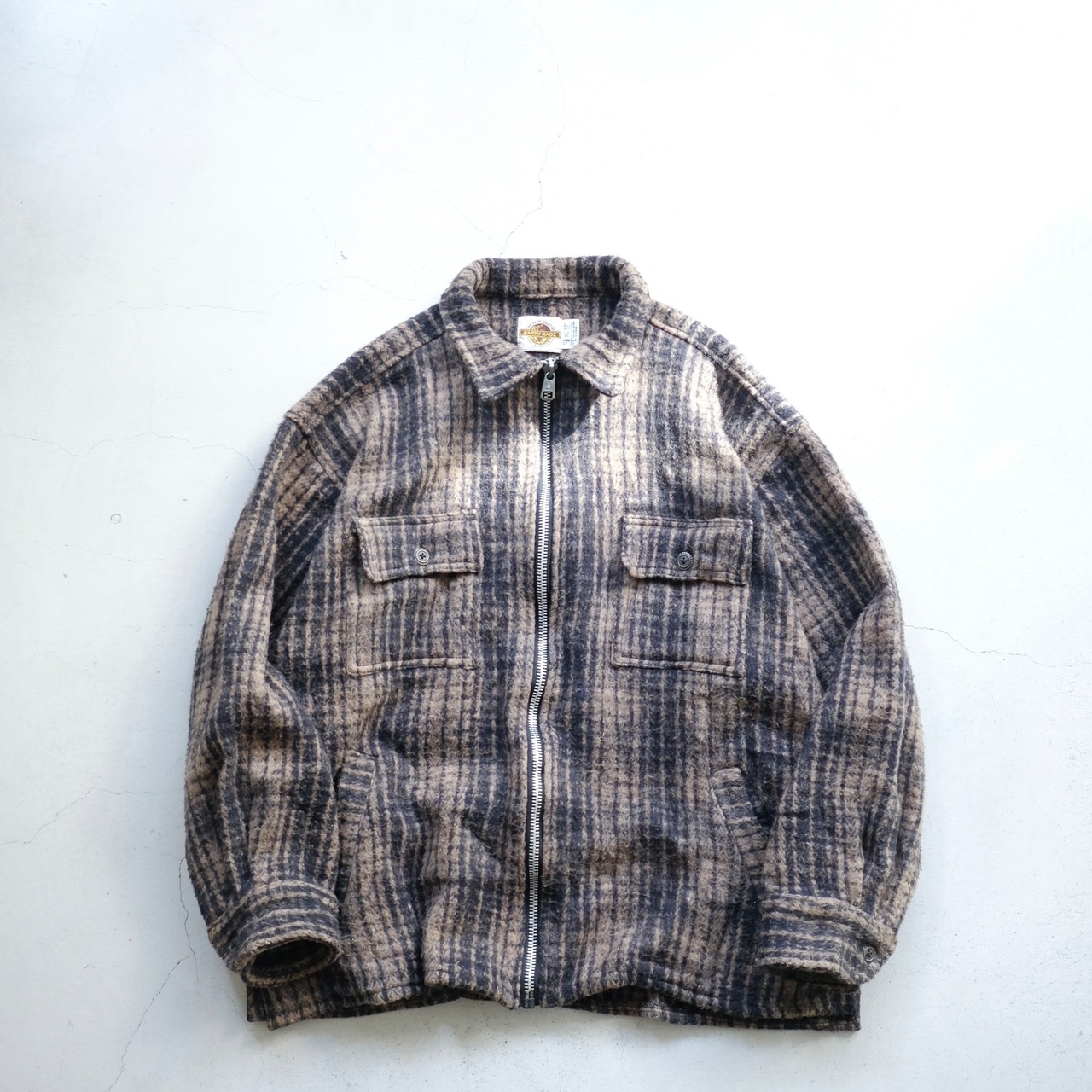 不規則なブラウンとブラックのラインで構成されたジップアップタイプのシャツジャケット。