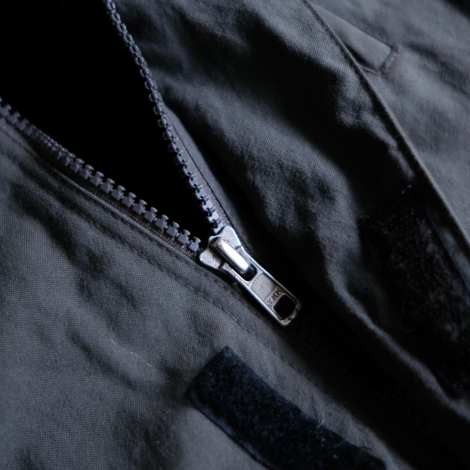 特徴的なスタンドカラーに、胸元にはジップポケット。フロントのフラップポケットにサイドのハンドウォーマーポケットなど気の利いたディテール。