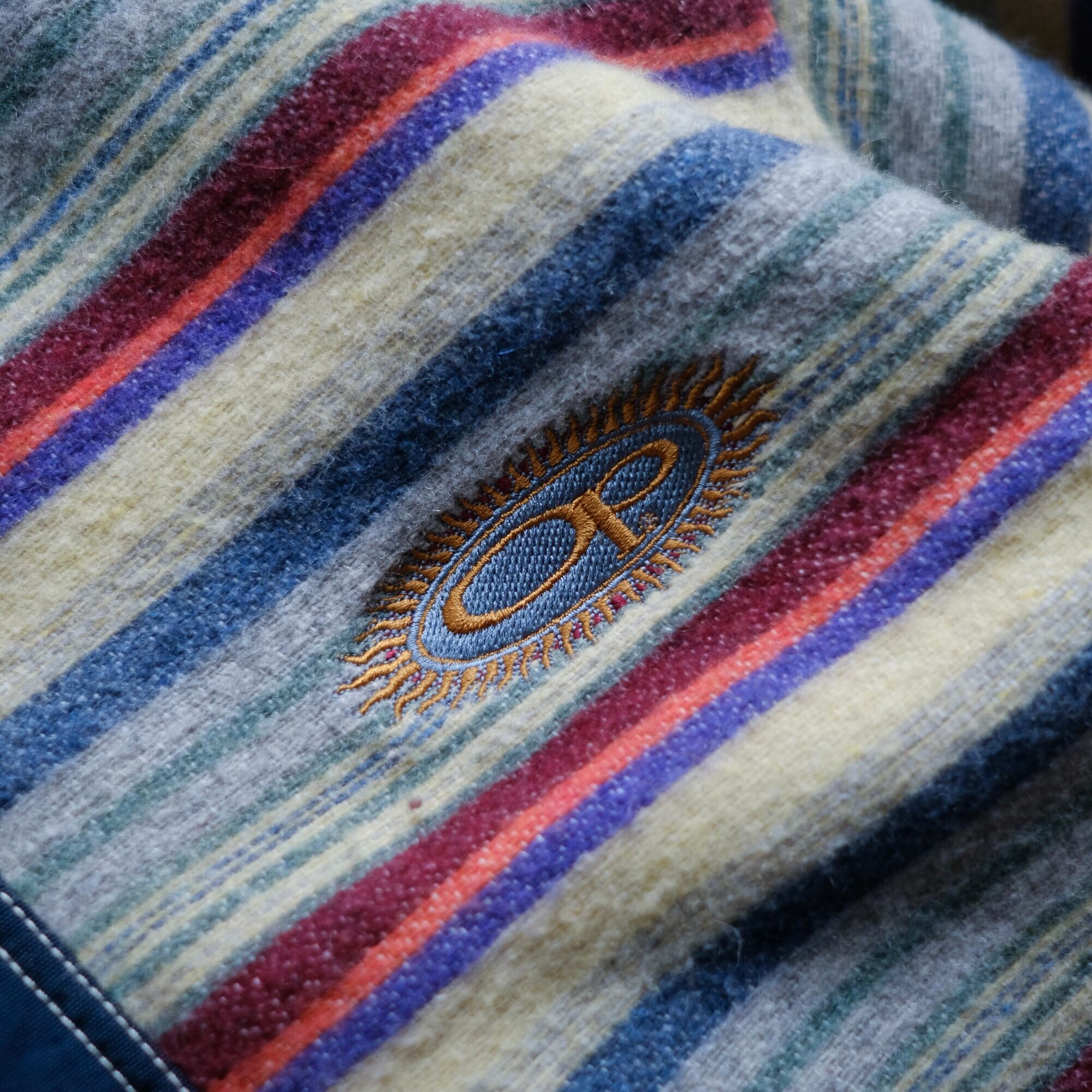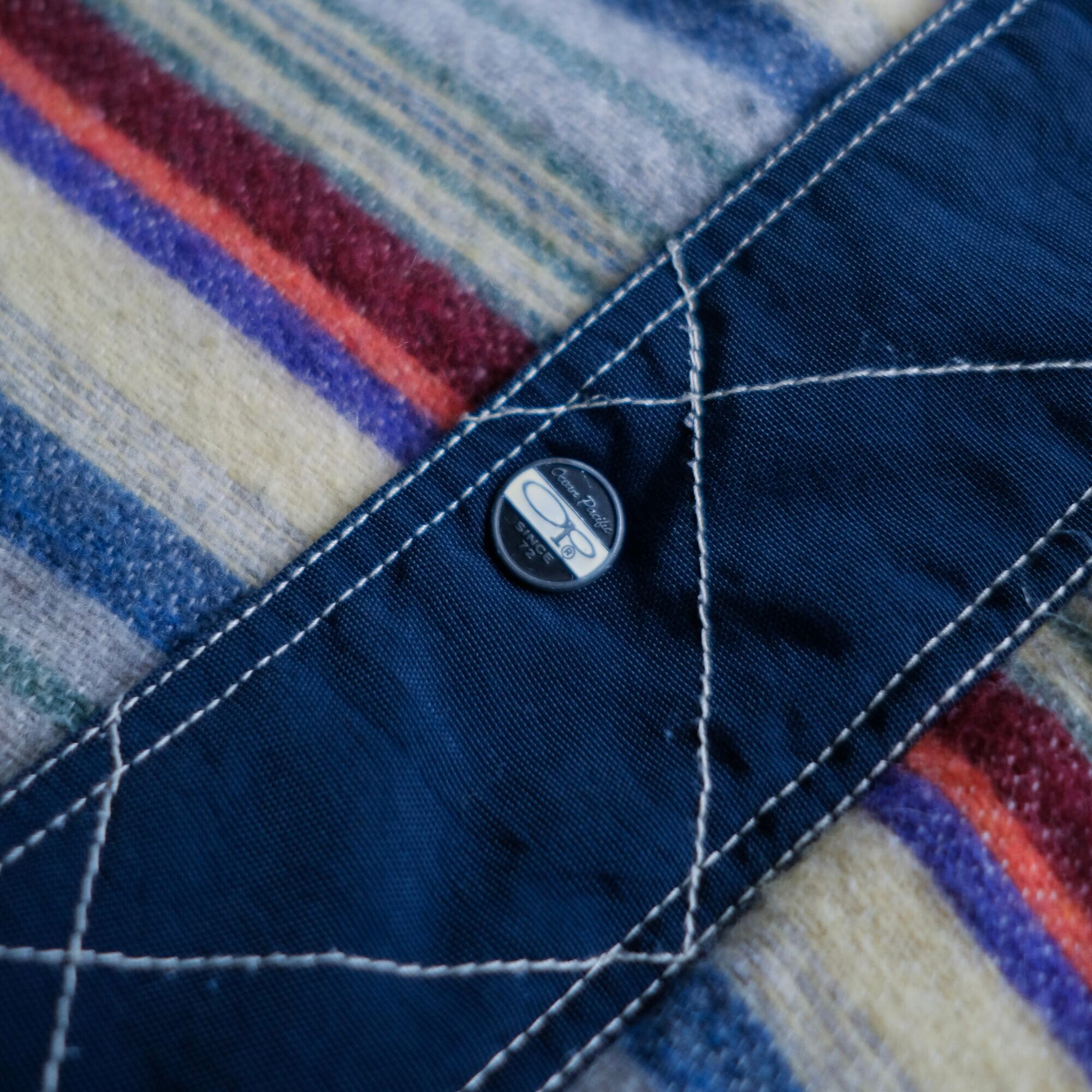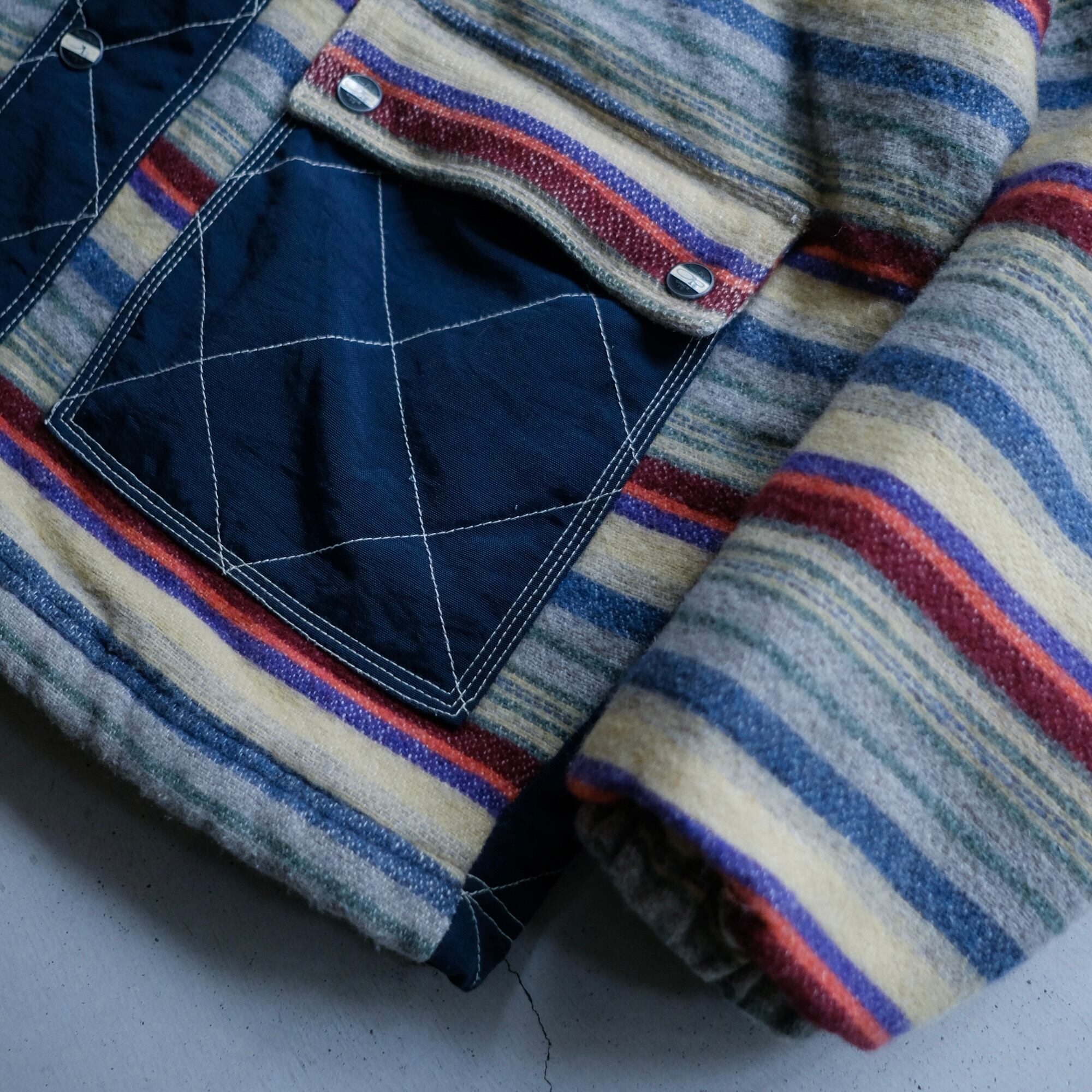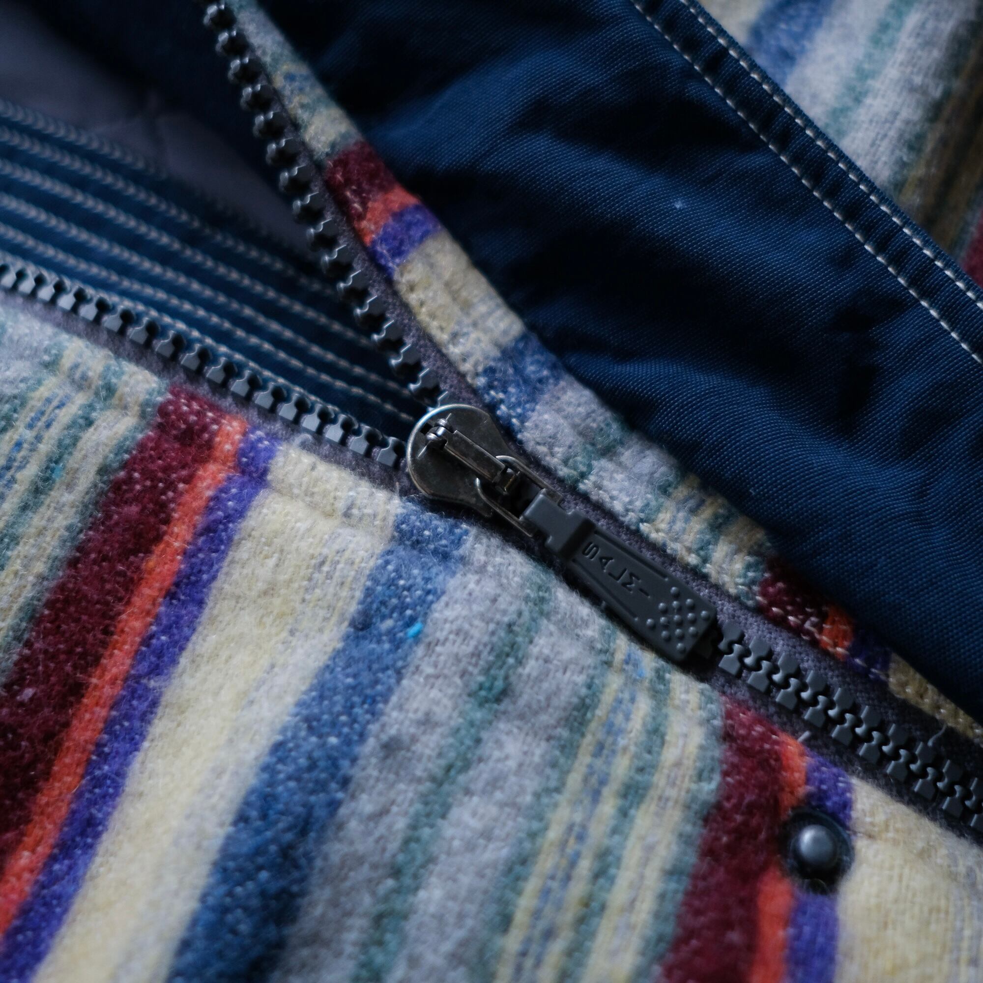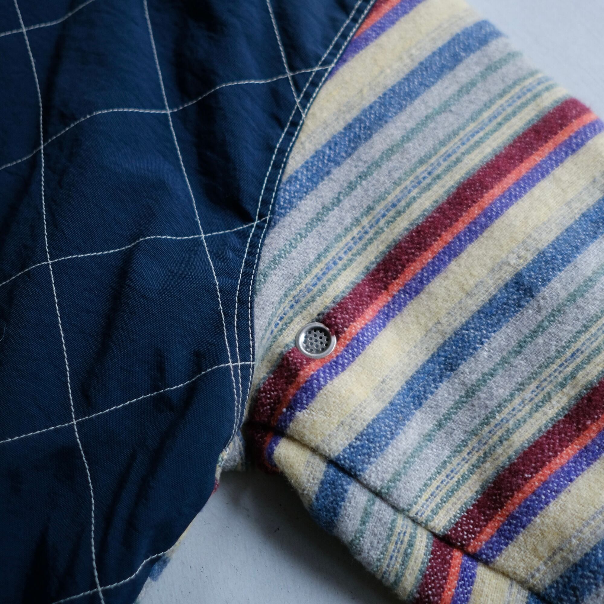 ブランケットのようなマルチボーダー柄のウール素材とナイロンキルティングの切り替えの絶妙なバランス。