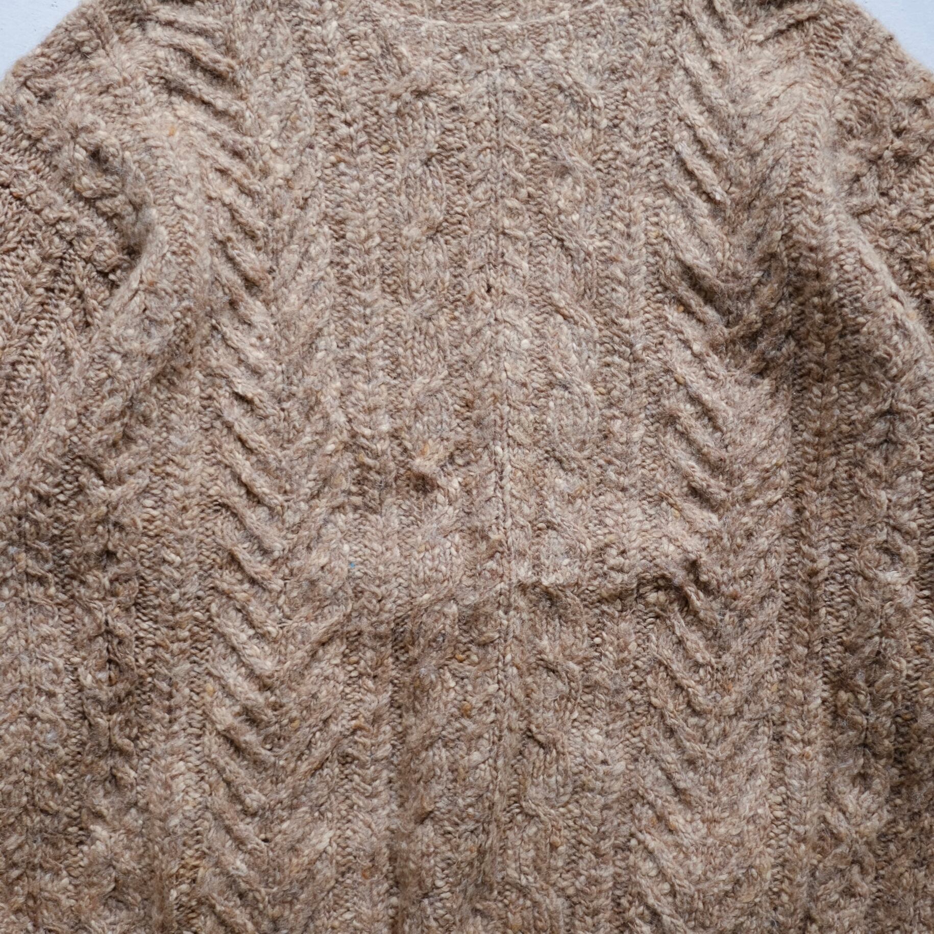 首元のリブが排除されスッキリとした印象のケーブル編みニット。