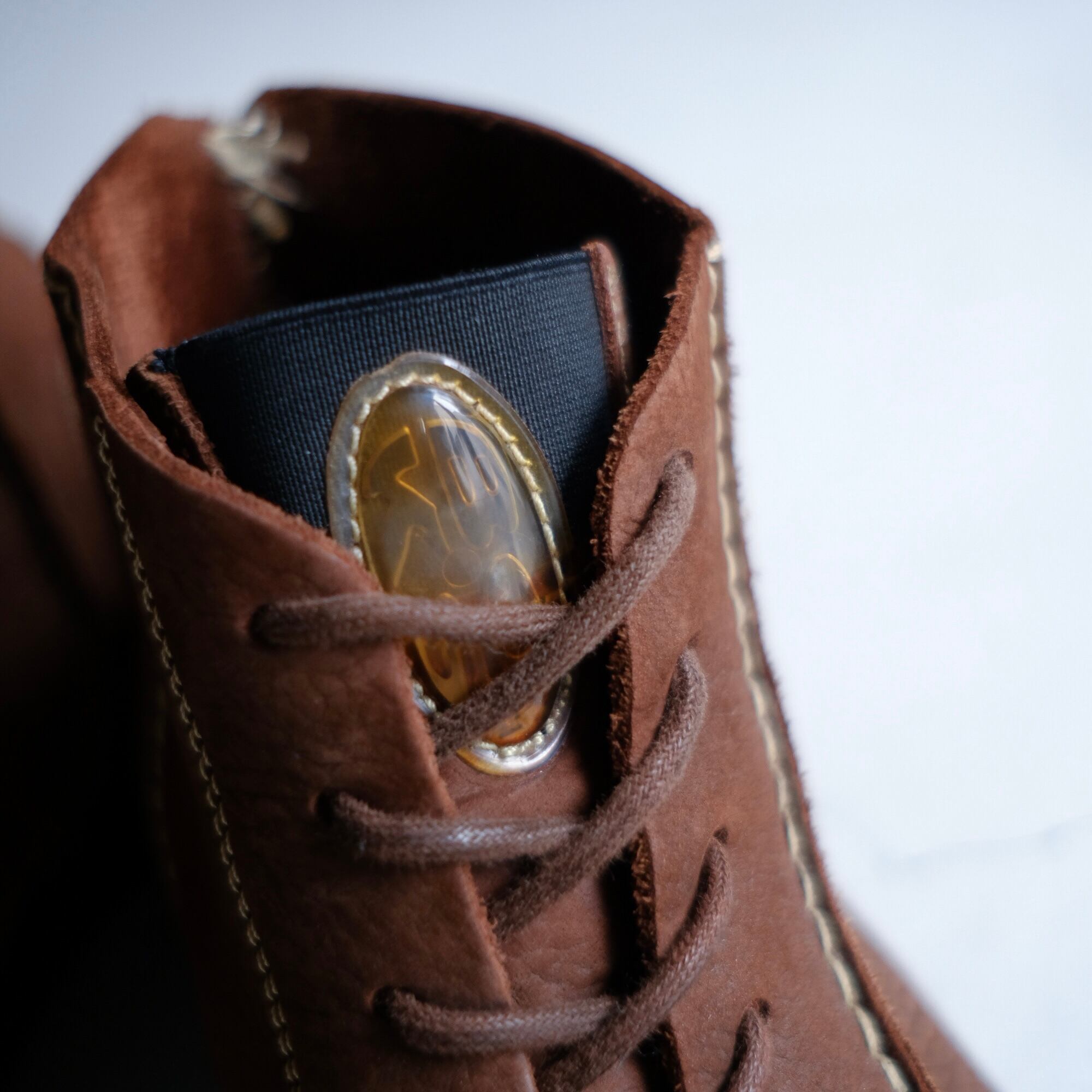 アッパーを包み込むのようなアシンメトリーのデザインや大胆なステッチワーク。