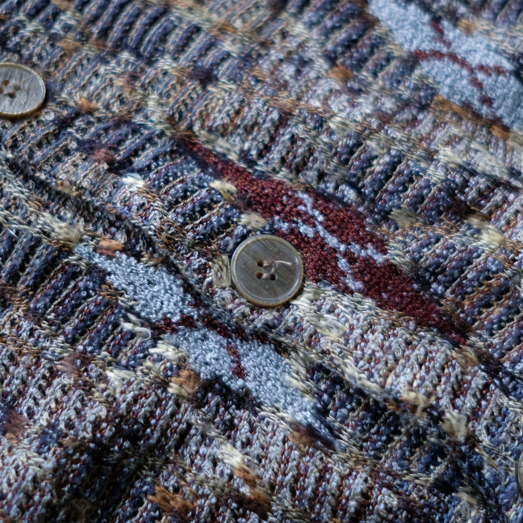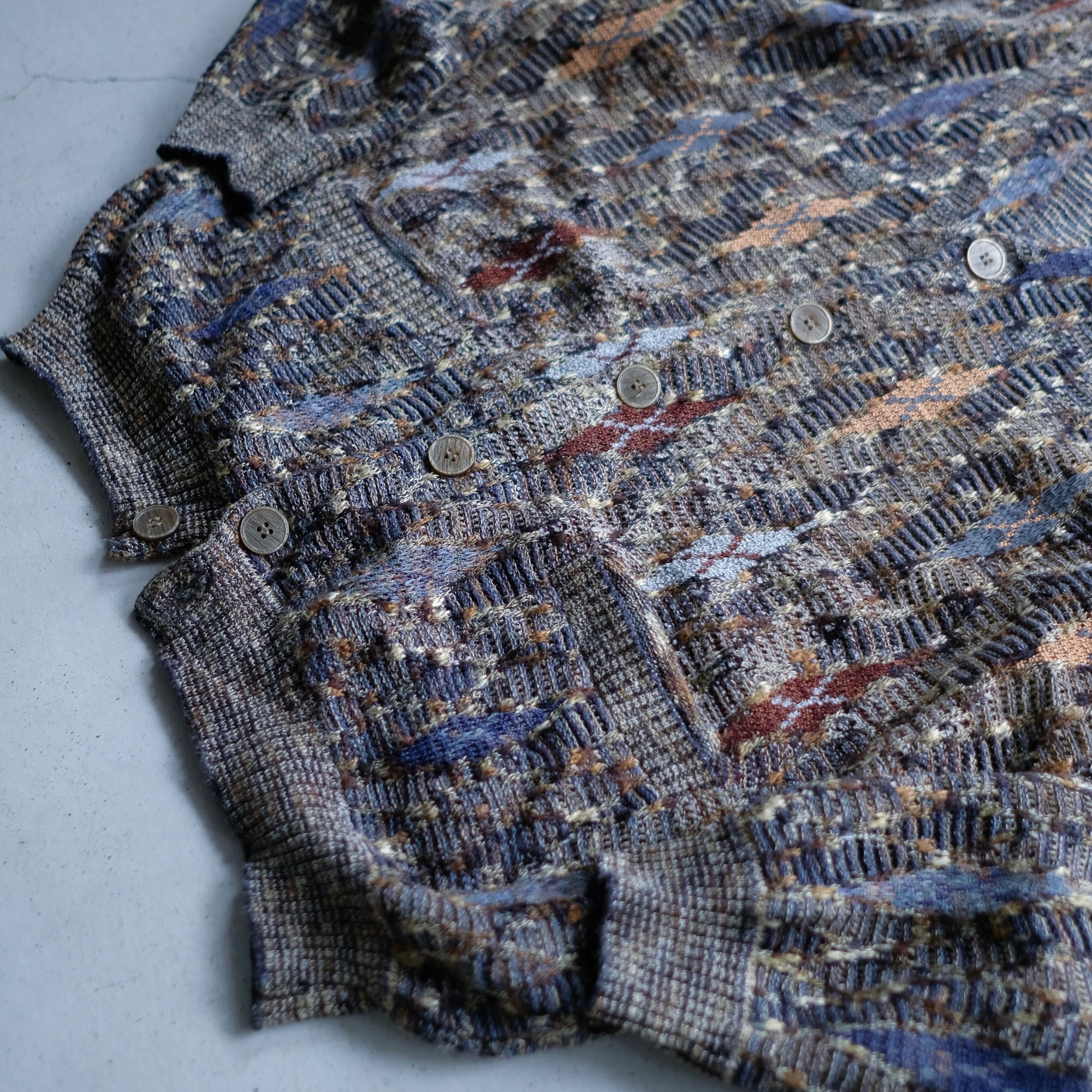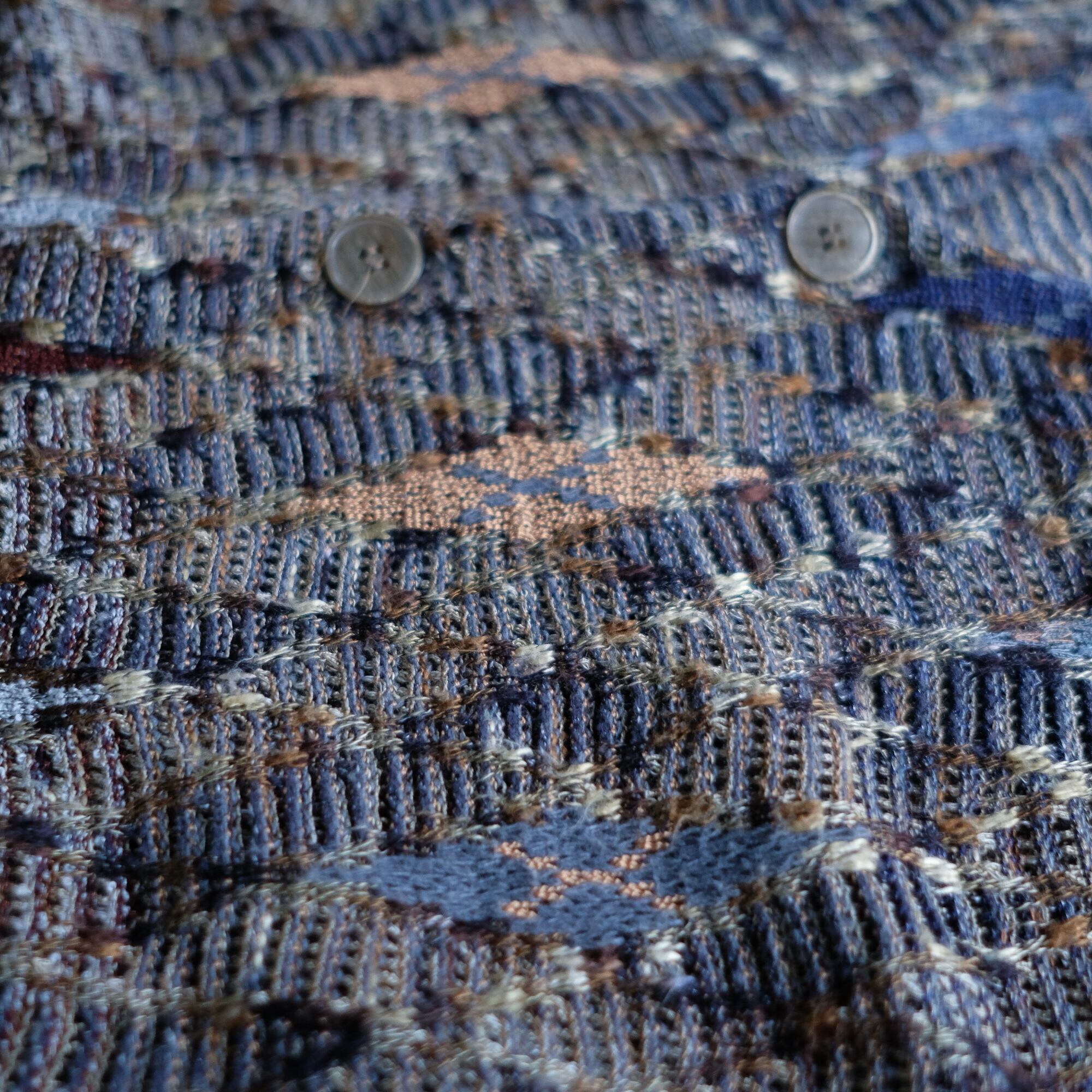 多色の糸を使用しザックリとした編み地で編まれたコットンカーディガン。